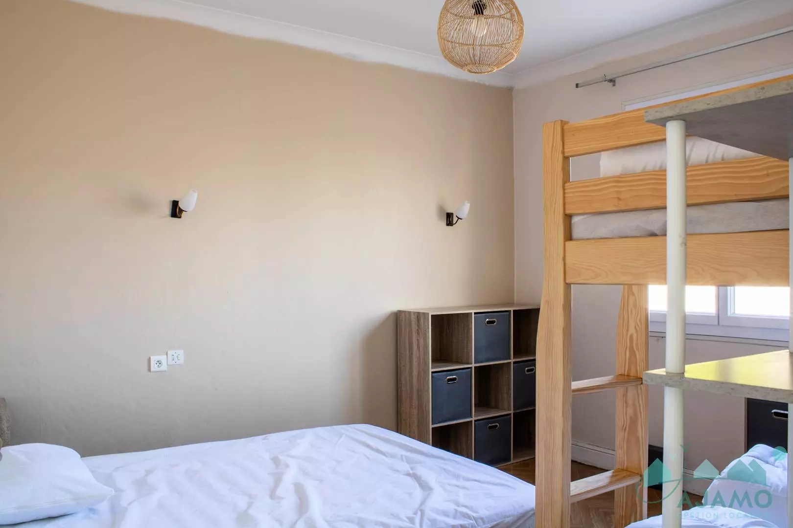 - A bedroom with a classic double bed (140x190cm) as well as two single bunk beds (90x190cm);