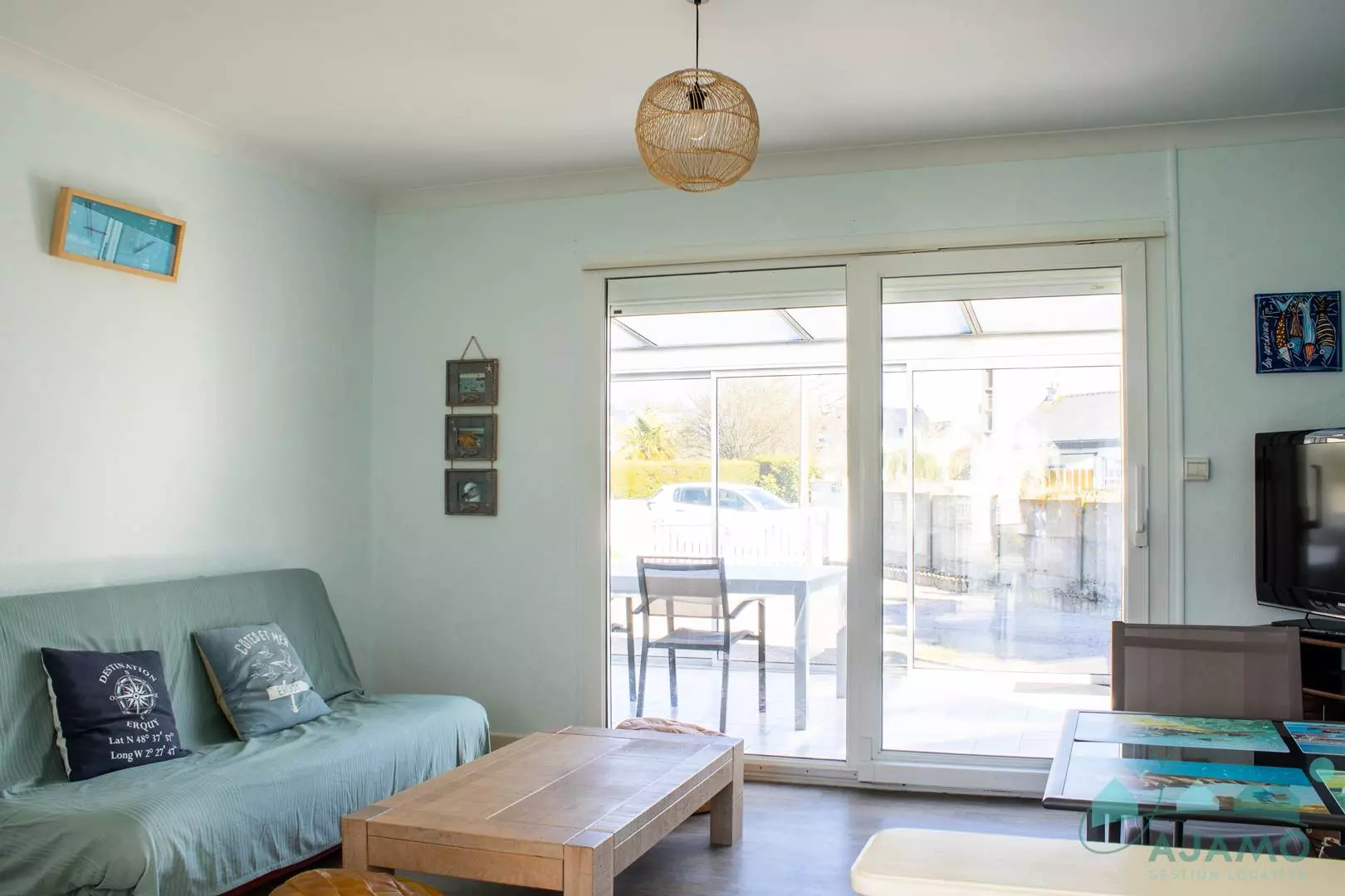 - a living room with sofa, armchairs and television with direct access to the veranda and the kitchen;