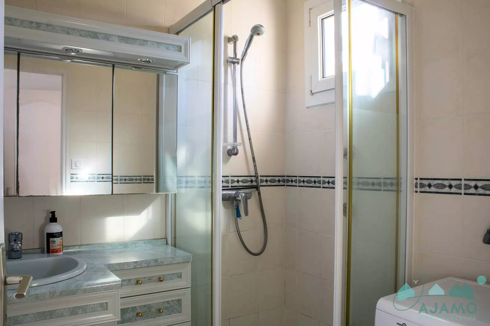 - A bathroom with shower and a vanity unit;