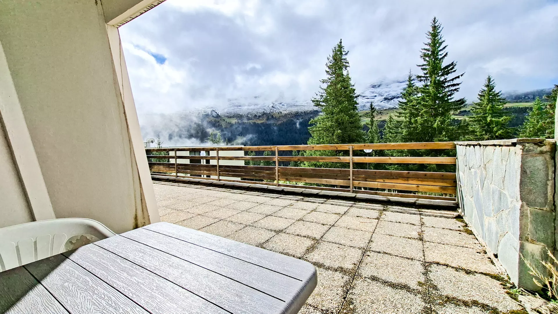 Studio + comfort cabin 25 m2 on the raised ground floor with large south-facing terrace and a magnificent view of the ski area.