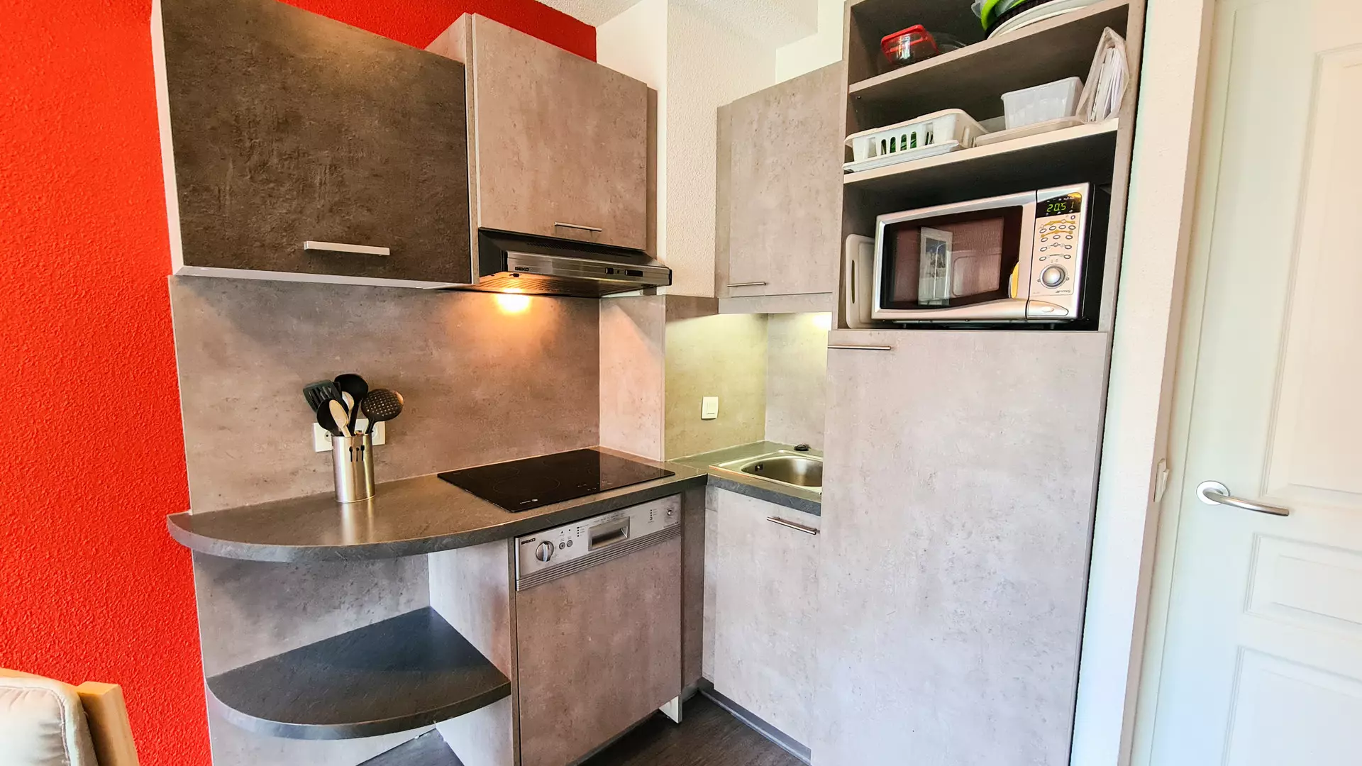 - Open kitchen with ceramic hob, dishwasher and microwave