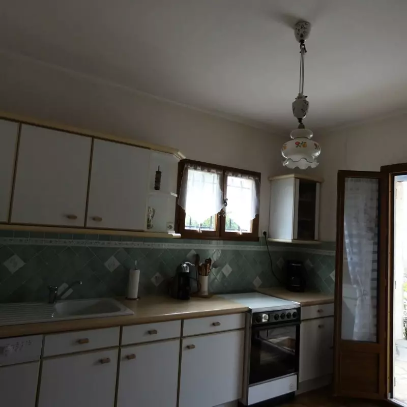 The house is charming and features a large courtyard and a beautiful terrace equipped with a table and chairs, so you can enjoy sunny days dining in the sun. The accommodation is fully equipped and is perfect for a tourist stay with friends or family. It has three bedrooms, one with a double bed, one with two single beds, and one with a sofa bed. In total, the accommodation can accommodate six people. The large courtyard also offers parking for two cars. The house is quiet and offers a perfect setting for a family getaway.