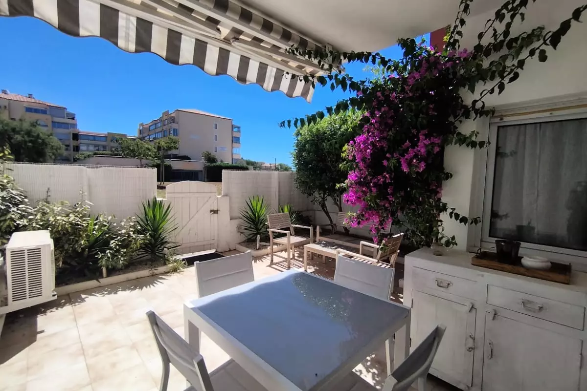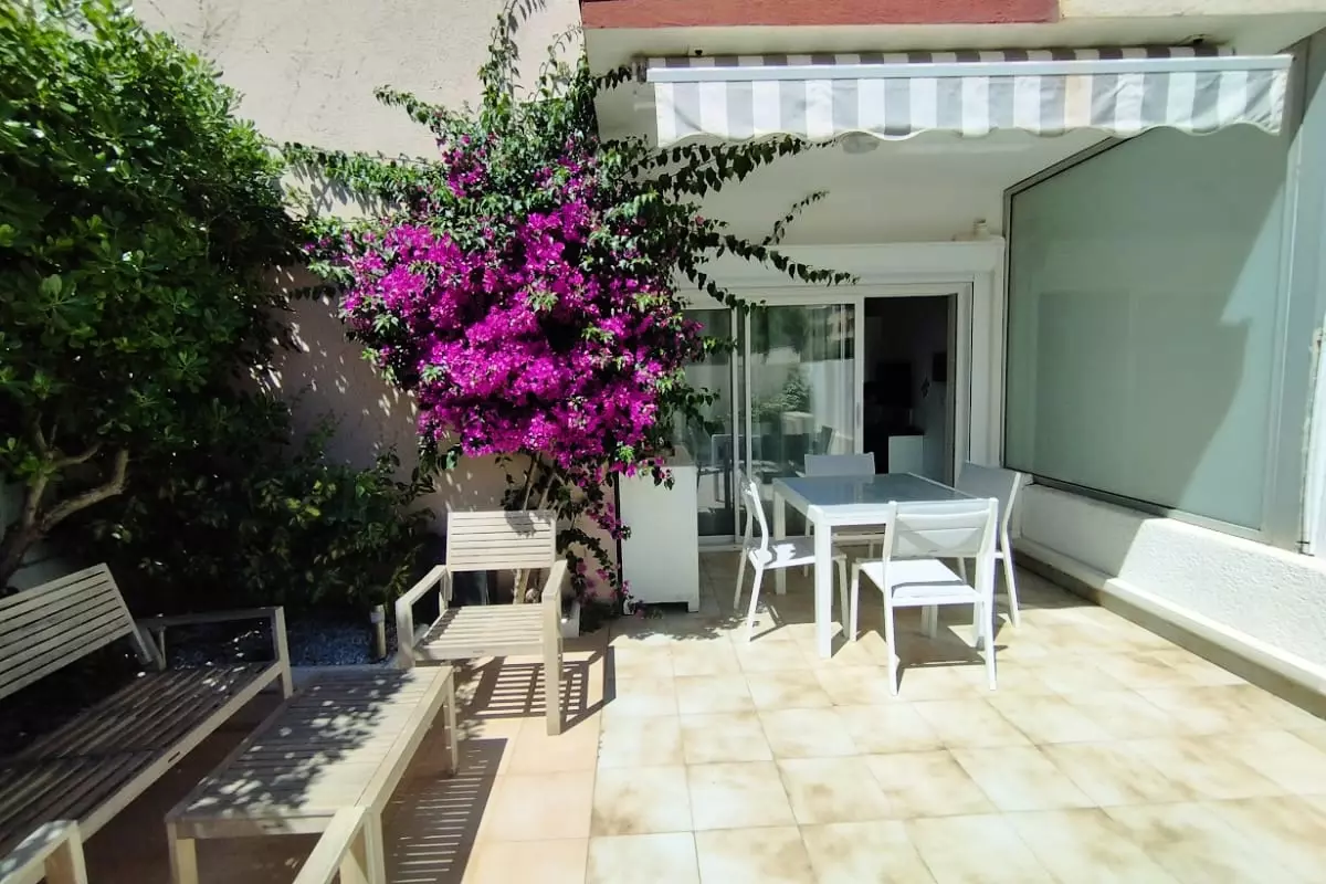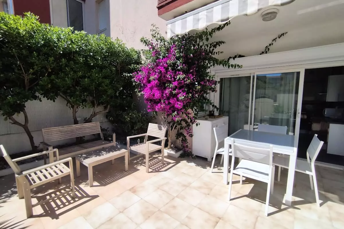 Relax on the patio of this quiet and elegant ground floor apartment. Air-conditioned and refurbished, this apartment is ideally located for walking to the beach or strolling along the marina. Plus, there is a private parking space.