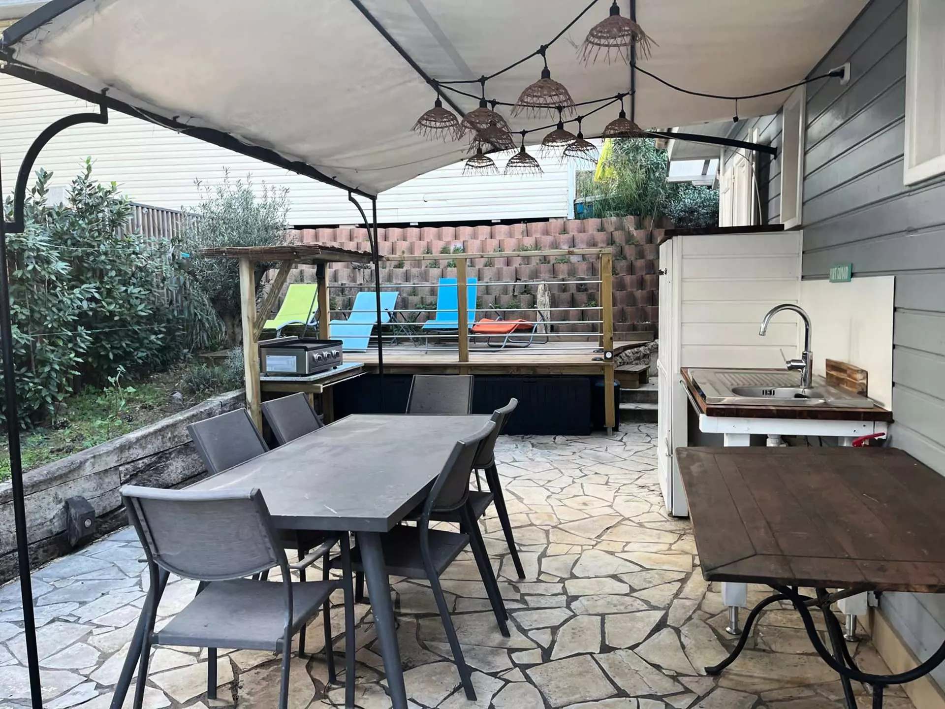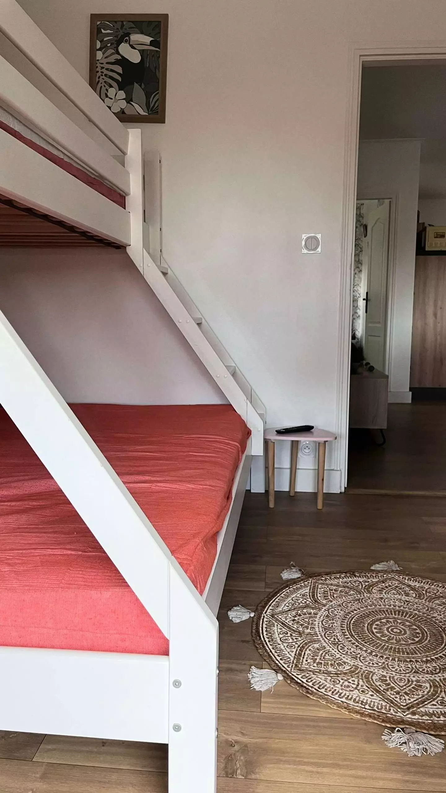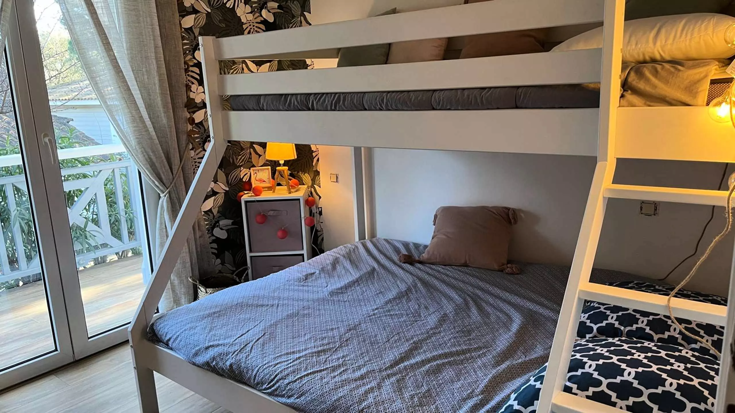 This chalet of approximately 50 m2 has a beautiful equipped kitchen with a pantry opening onto the living room and a dining area, a pleasant 15m² terrace, and 2 bedrooms, one with a double bed (160), and one with a single bed bunked over a double bed (140). You will have a bathroom with WC.