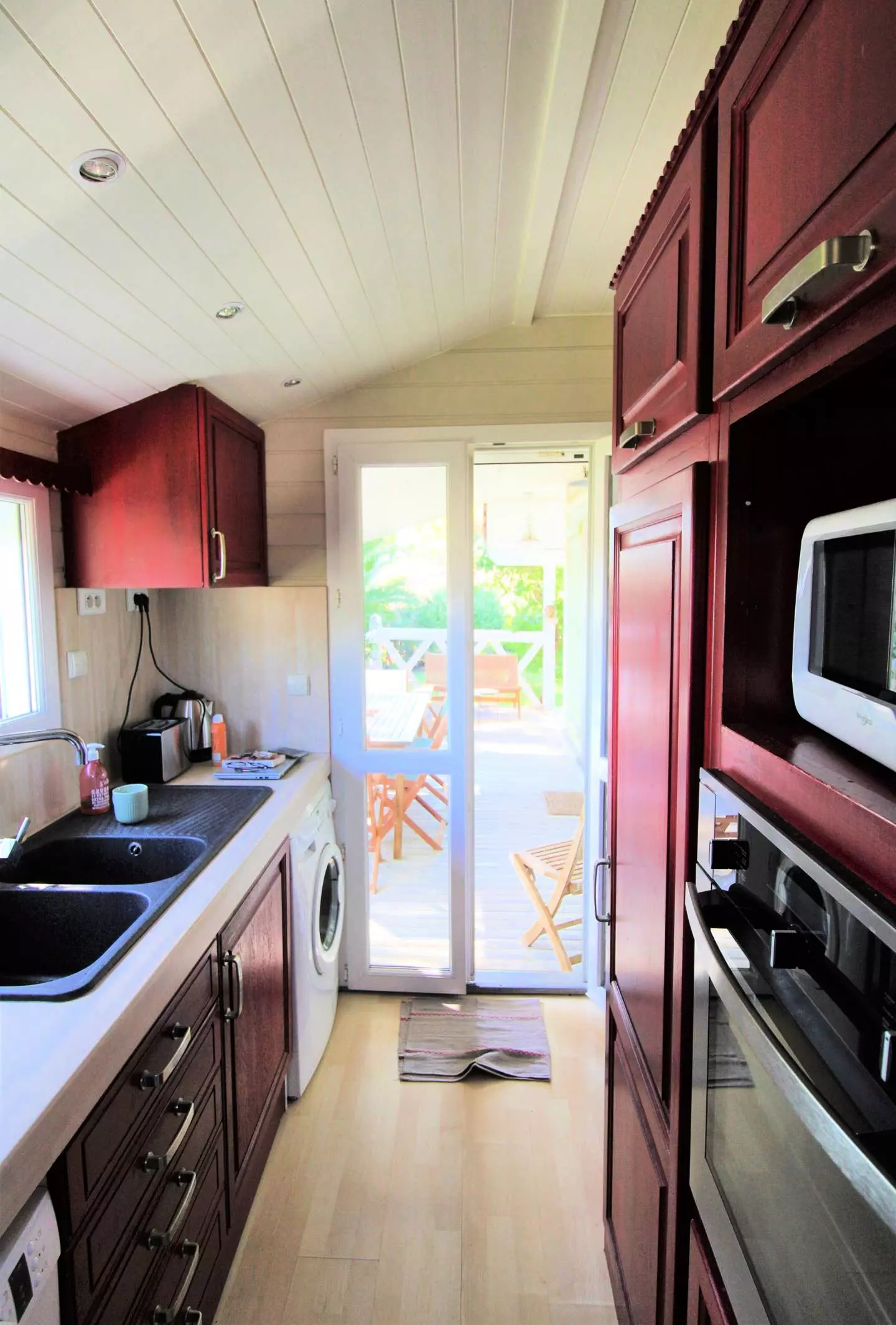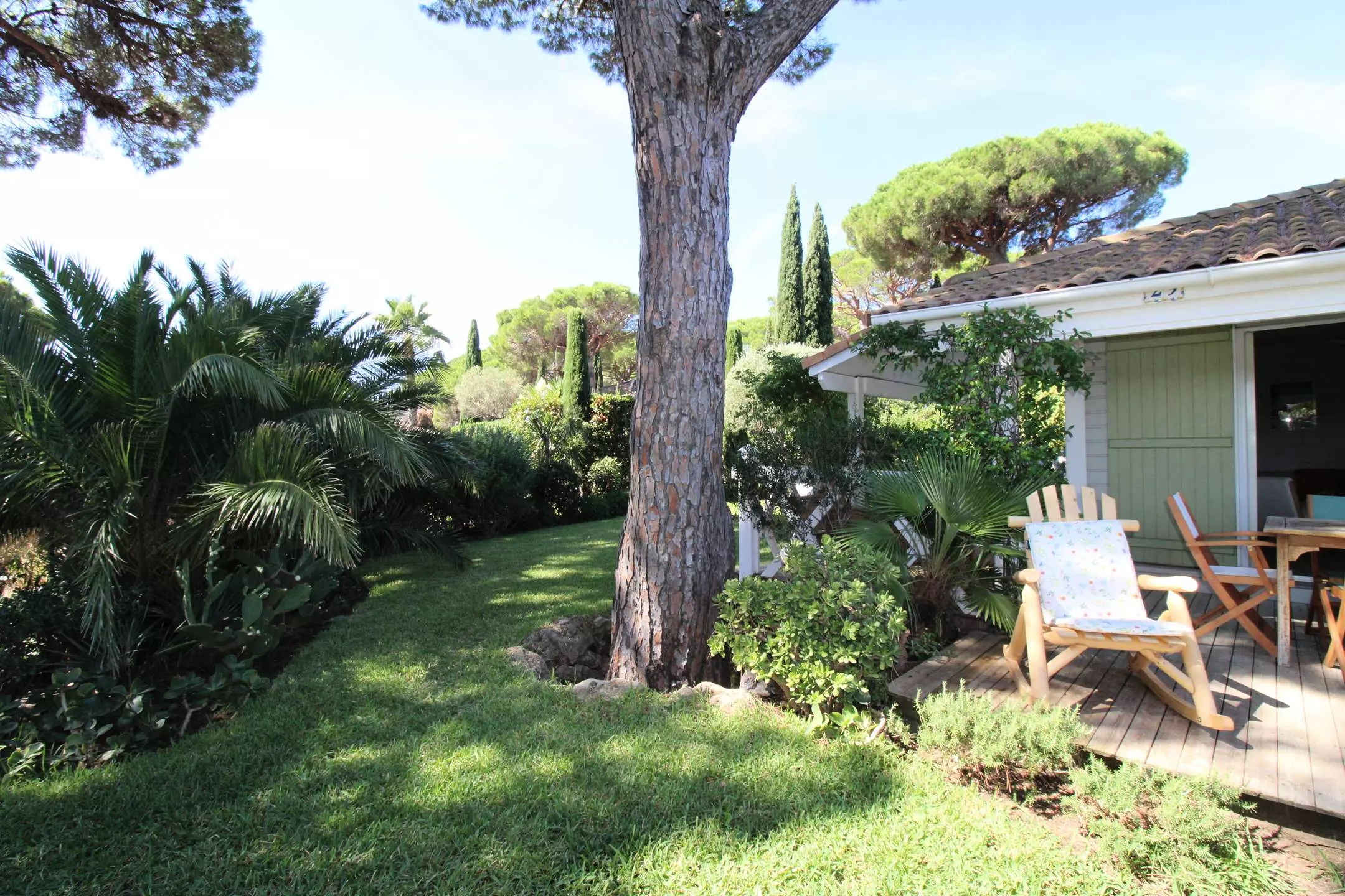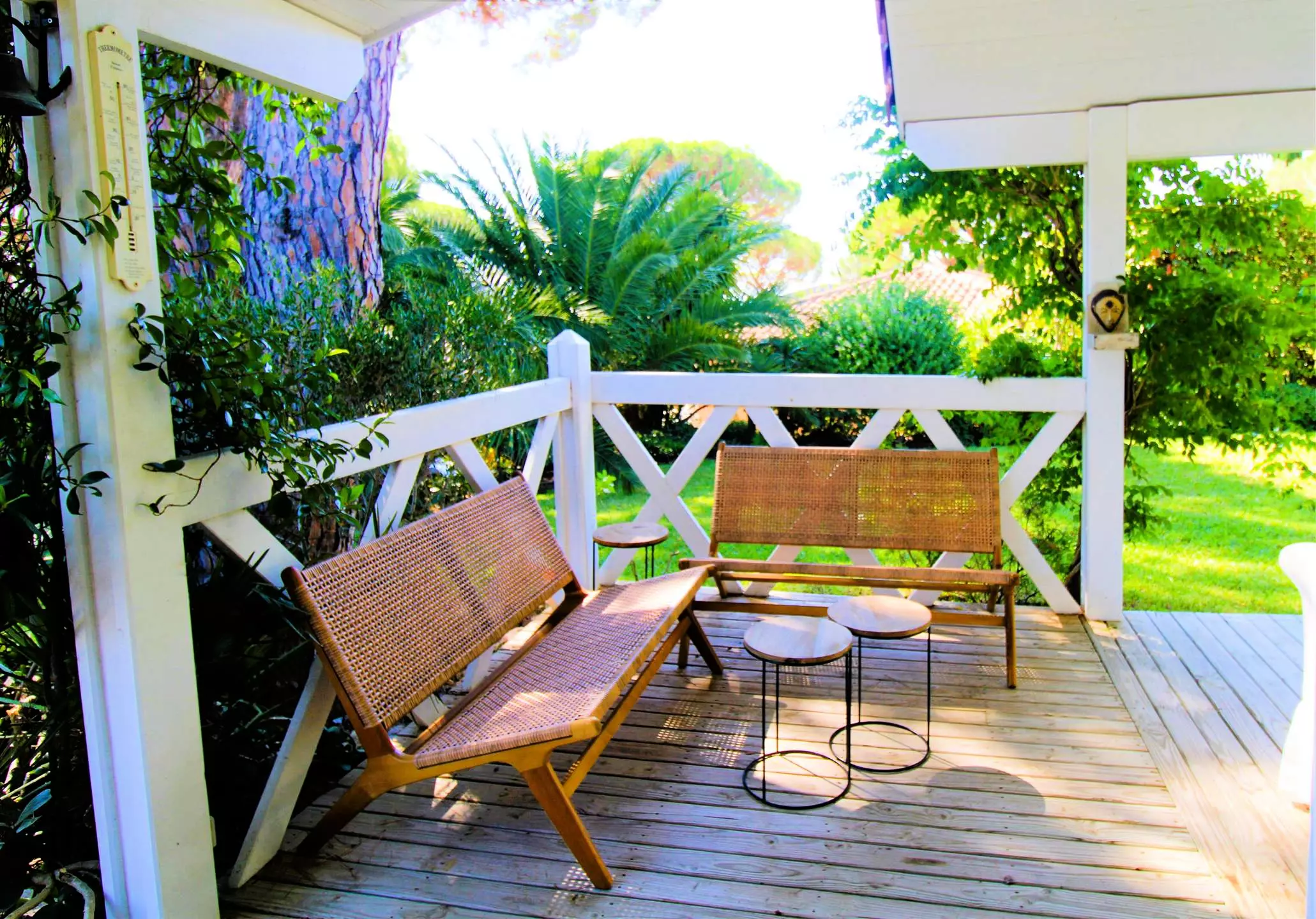 The chalet, approximately 60 m², is surrounded by a beautiful wooden terrace and a carefully maintained Mediterranean garden, with a small sea view. You will find garden furniture, a dining area, deckchairs and a breathtaking view between the sea and the pine trees.