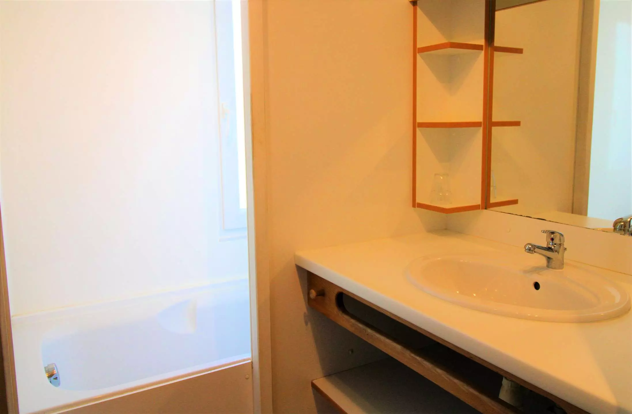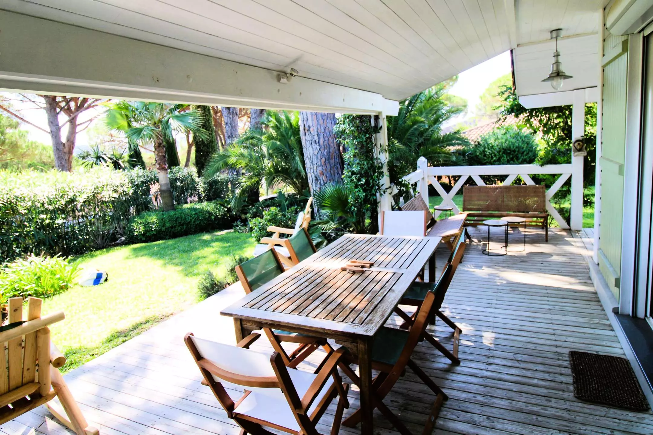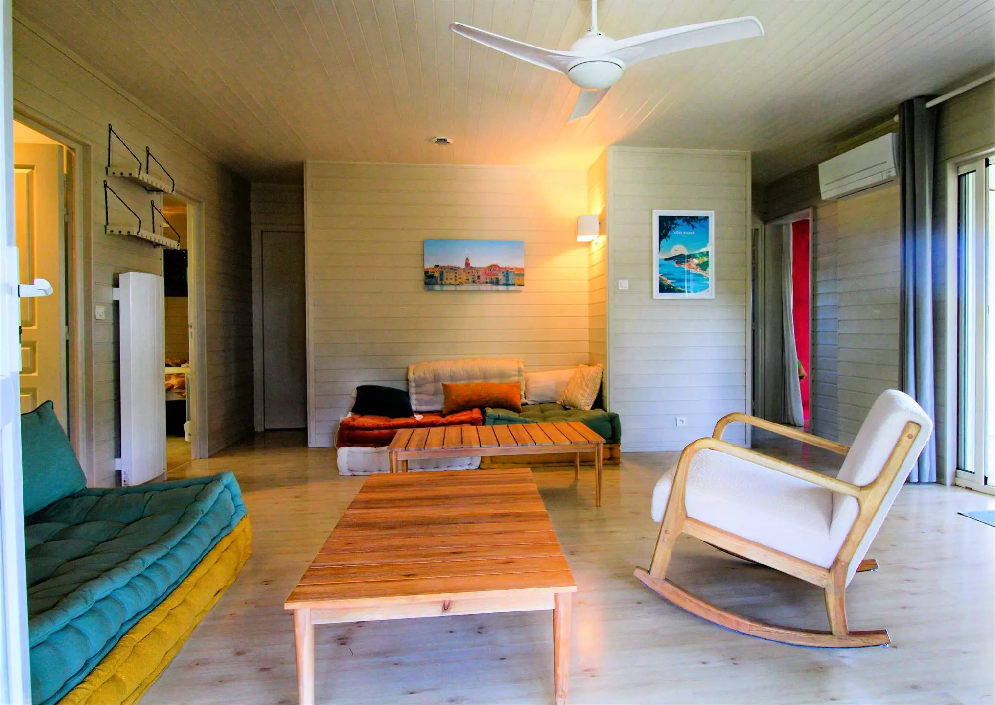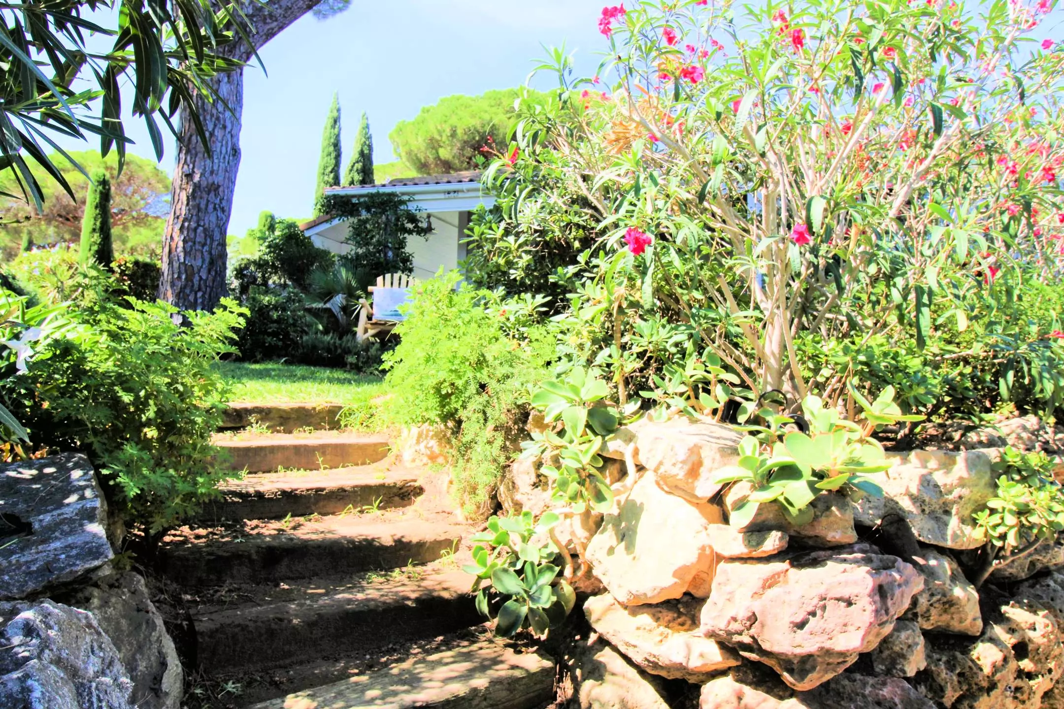 The chalet, approximately 60 m², is surrounded by a beautiful wooden terrace and a carefully maintained Mediterranean garden, with a small sea view. You will find garden furniture, a dining area, deckchairs and a breathtaking view between the sea and the pine trees.