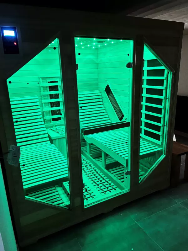 You will also enjoy a moment of pure relaxation in the infrared sauna which very comfortably accommodates two people lying down or up to six people seated.