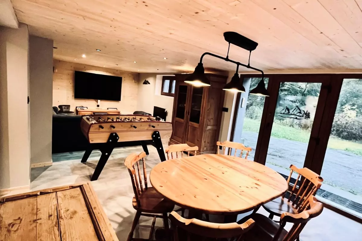 To relax and have fun, you can choose between the living room with its beautiful decorative fireplace and 140 cm TV or the games room with its round table ideal for a game of cards, its table football, an electronic dart board and its giant 190 cm screen to offer you a home cinema session.