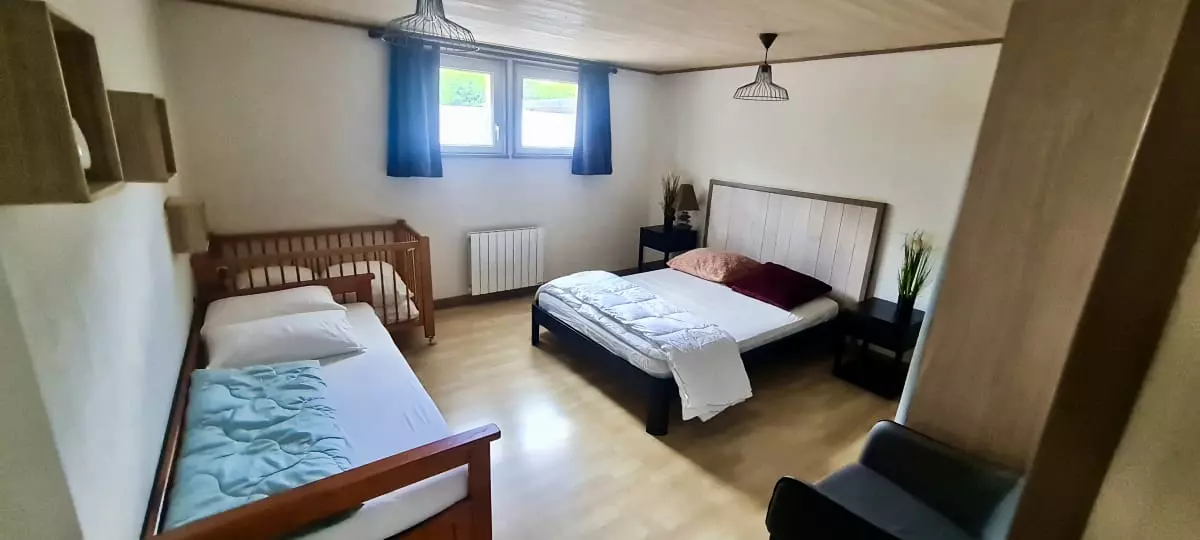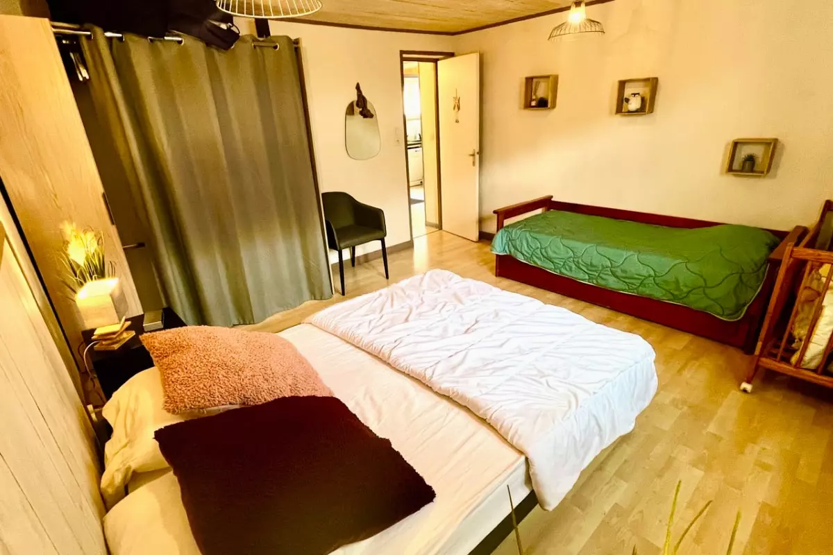 - a bedroom with a double bed and two single beds (trundle bed) with 1 baby bed (mattress, high chair, changing table);