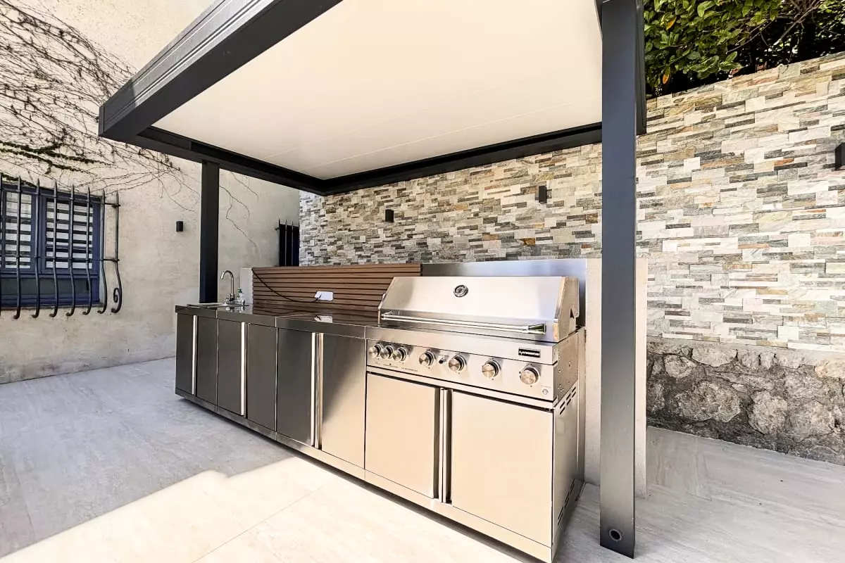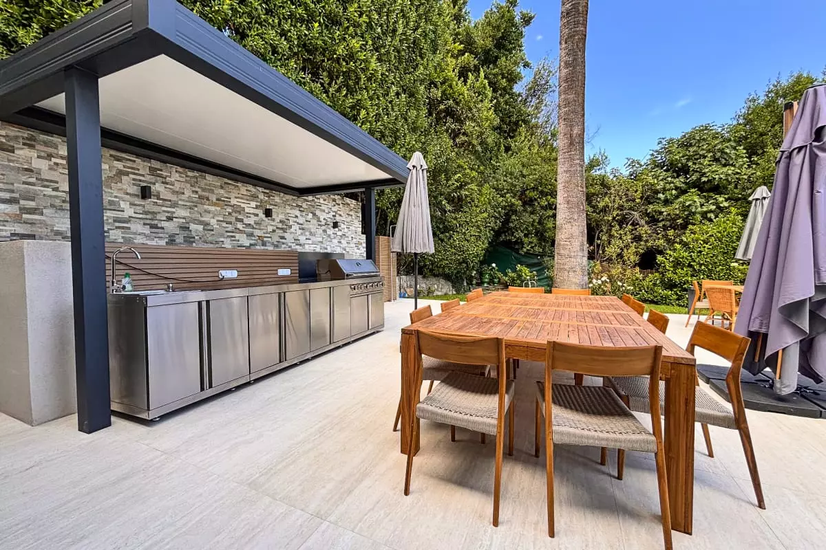 The spacious 60m² living room is the heart of the villa, with its high ceilings, large windows offering views of the lush garden, and ultra-comfortable, high-quality furnishings. It's the perfect place to relax with family or friends, whether in front of the television, reading in peace, or just relaxing.