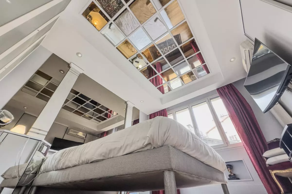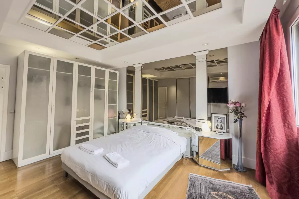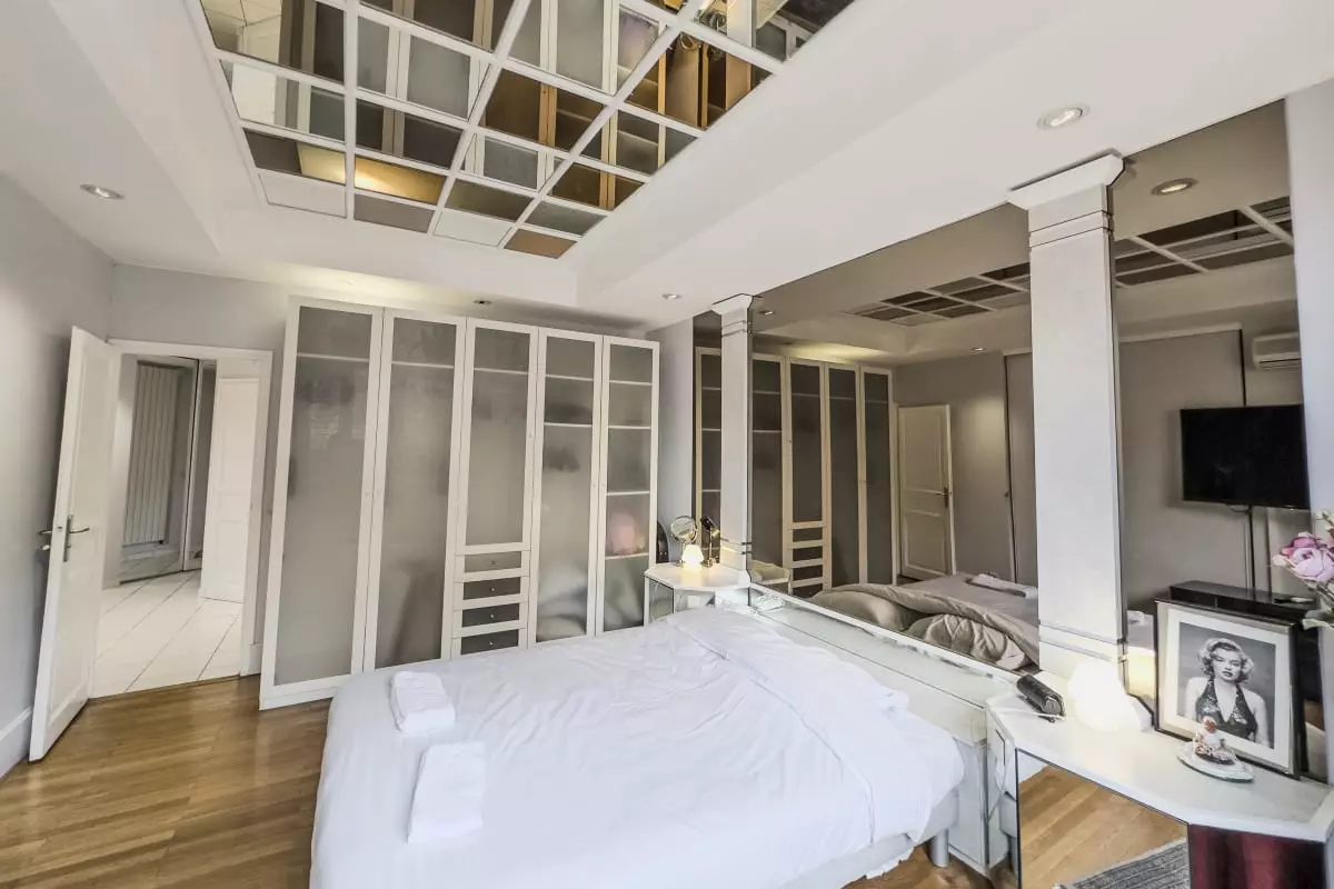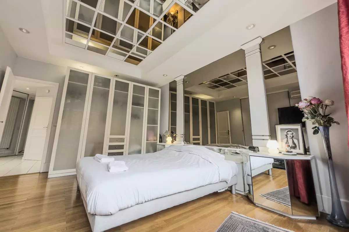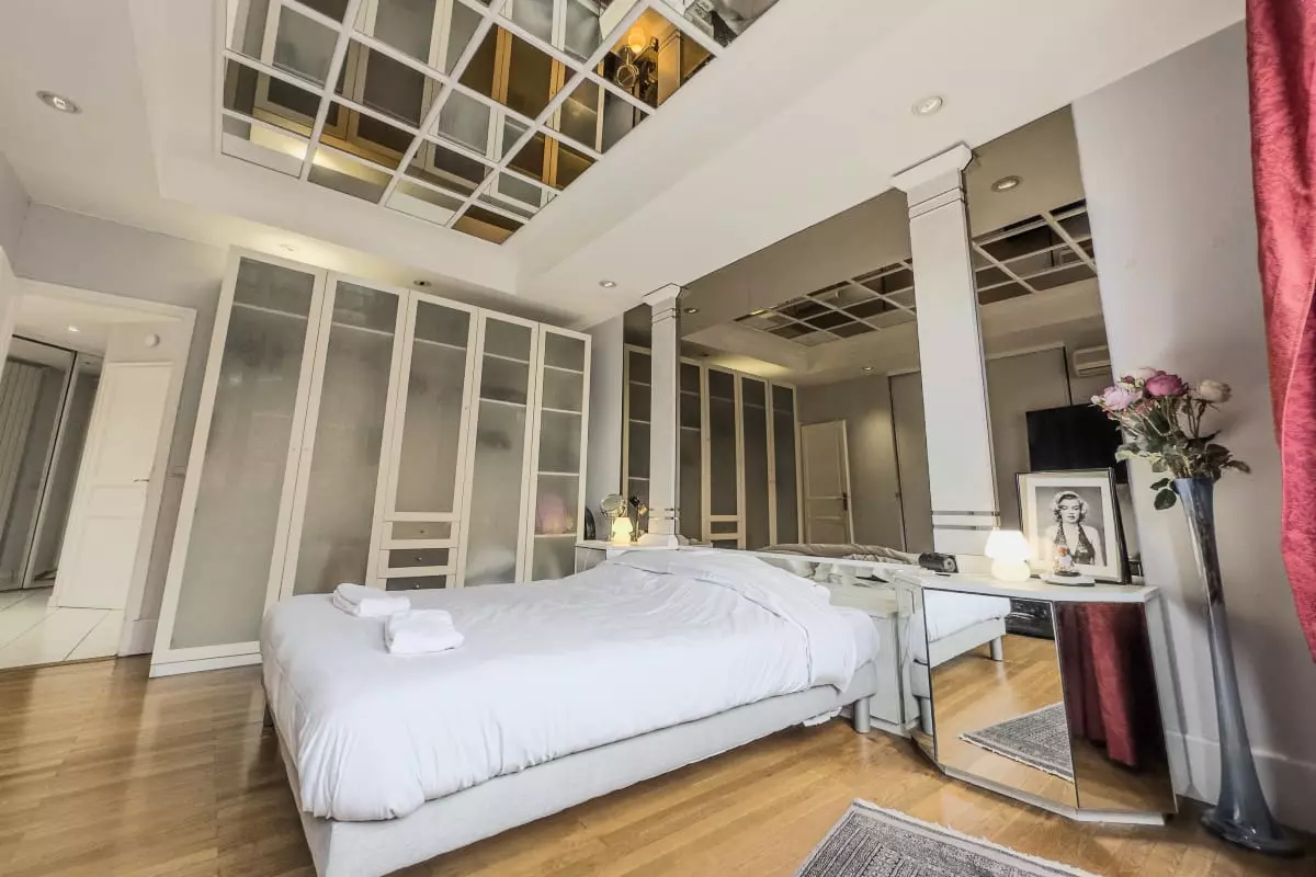 - a large bedroom with double bed and ceiling mirror;