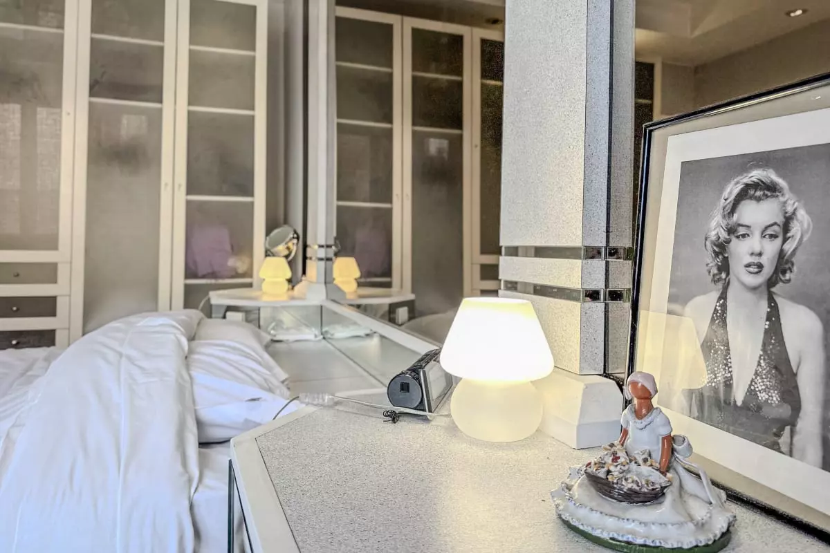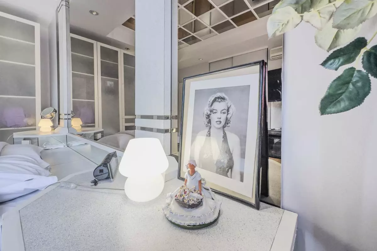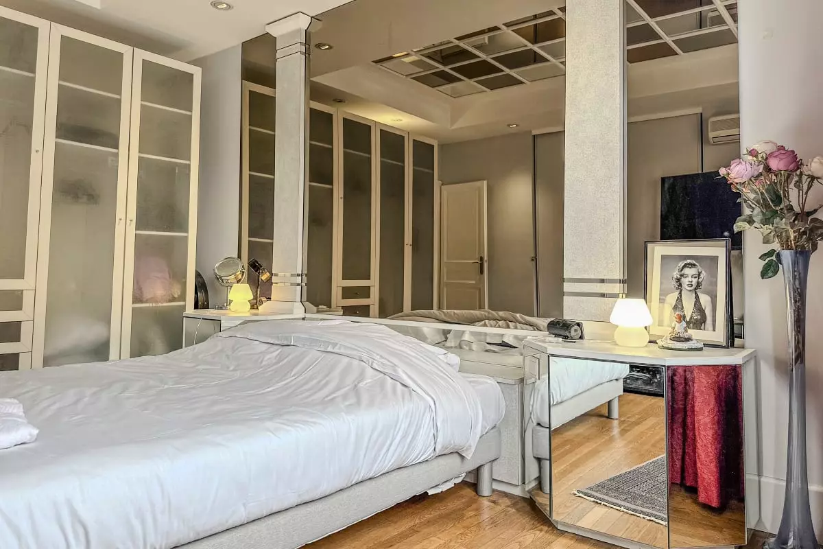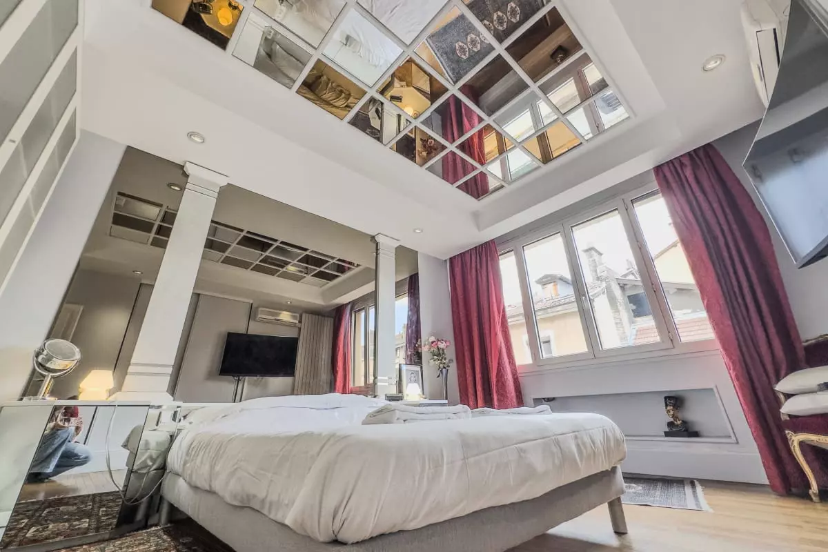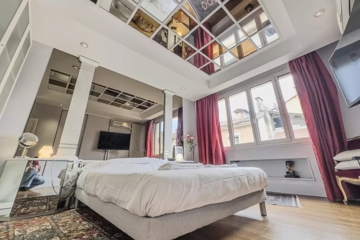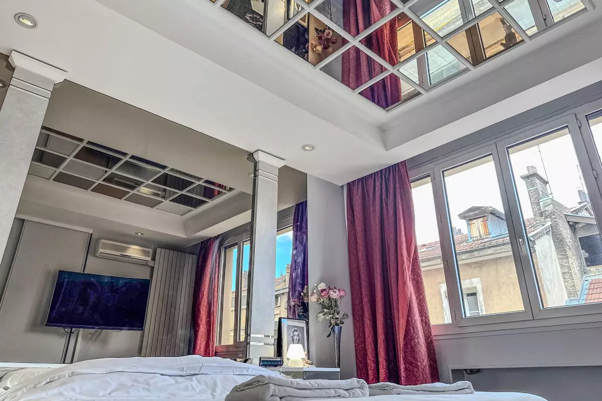 - a large bedroom with double bed and ceiling mirror;