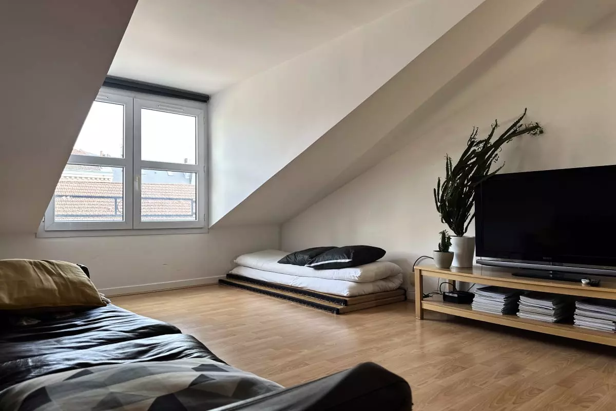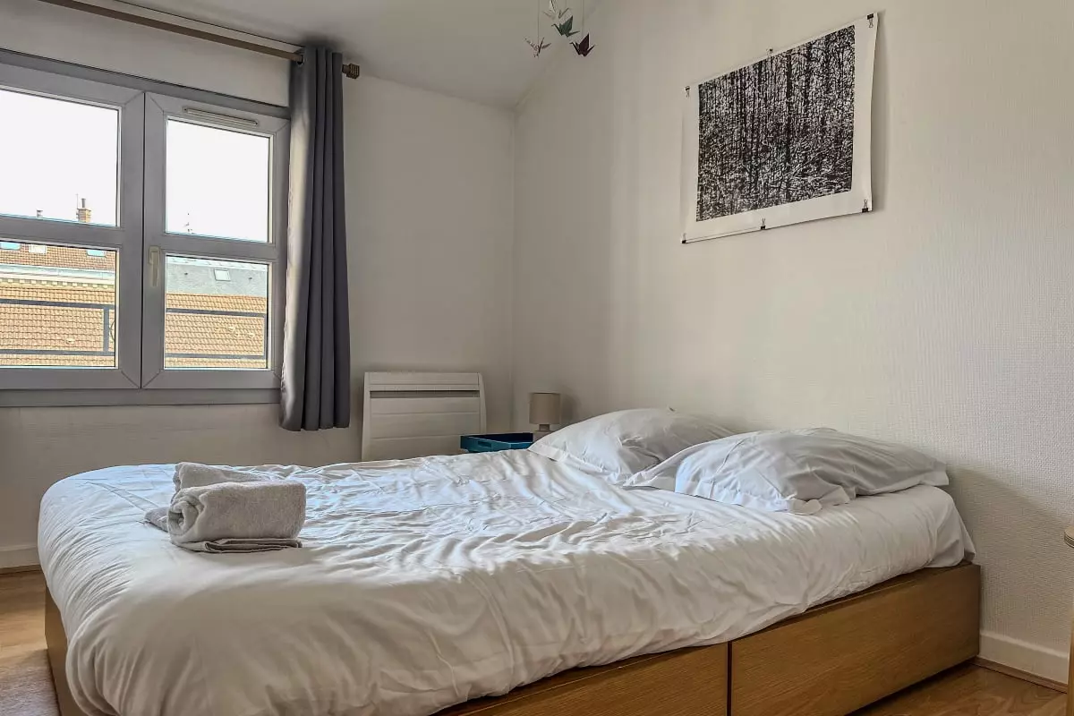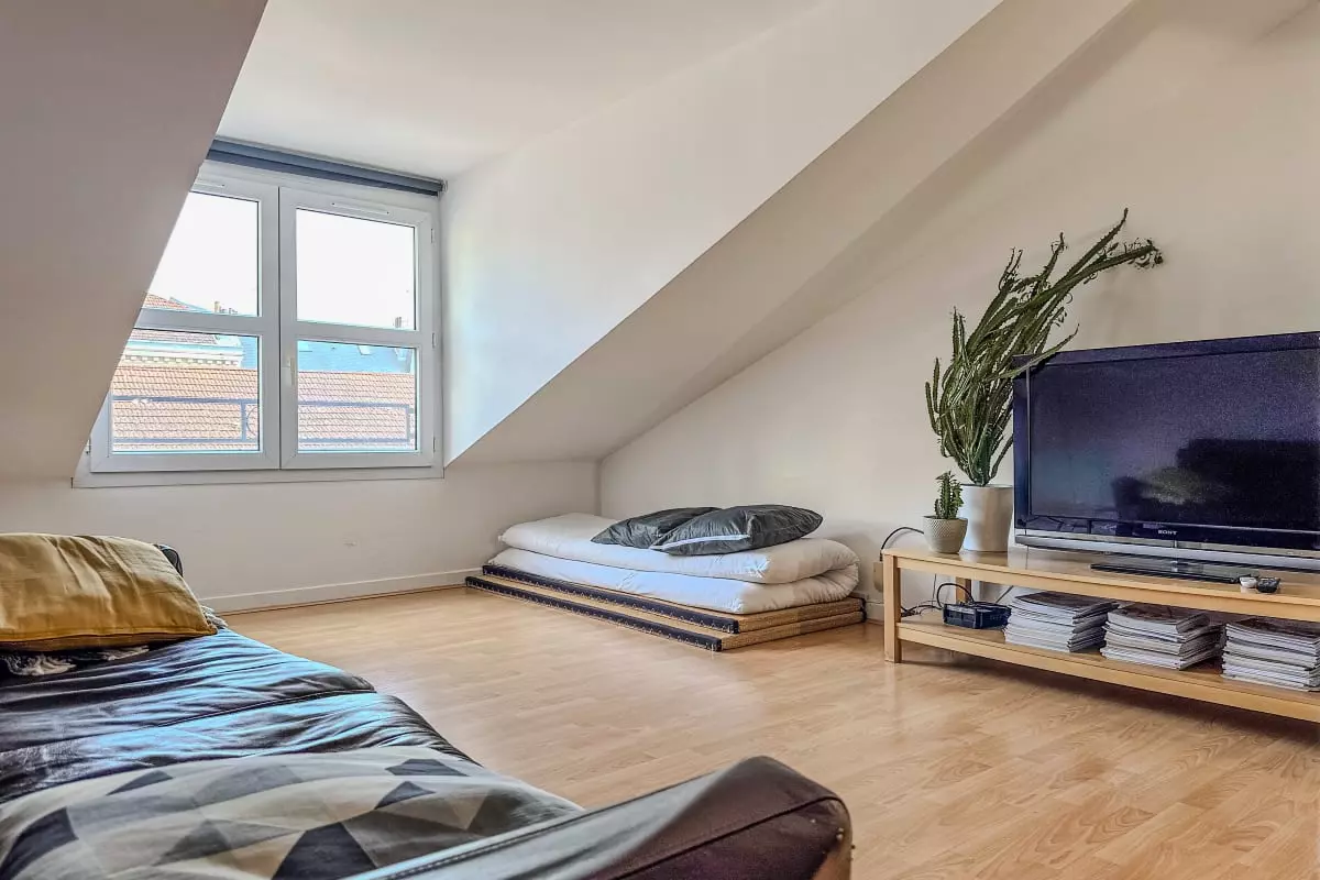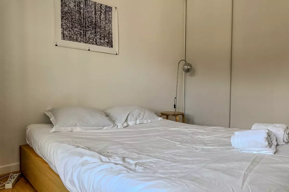 1 bedroom with a futon bed + 1 double futon mattress in the living room (unfoldable if necessary).