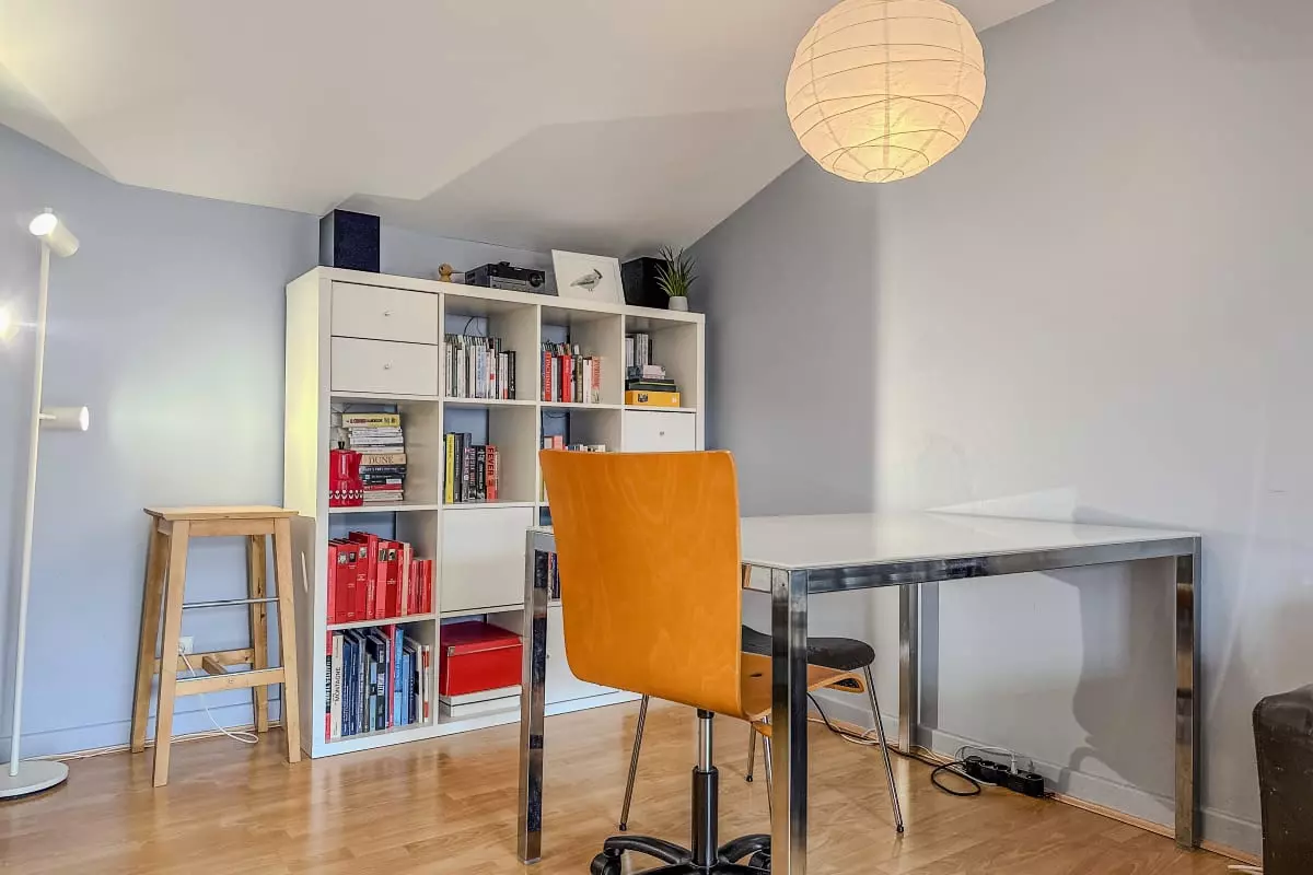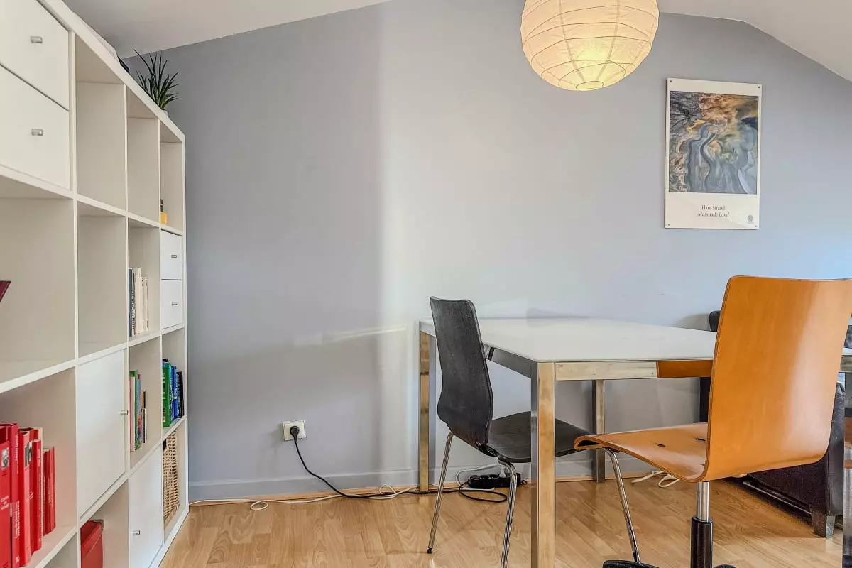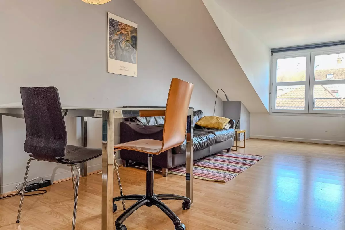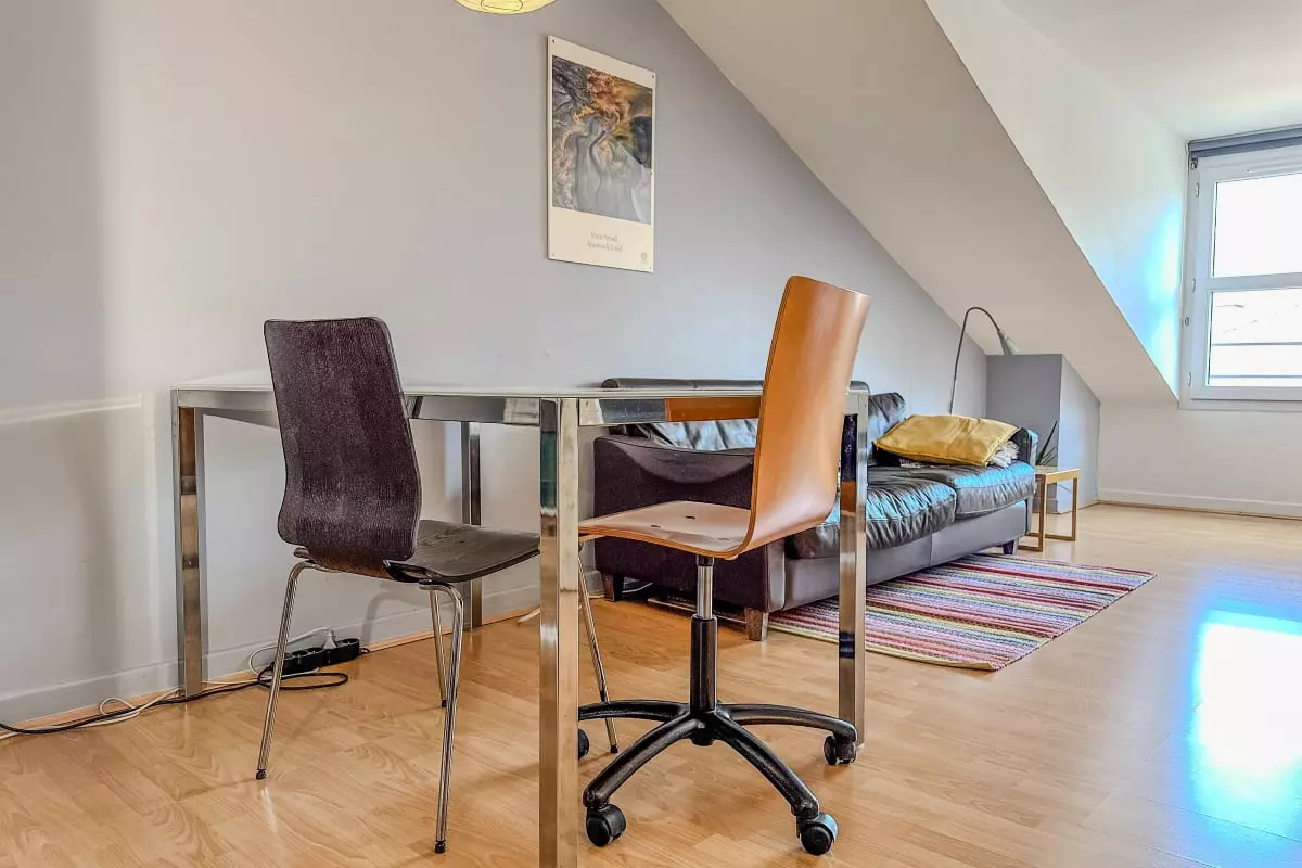 - a large cozy living room with sofa, armchair and table for eating or working (office chair);