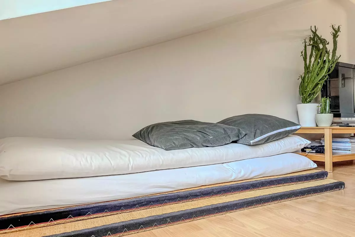 - a bedroom with a Japanese double bed “Muji” and futon (220 x 160 cm) + a second 2-seater futon mattress on tatami mats in the living room to be unfolded if necessary;