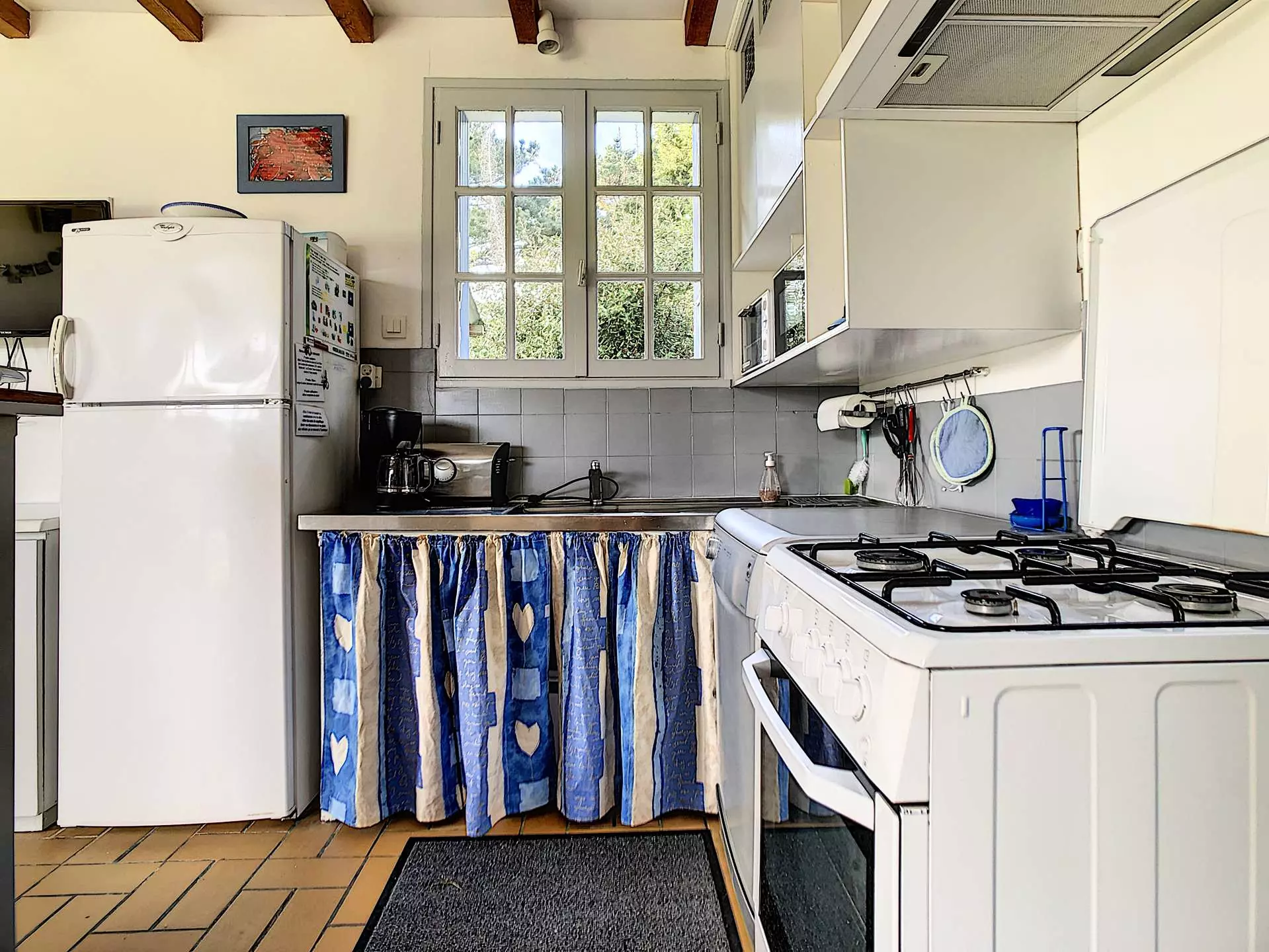 Gas stove, mini grill oven, fridge-freezer, dishwasher, coffee maker, toaster, kettle, dining table and chairs, sofa, television, two 140x190 cm beds, pillows, duvets and blankets for the beds. Washing machine in the bathroom, baby bed and high chair, garden furniture, barbecue.