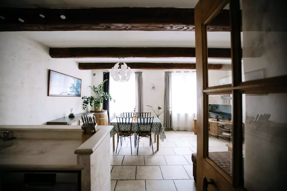 On the floor, you will discover a bright, open space with warm decoration, including a cozy lounge area, a dining area and a fully equipped open kitchen, ideal for preparing delicious meals with local products.