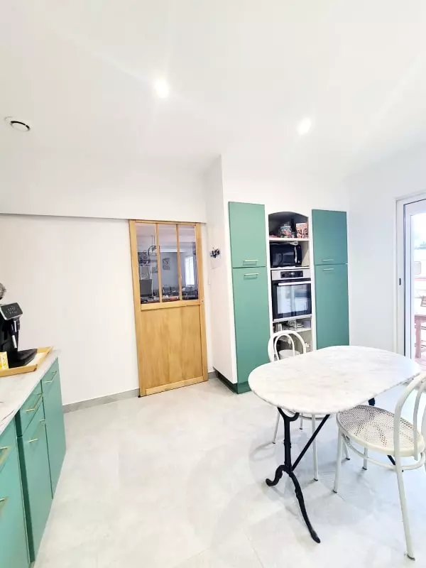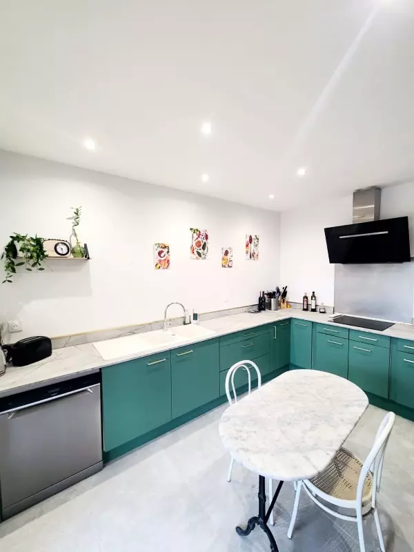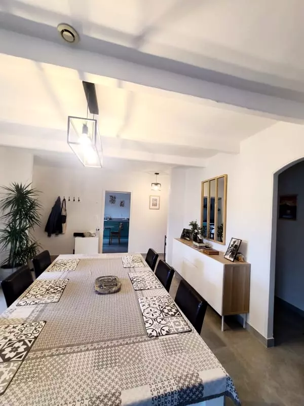 Inside, the house opens onto a welcoming entrance hall that leads to a bright living-dining area and a fully renovated semi-open kitchen. Functional and fully equipped, the kitchen also features a convenient adjoining area for storing your groceries.