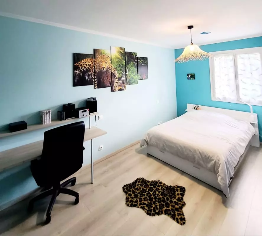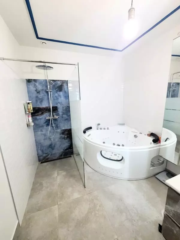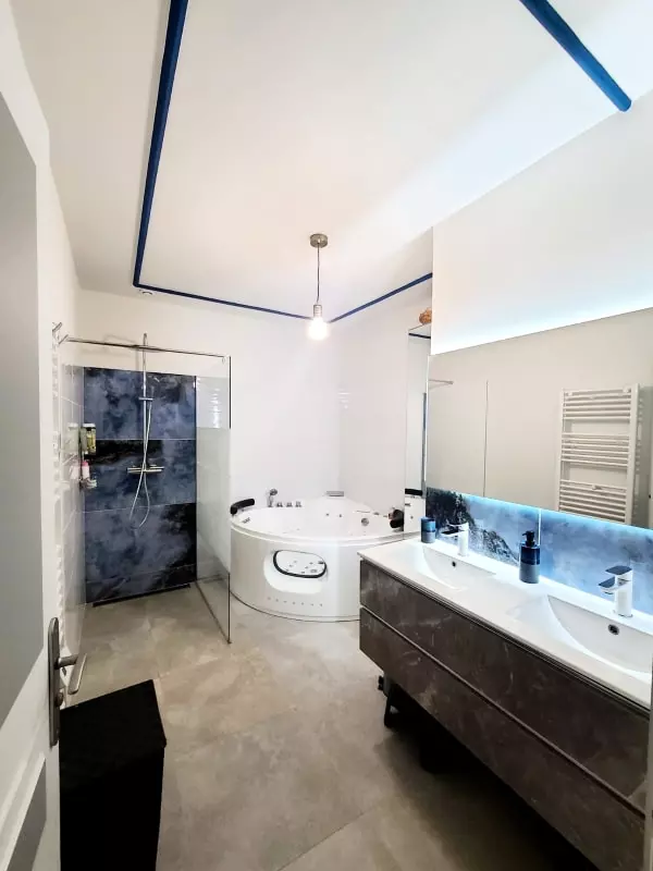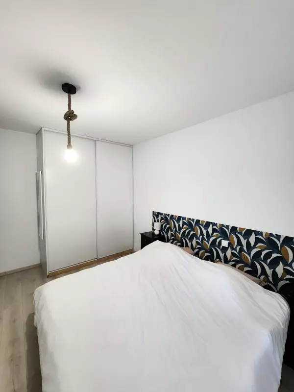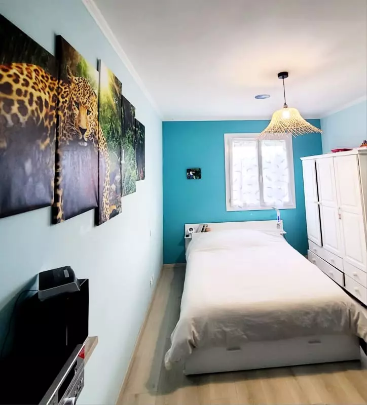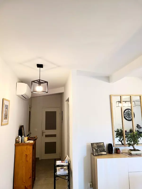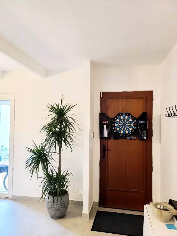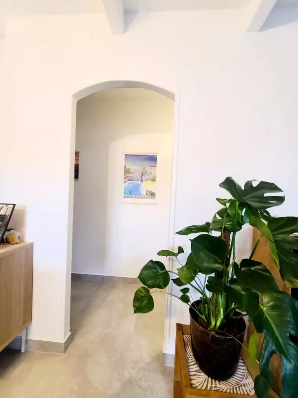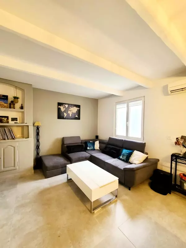 The house also includes a bathroom with a shower and bathtub, a separate toilet, and three comfortable double bedrooms. The air conditioning, cleverly placed at the entrance to the hallway, cools the entire house, ensuring optimal comfort even on hot summer days.