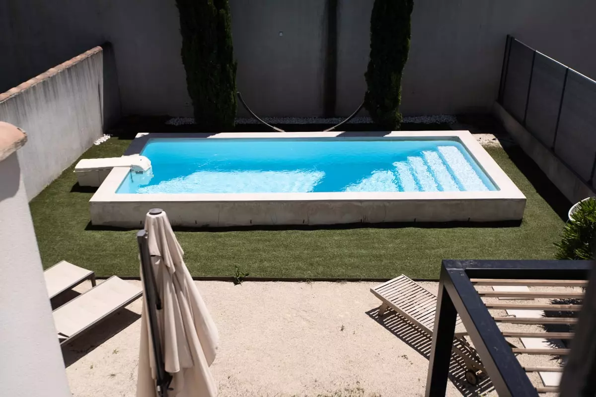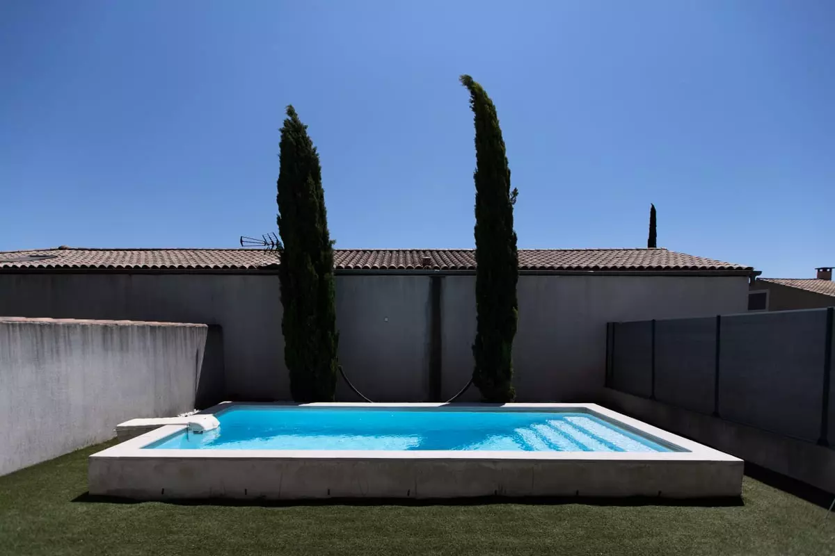 7m x 3m swimming pool secured by alarm, open from the beginning of May to the end of September.