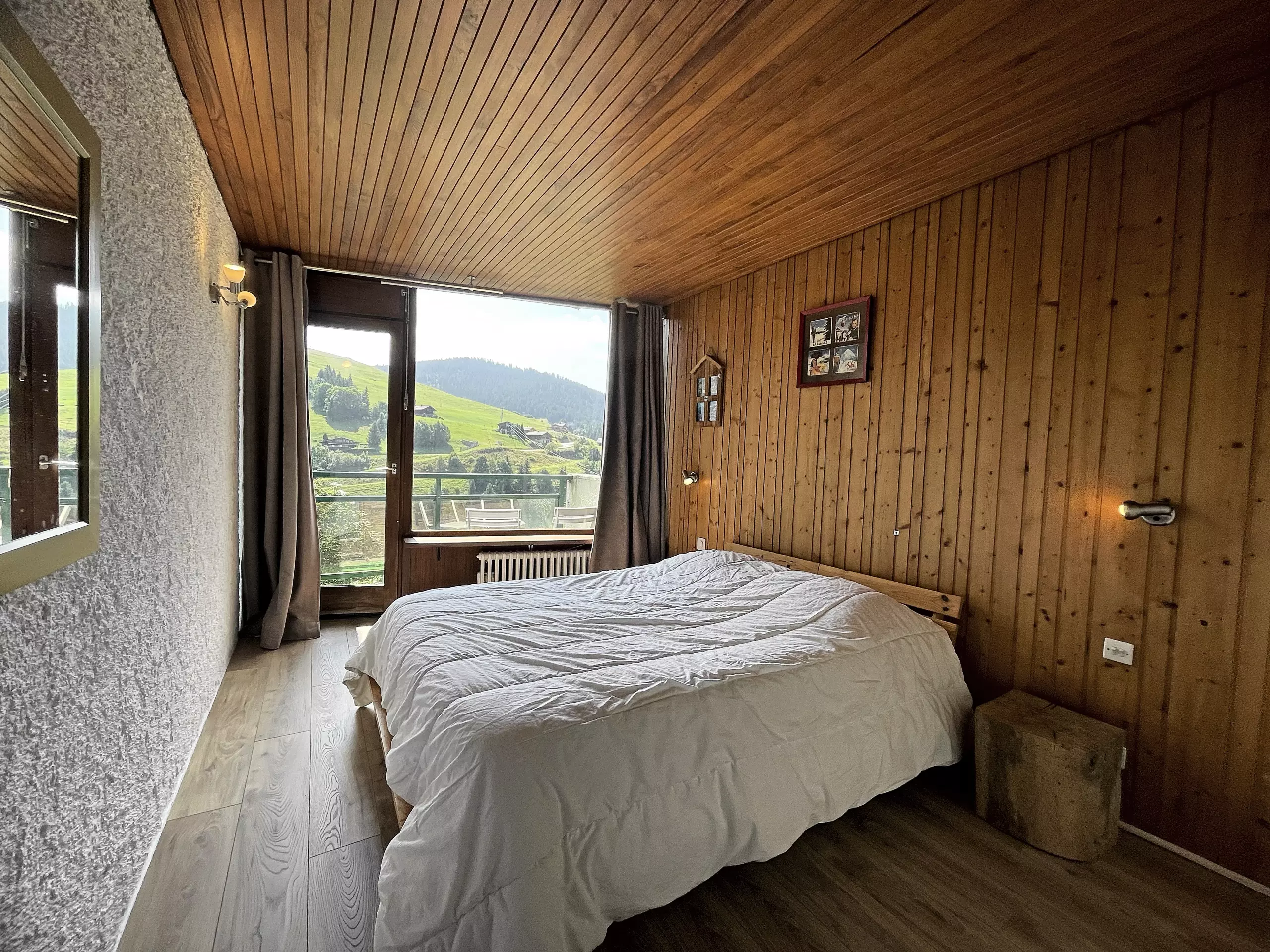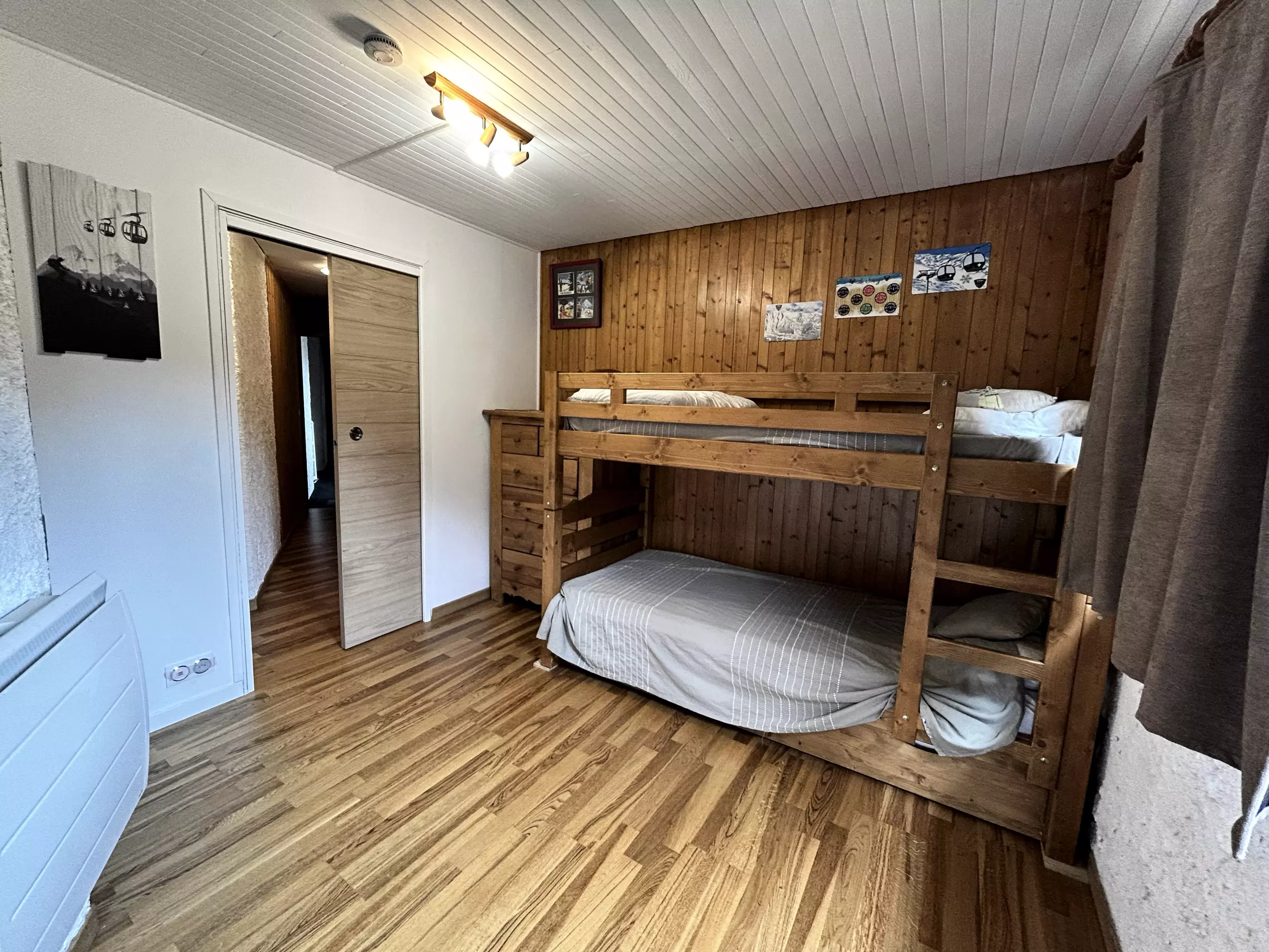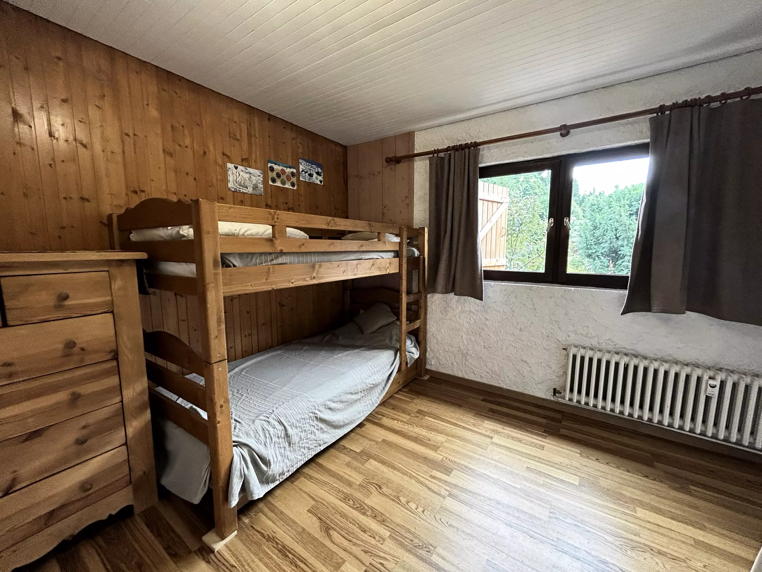 MOUNTAIN CORNER: (parquet floor) 12 m2, 2 single bunk beds (90 cm) + 1 pull-out bed (90 cm), south-facing window, chest of drawers, ?BEDROOM: (carpet floor) 11.48 m2, one double bed (140 cm), access to a balcony, wardrobe, ?