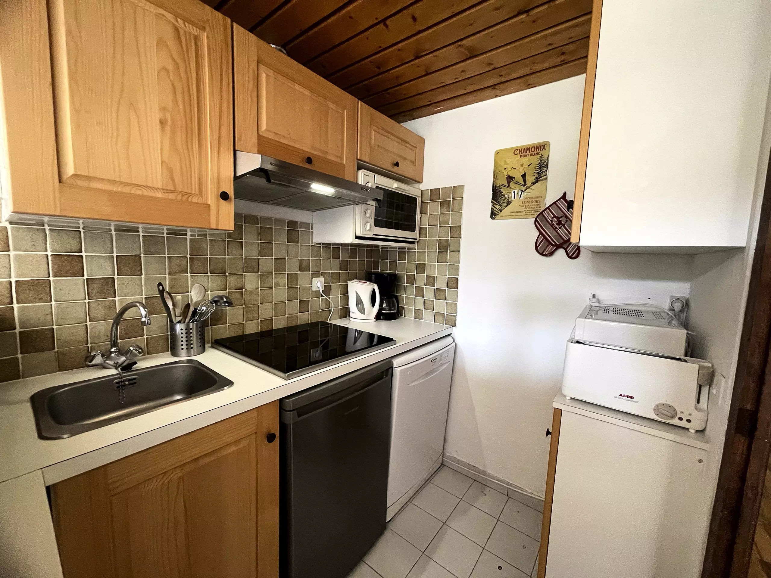 KITCHEN CORNER: sink, 4-burner induction hob, rotisserie, 128 l refrigerator, extractor hood, dishwasher, filter coffee maker, raclette machine, units with all kitchen essentials
