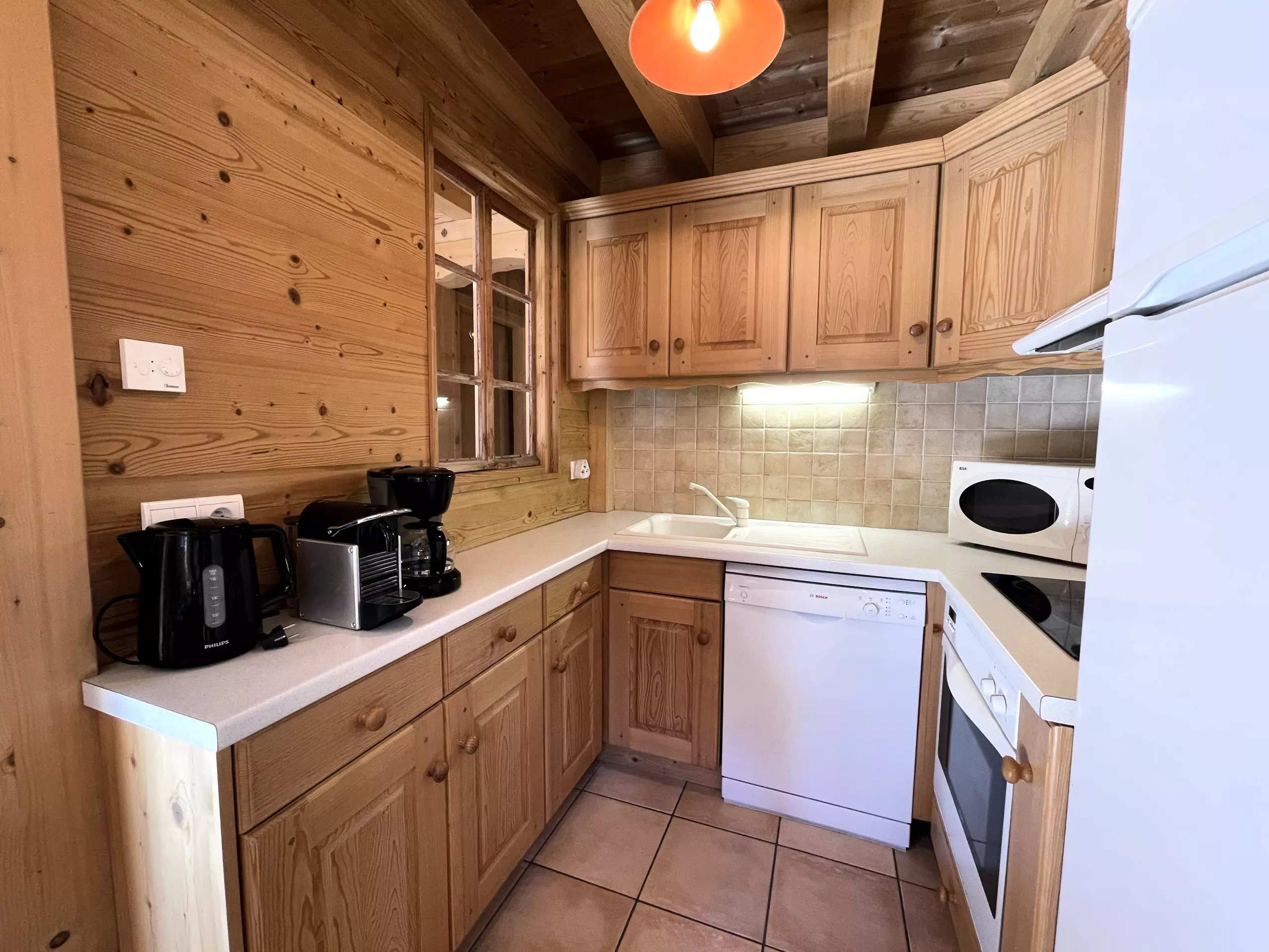 KITCHEN: (tiled) 4 m2, sink, 4-burner ceramic hob, electric oven, microwave, extractor hood, refrigerator with freezer (240L), dishwasher, fondue and raclette machines, filter and capsule coffee maker, units with all kitchen essentials.