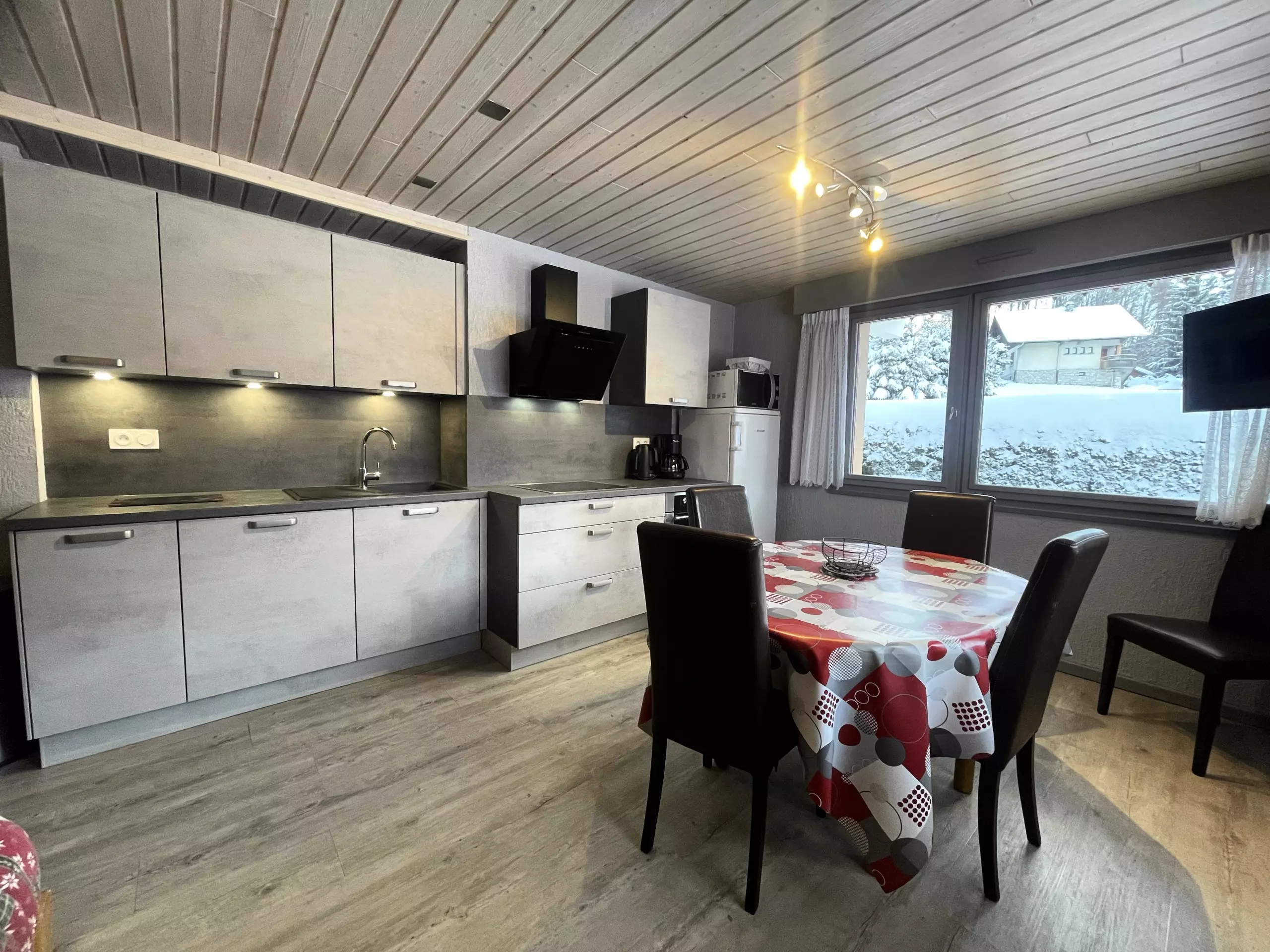 Fully equipped KITCHEN: 4.5 m², sink, 4-ring electric hob, oven, microwave, kettle, filter coffee maker, fridge, dishwasher, raclette machine, units with all kitchen essentials (fondue machine available in common area).