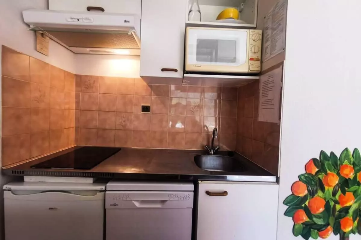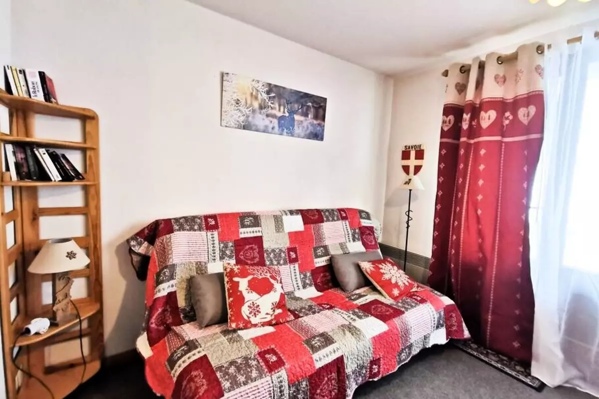 The apartment features a fully equipped kitchen and a living room with a sofa bed, a bathroom with a shower and toilet, a washing machine, a bedroom with bunk beds, and a ski locker. You have access to a terrace where you can enjoy the sun.