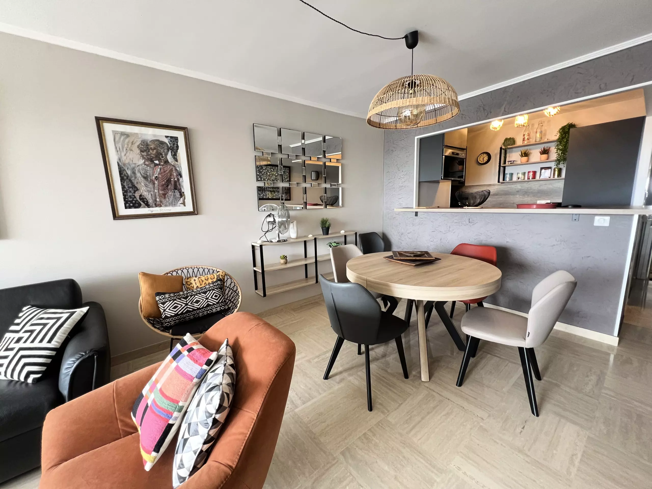 The open-plan kitchen is fully equipped with a refrigerator, washing machine, dishwasher, oven, microwave, coffee maker, kettle, and all necessary utensils, making it easy to prepare meals.