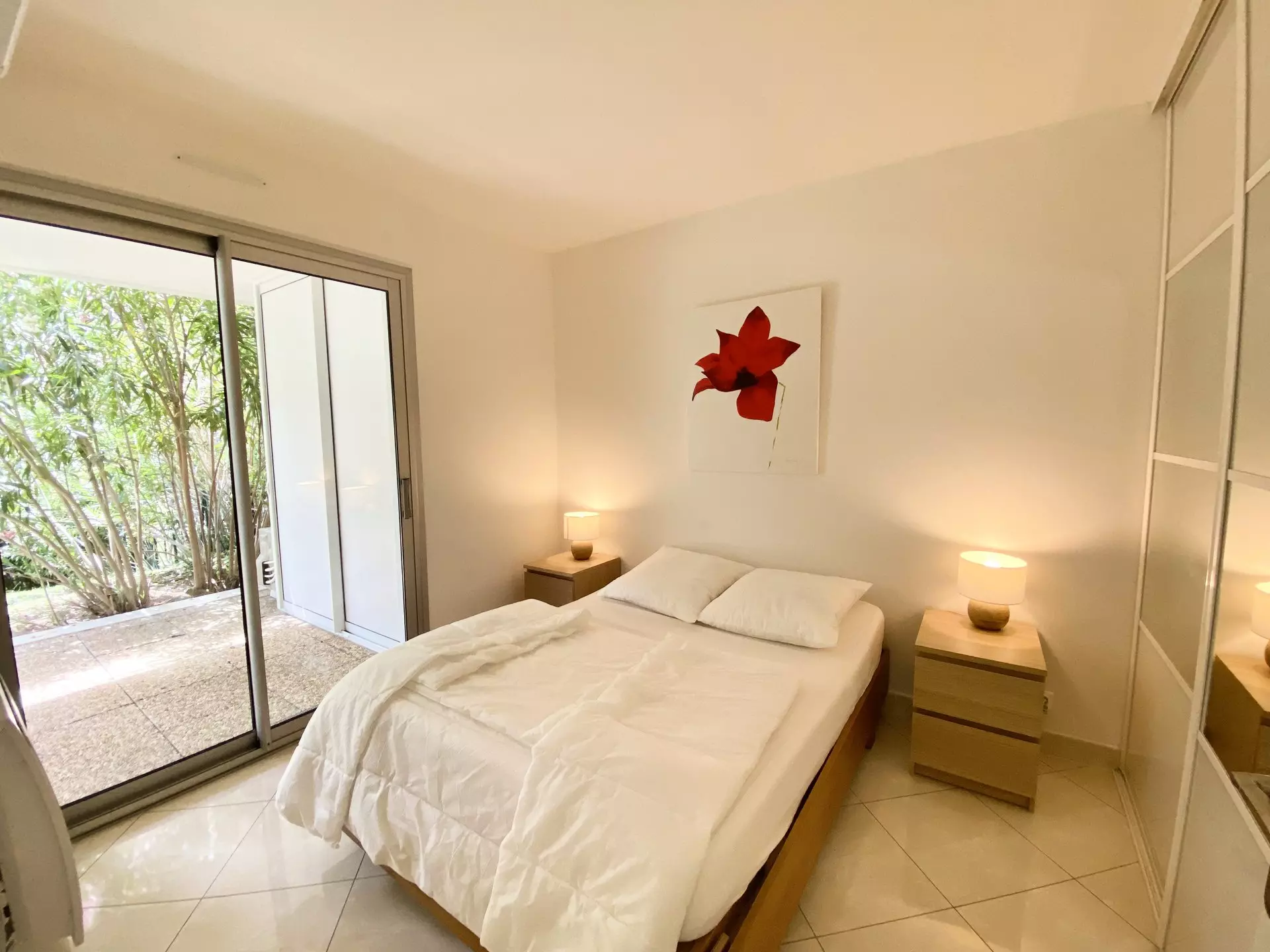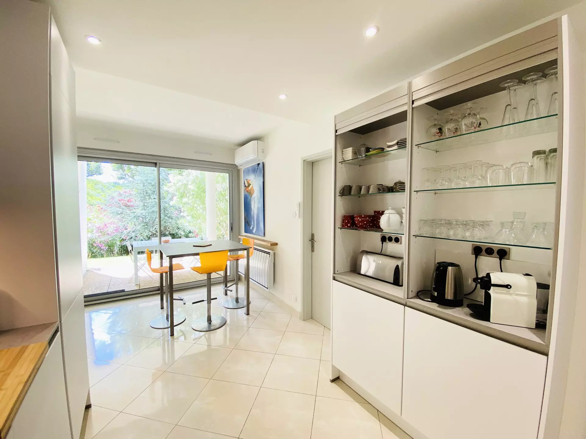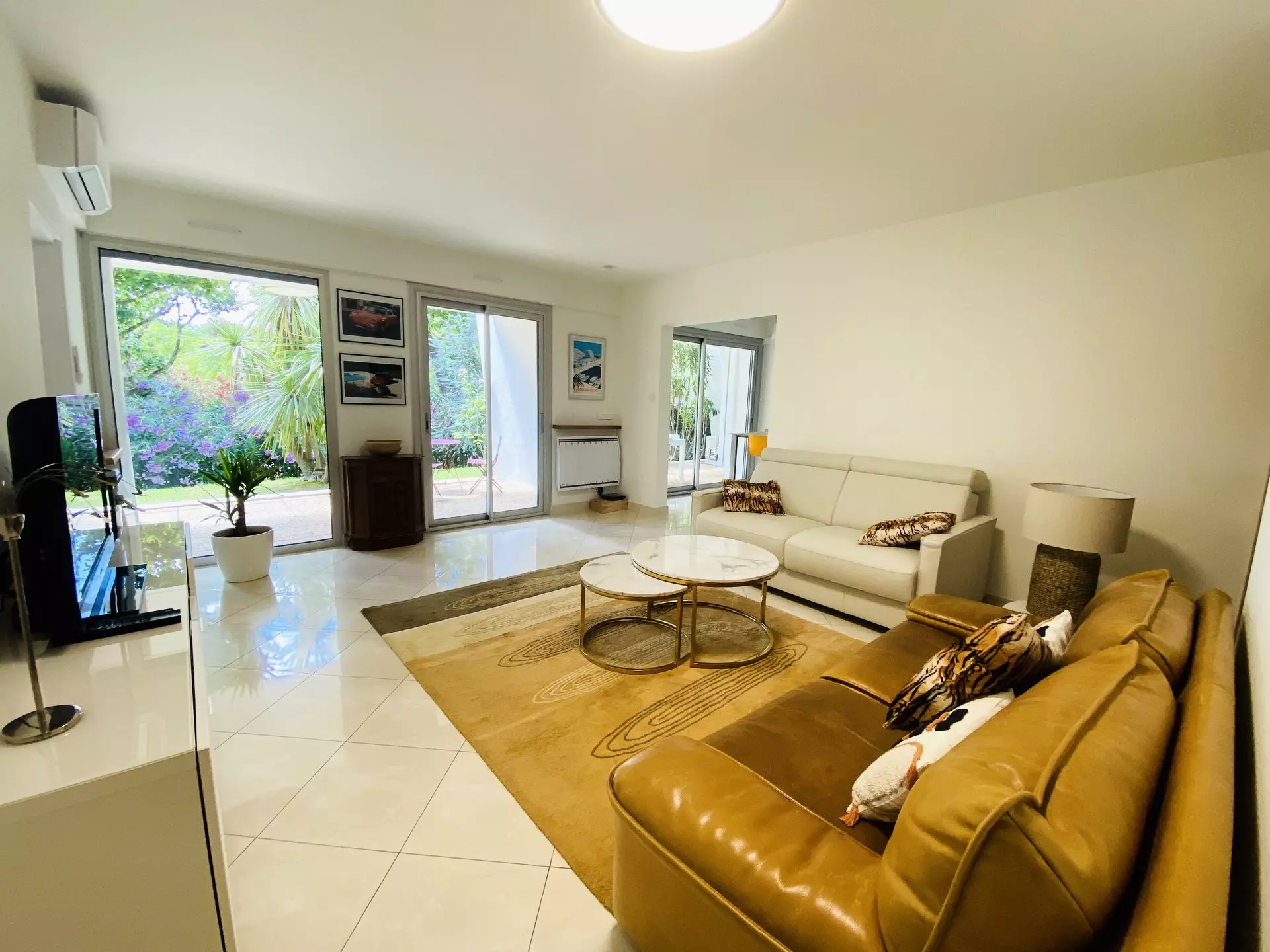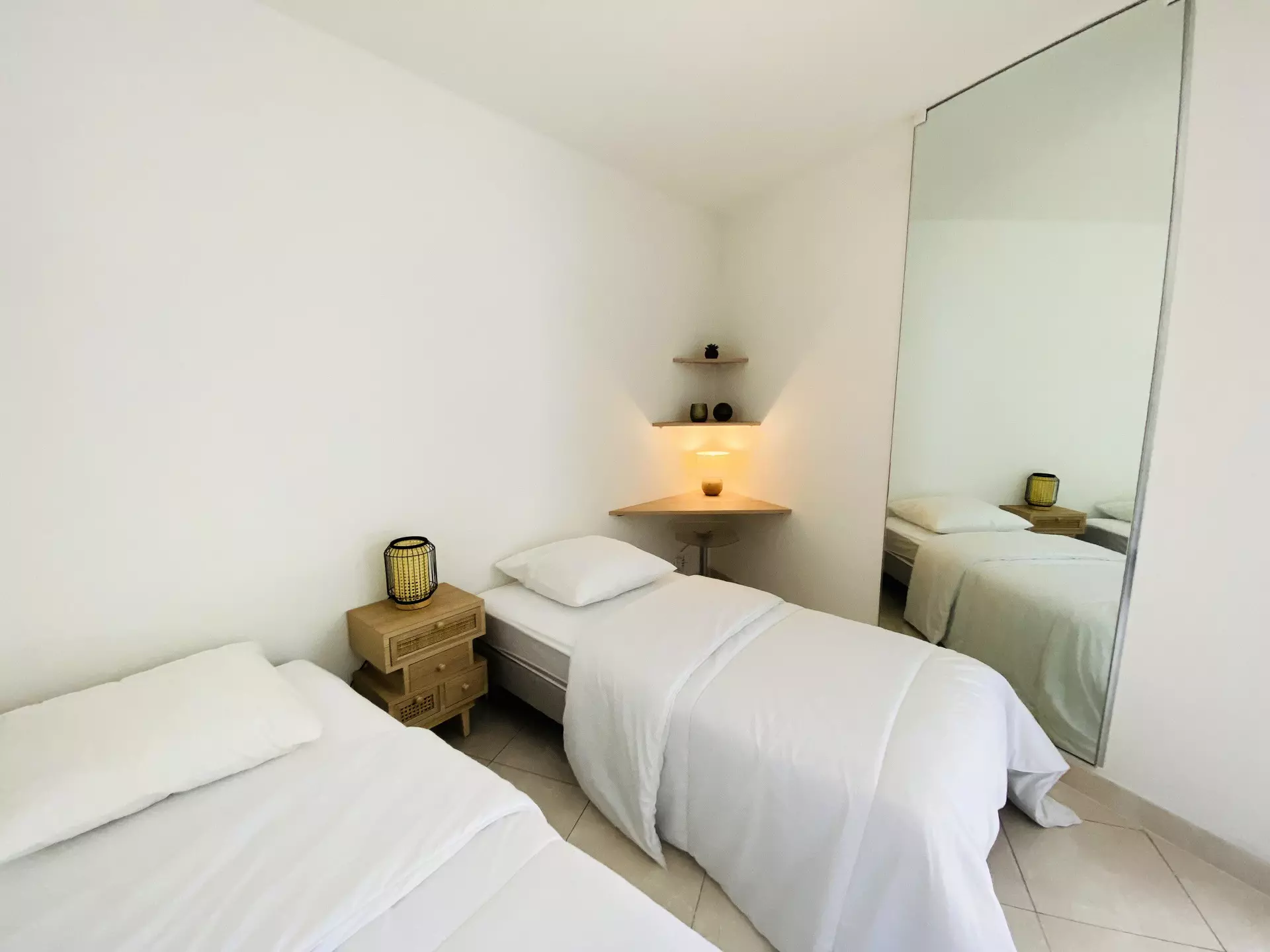 Its air-conditioned living room opens onto a beautiful terrace on the ground floor facing southwest. The apartment is composed of a living room with sofa, and 2 air-conditioned bedrooms, one equipped with a comfortable double bed (140), the other with two single beds (90), the third bed is the sofa convertible into a bed (140) in the living room.