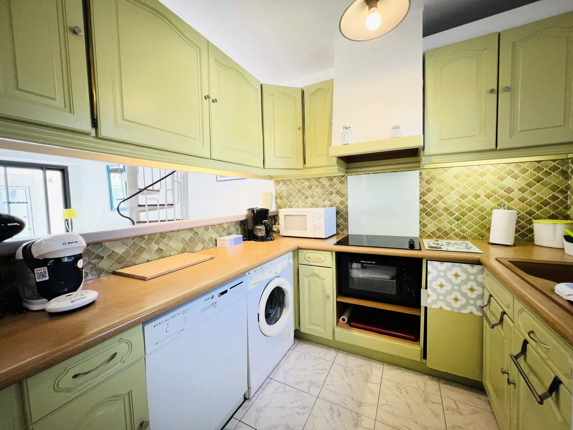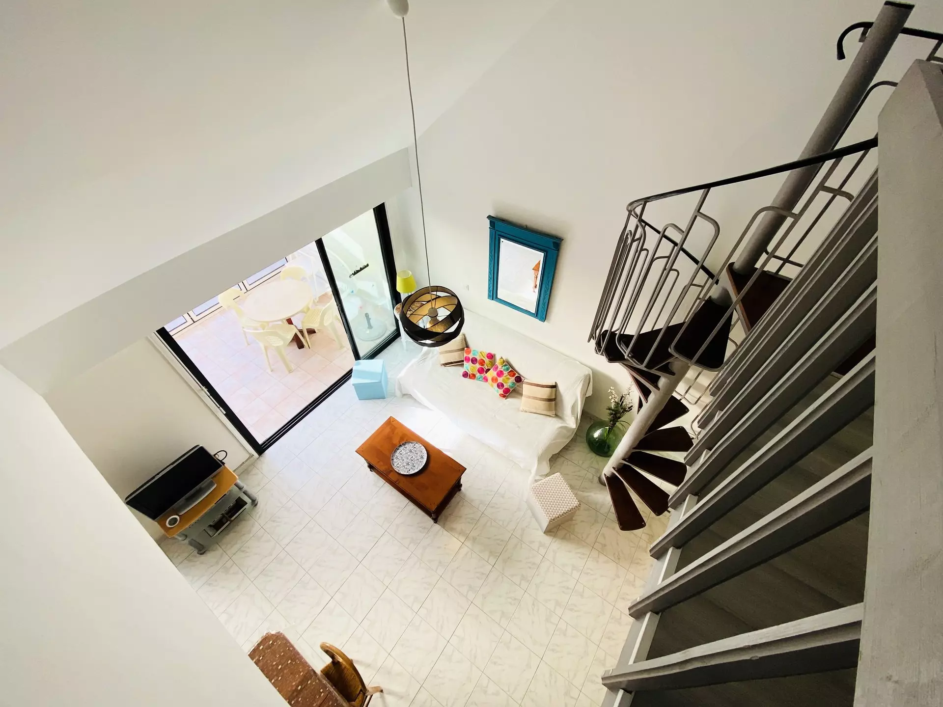 This villa in a very residential area also has 2 bedrooms upstairs. The ground floor consists of an open kitchen overlooking the living/dining room (equipped with a sofa bed convertible into 140), a shower room with toilet, a veranda and a patio.