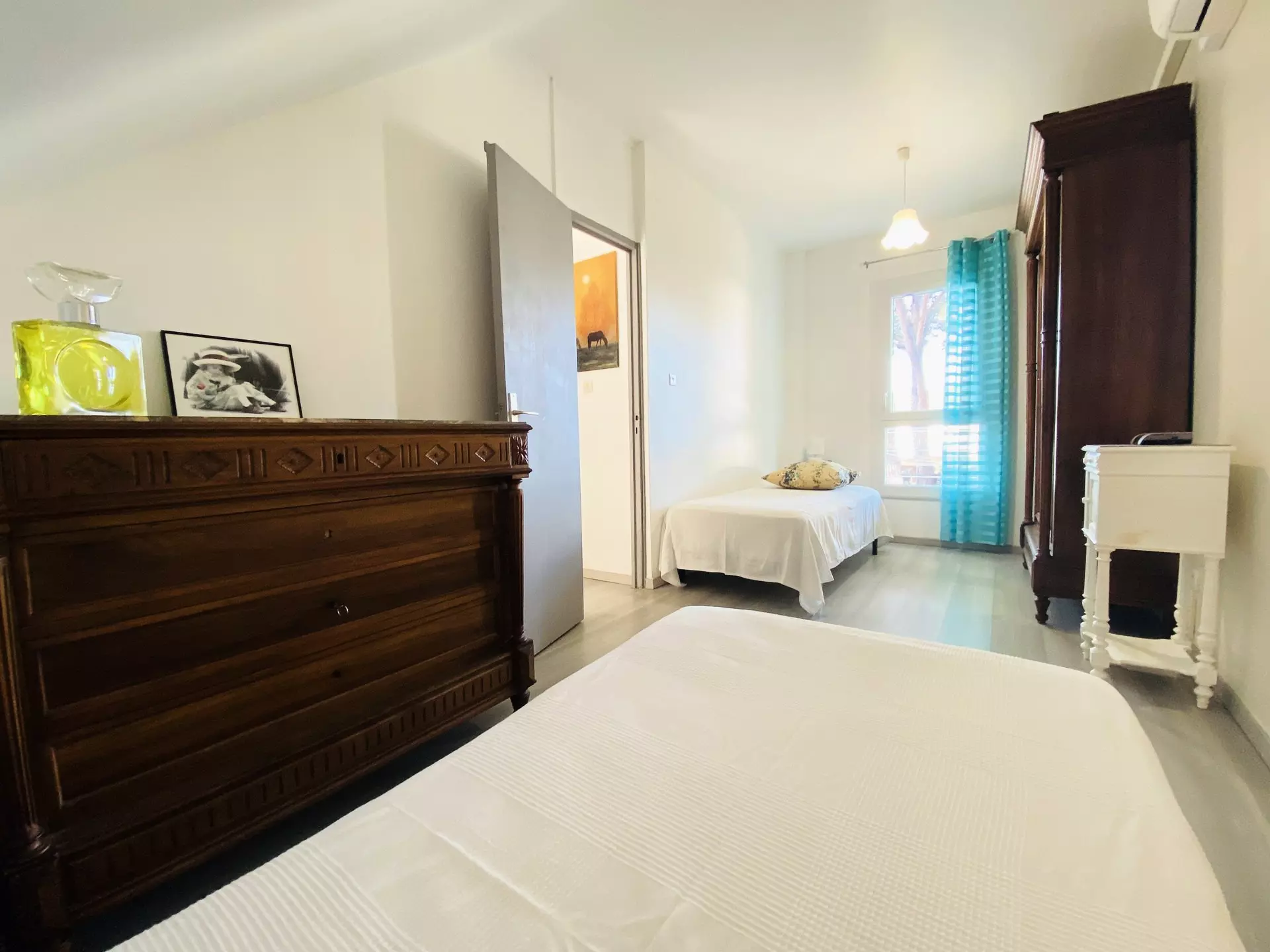 Upstairs, 2 bedrooms, one with a 140 cm bed, the second bedroom has twin 90 cm beds (this is the air-conditioned bedroom).