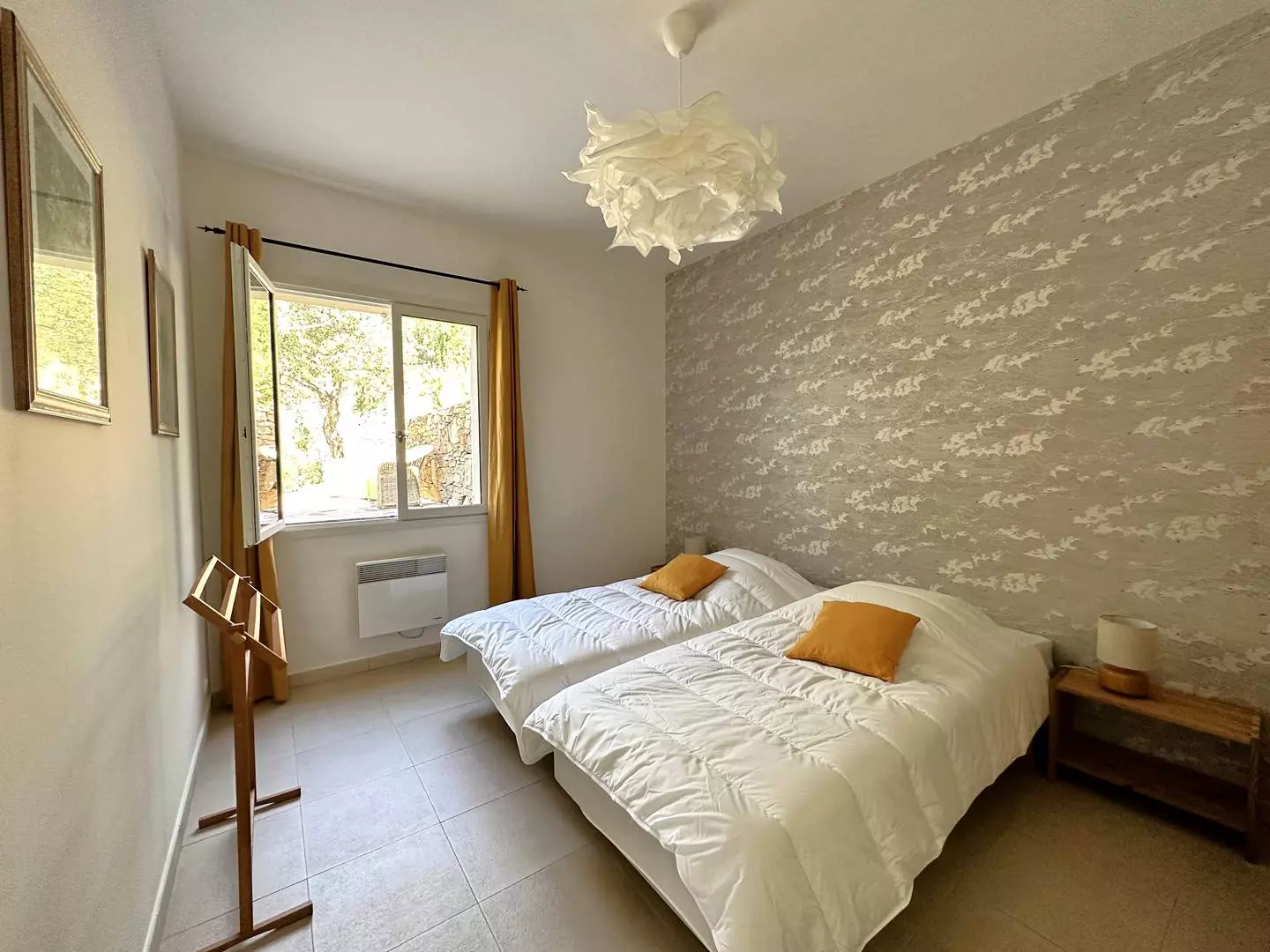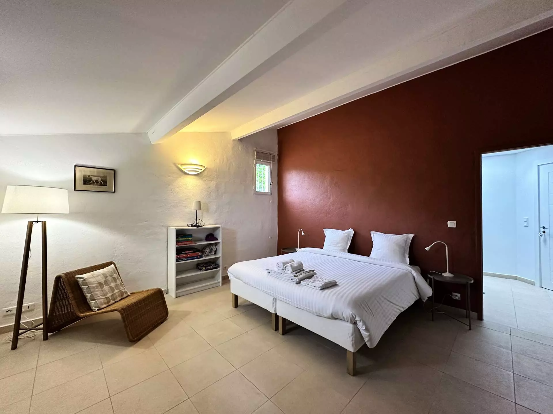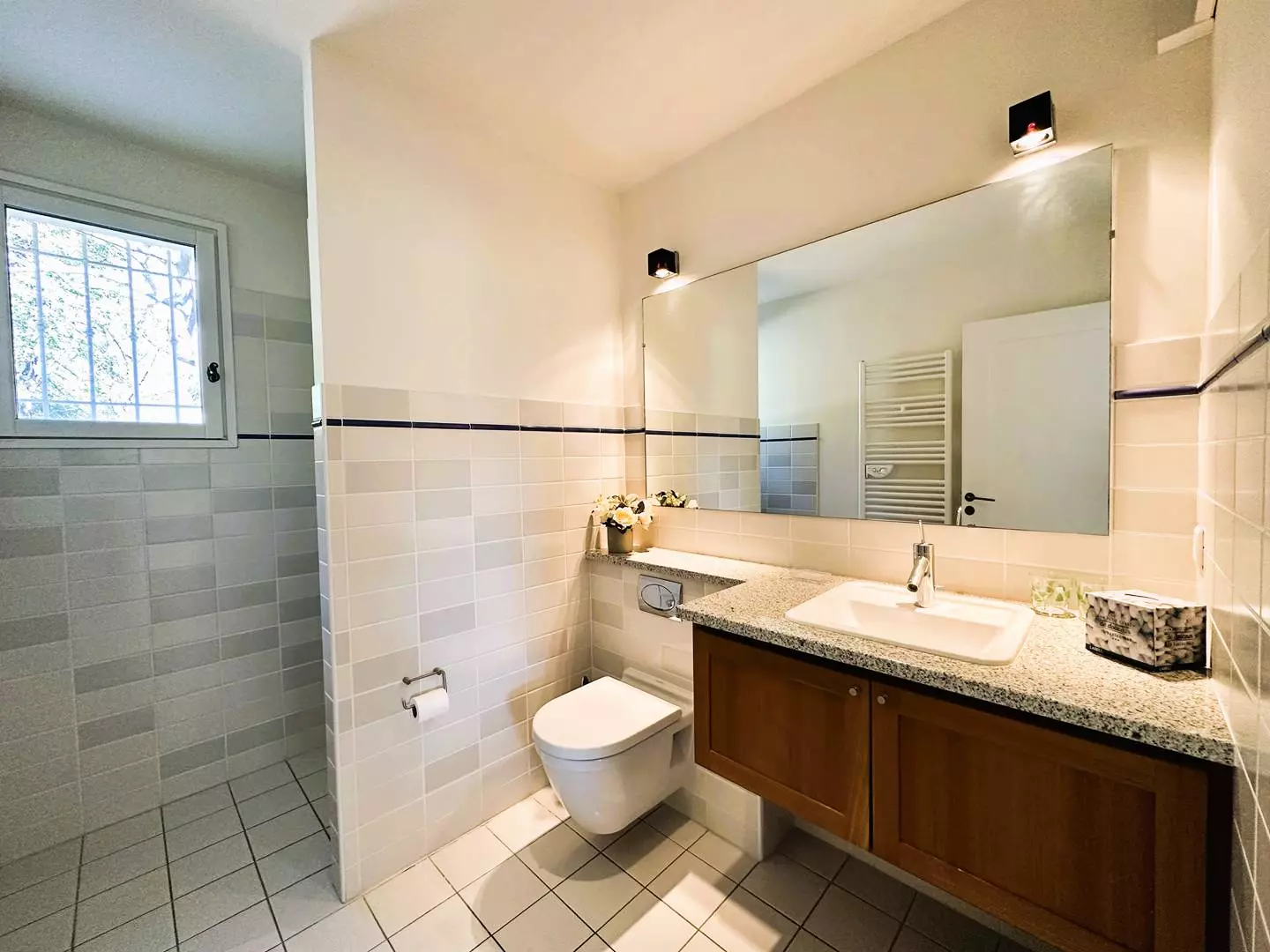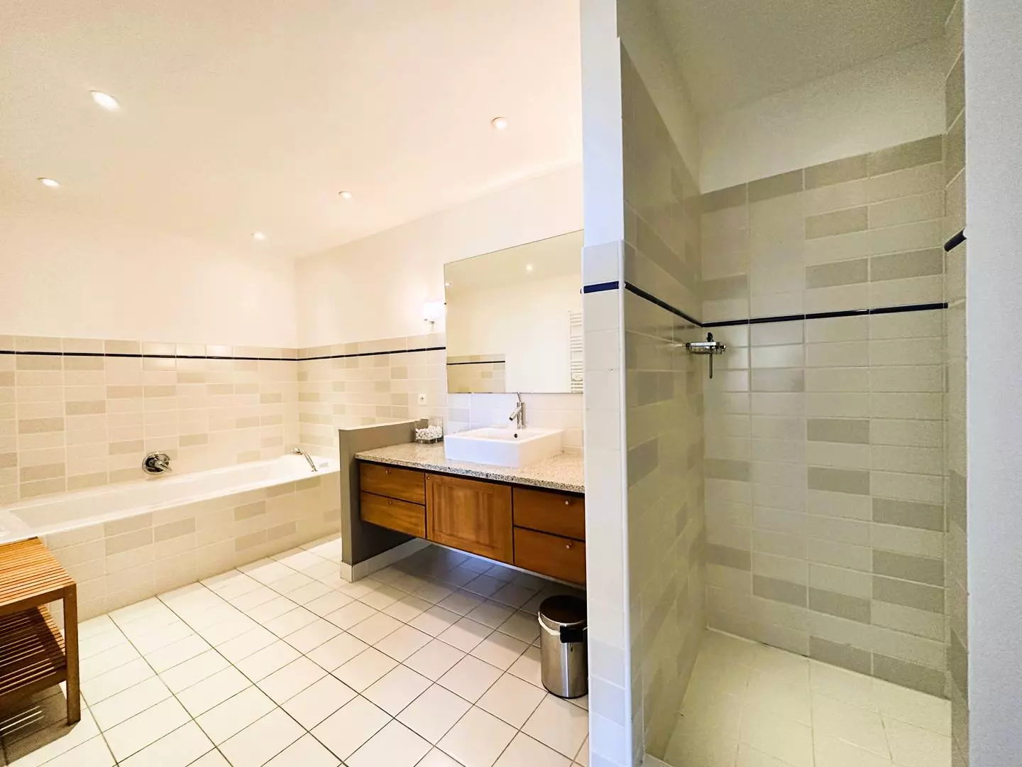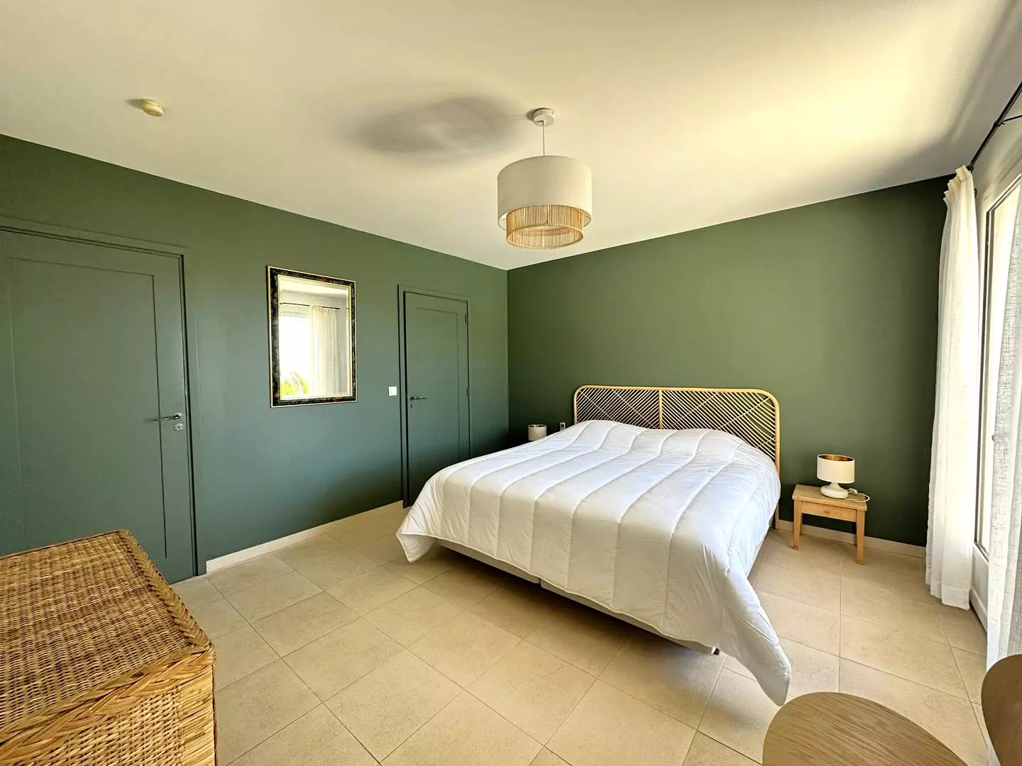 The house is accessed by a car ramp, at your disposal a double garage, on the same level, there is an entrance hall, a bedroom with 2 twin beds (90*200 cm) and a staircase serving the garden level: a beautiful, very bright living space with a living room of approximately 36 m², in its extension a dining room and the open fitted kitchen; all opening onto the terraces and the swimming pool. A master suite with a double bed (2 twin beds 90*200) a magnificent bathroom (shower + bathtub and WC) and a dressing room, two other bedrooms with double beds (twin beds 90*200) share a shower room with WC and 1 separate WC.