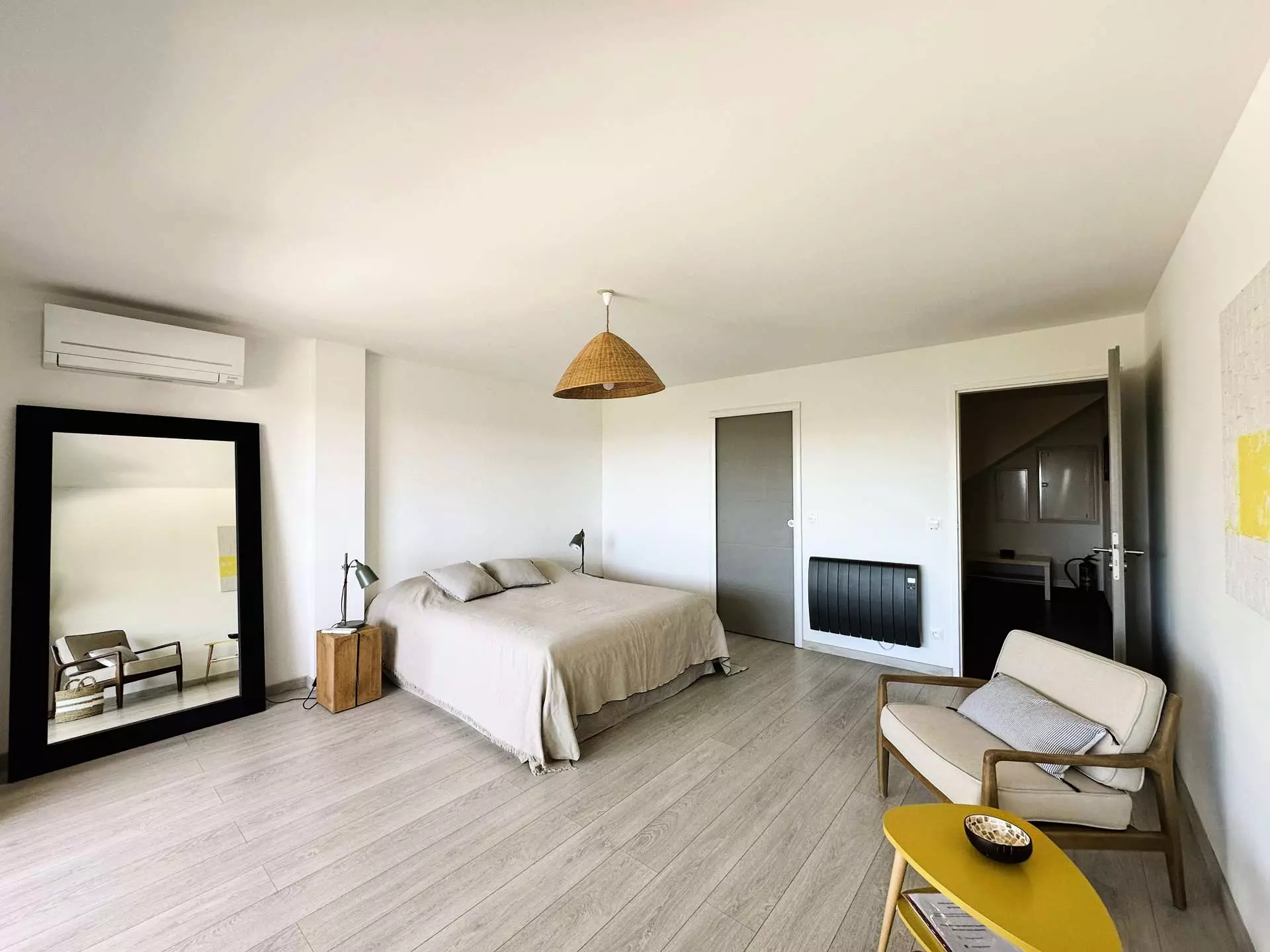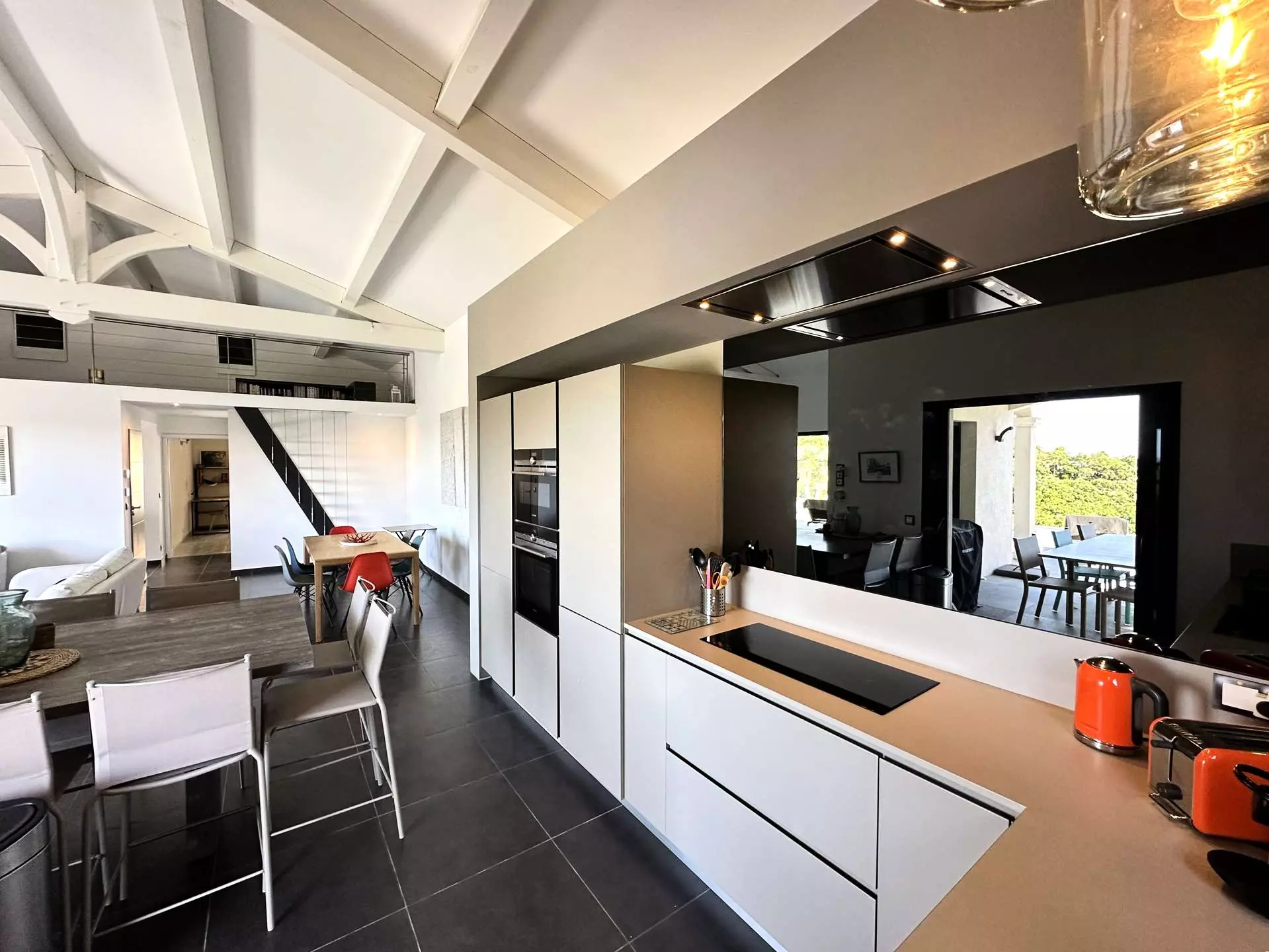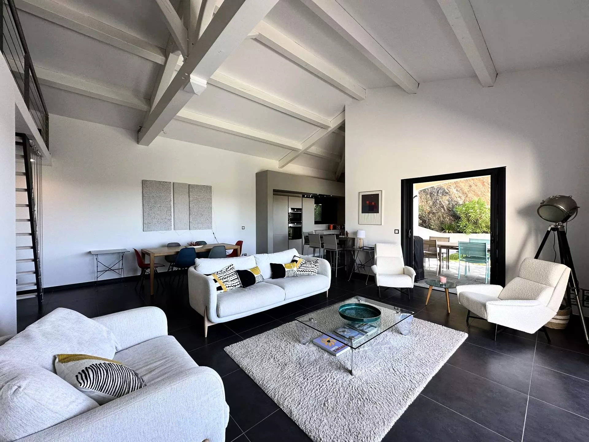 Level 1: Living-dining room of 50 m² with mezzanine, an American kitchen opening onto a covered outdoor dining room facing the sea 3 bedrooms: one bedroom with 2 twin beds (2x 80*200) with shower room opening onto private terrace, two bedrooms with 1 Queensize bed (160*200) opening onto terrace with sea view, a TV room, a bathroom, 3 toilets.