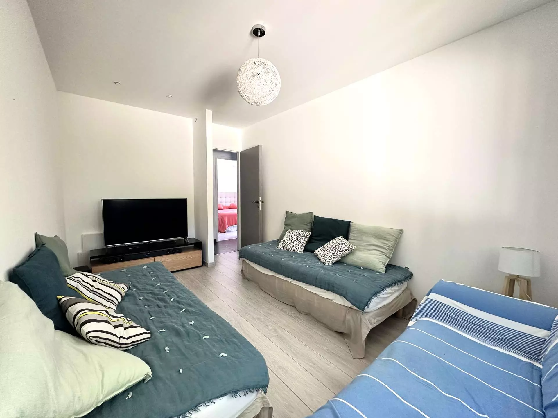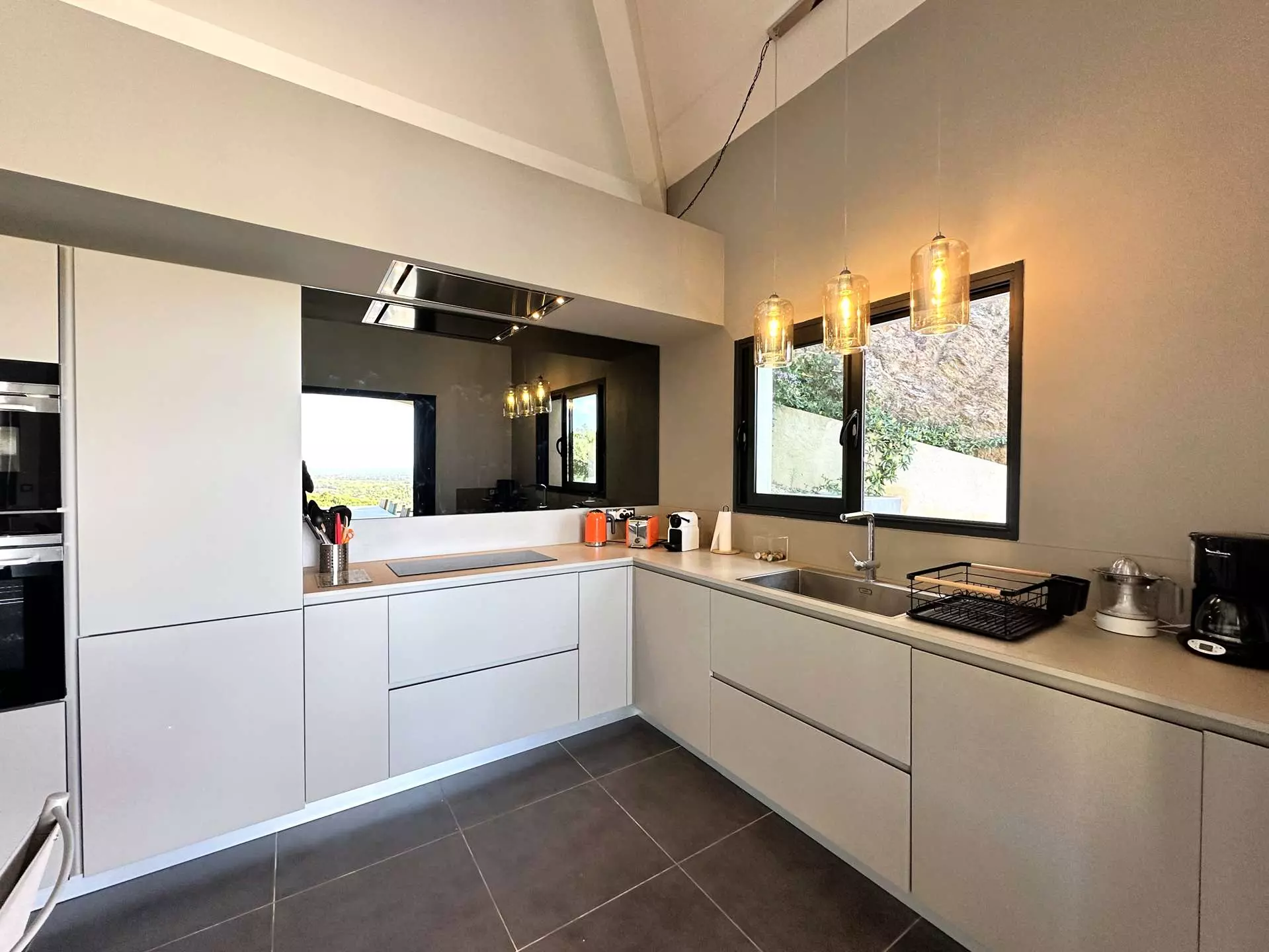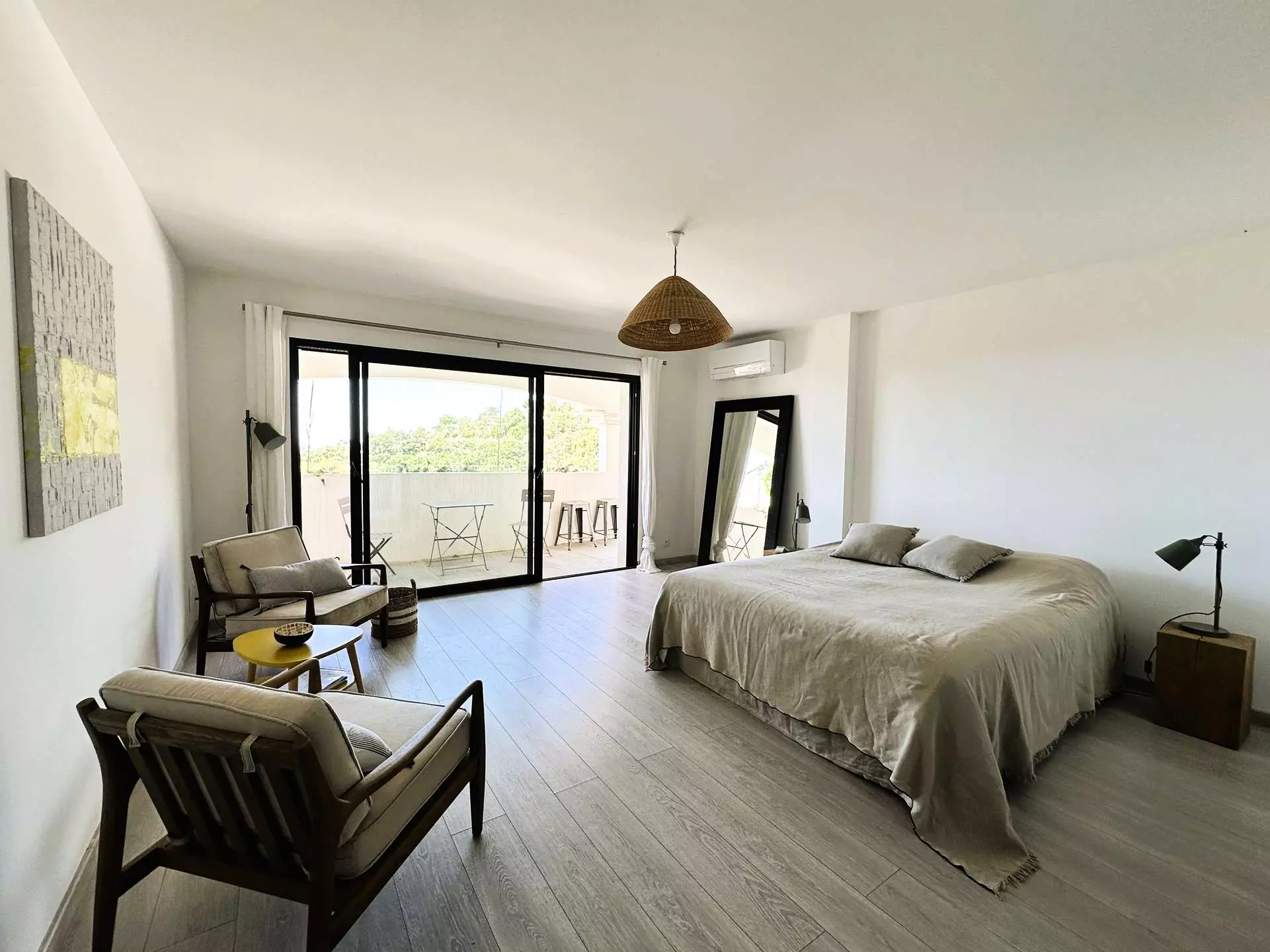 Level 1: Living-dining room of 50 m² with mezzanine, an American kitchen opening onto a covered outdoor dining room facing the sea 3 bedrooms: one bedroom with 2 twin beds (2x 80*200) with shower room opening onto private terrace, two bedrooms with 1 Queensize bed (160*200) opening onto terrace with sea view, a TV room, a bathroom, 3 toilets.