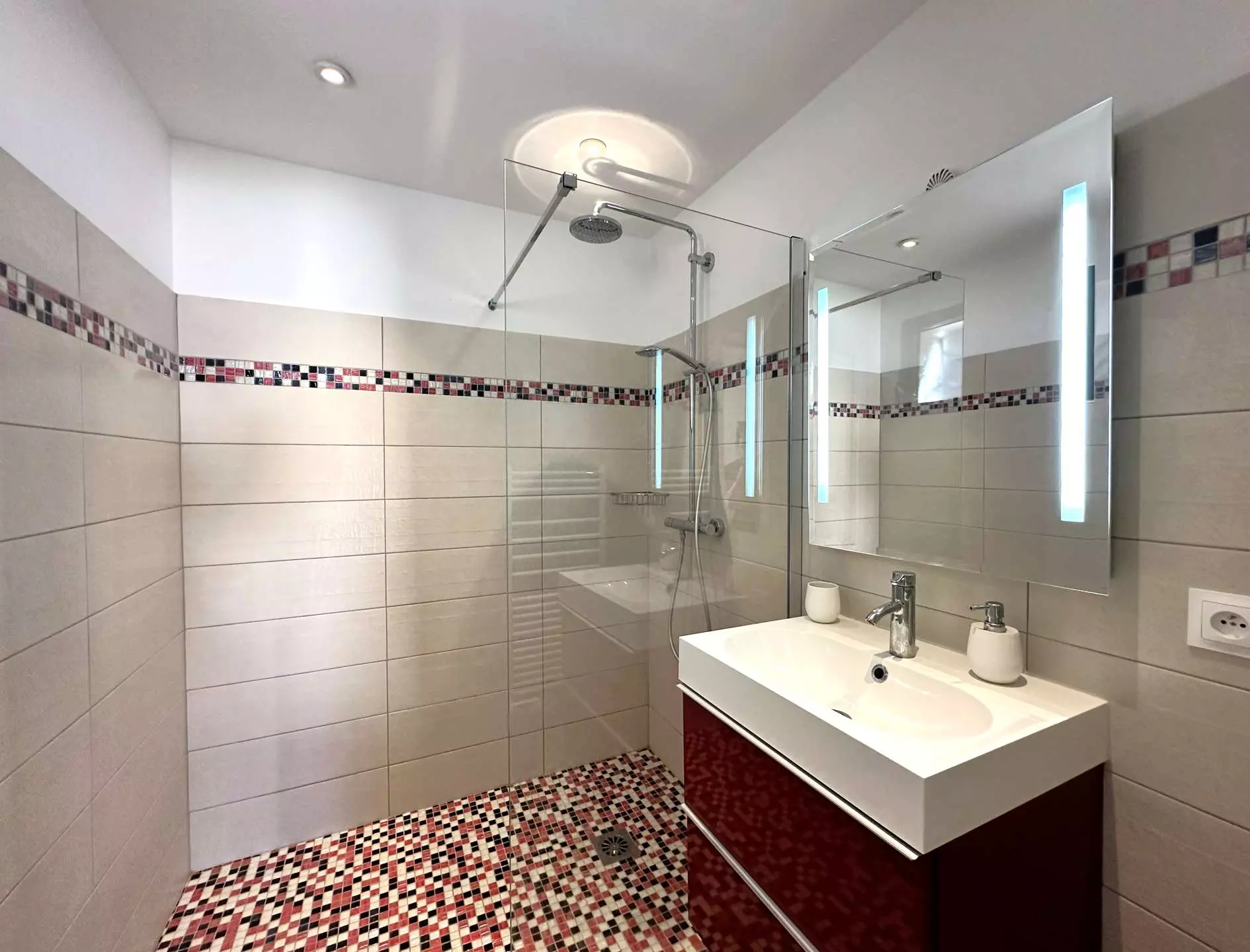 Lower level: a master bedroom with 1 queen-size bed (160*200), en-suite shower room and toilet opening onto a private terrace. a laundry room.