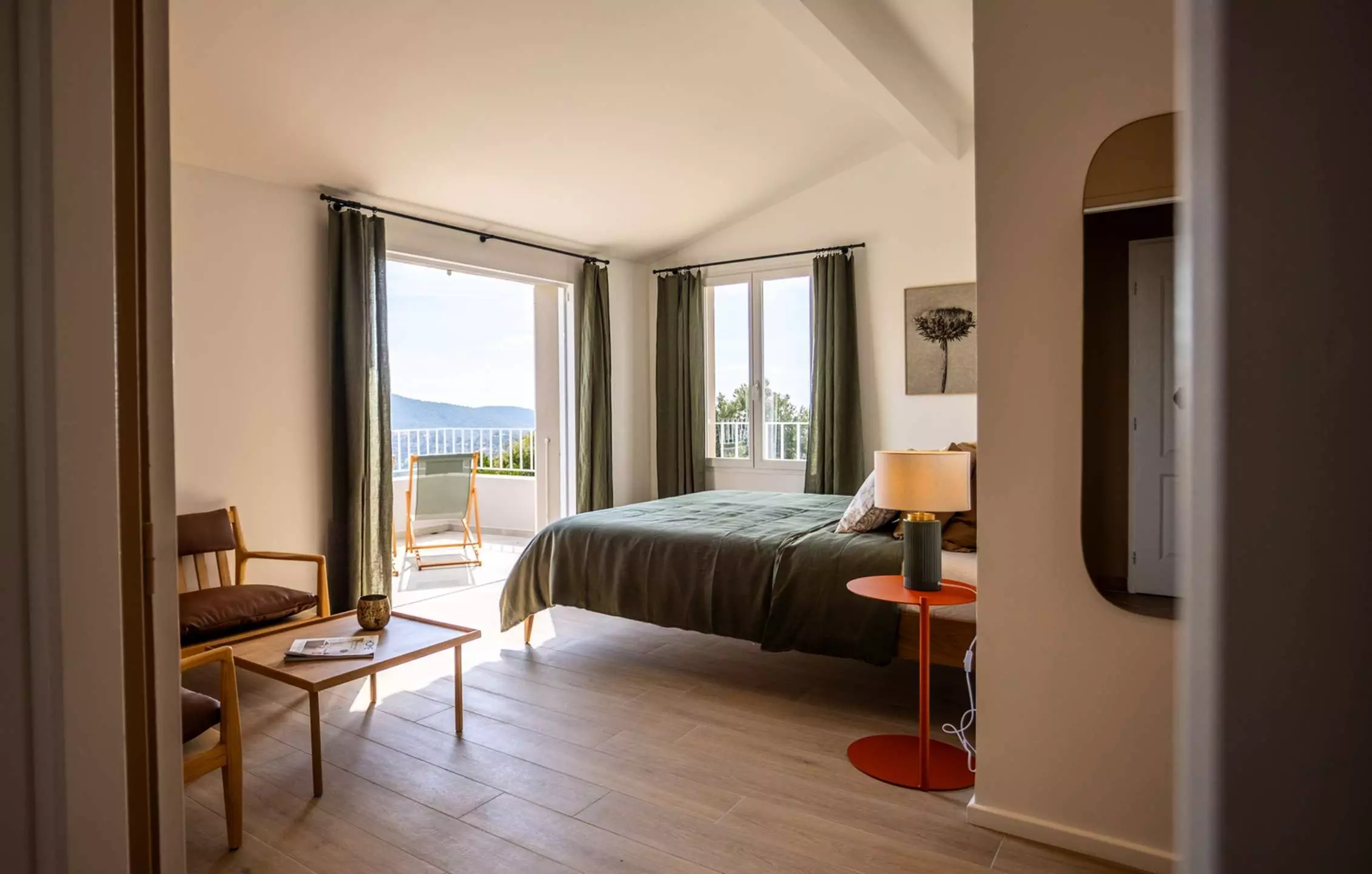 Upstairs, a double bedroom en suite with a 180x200 cm bed, a shower room, a double bedroom with a 180x200 cm bed with a bathroom, all with direct access to a large terrace with sea and hill views.