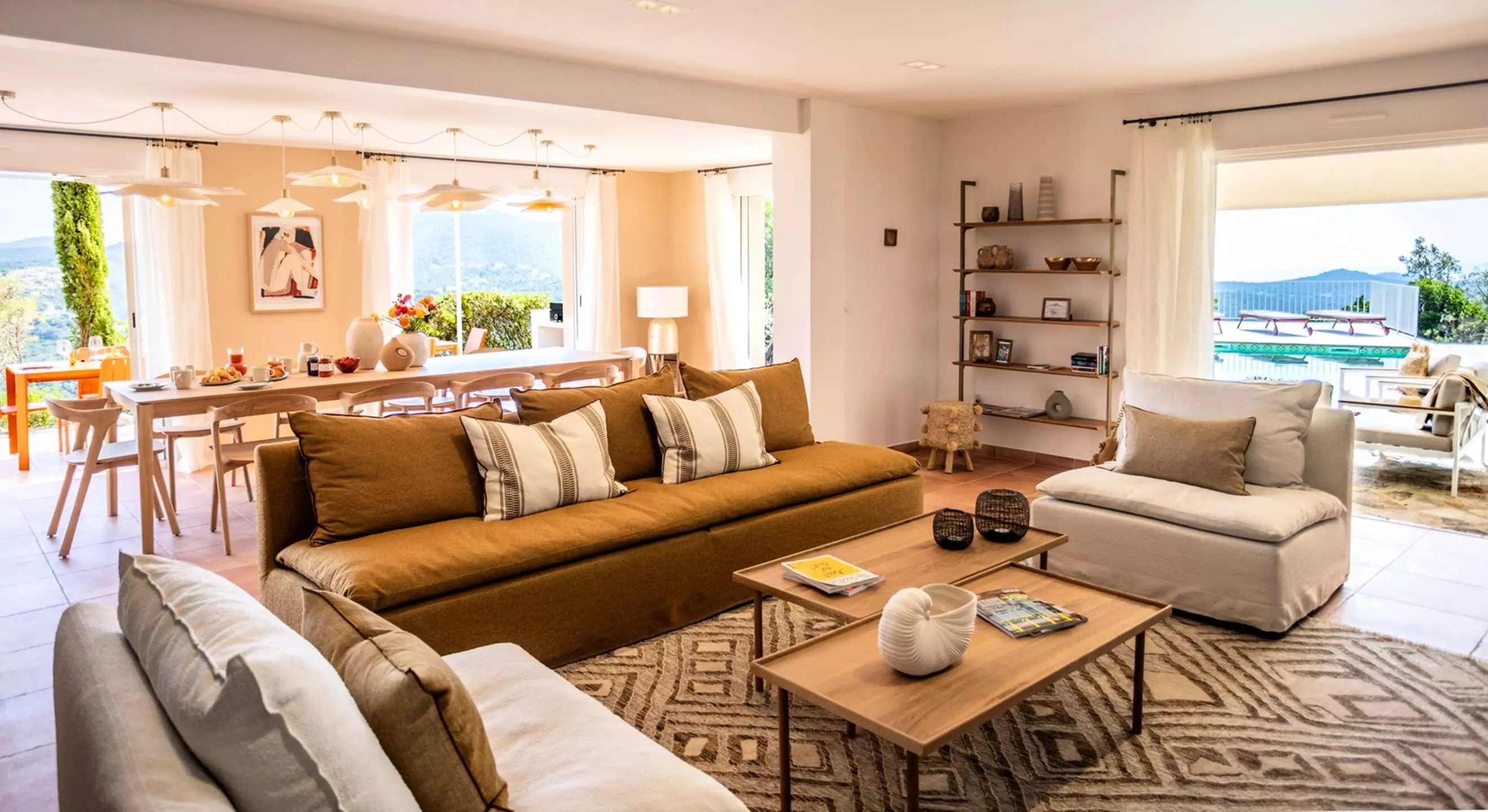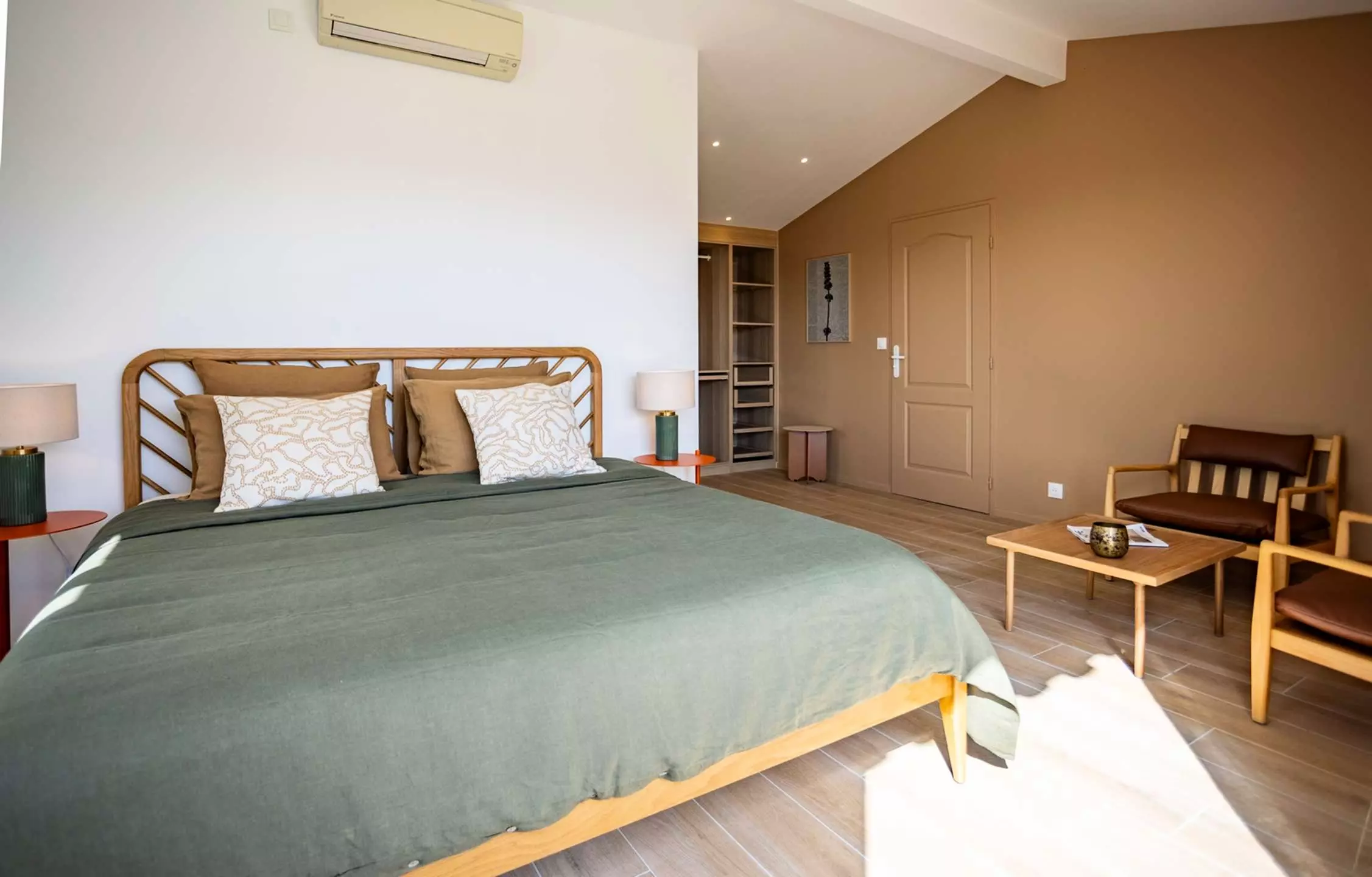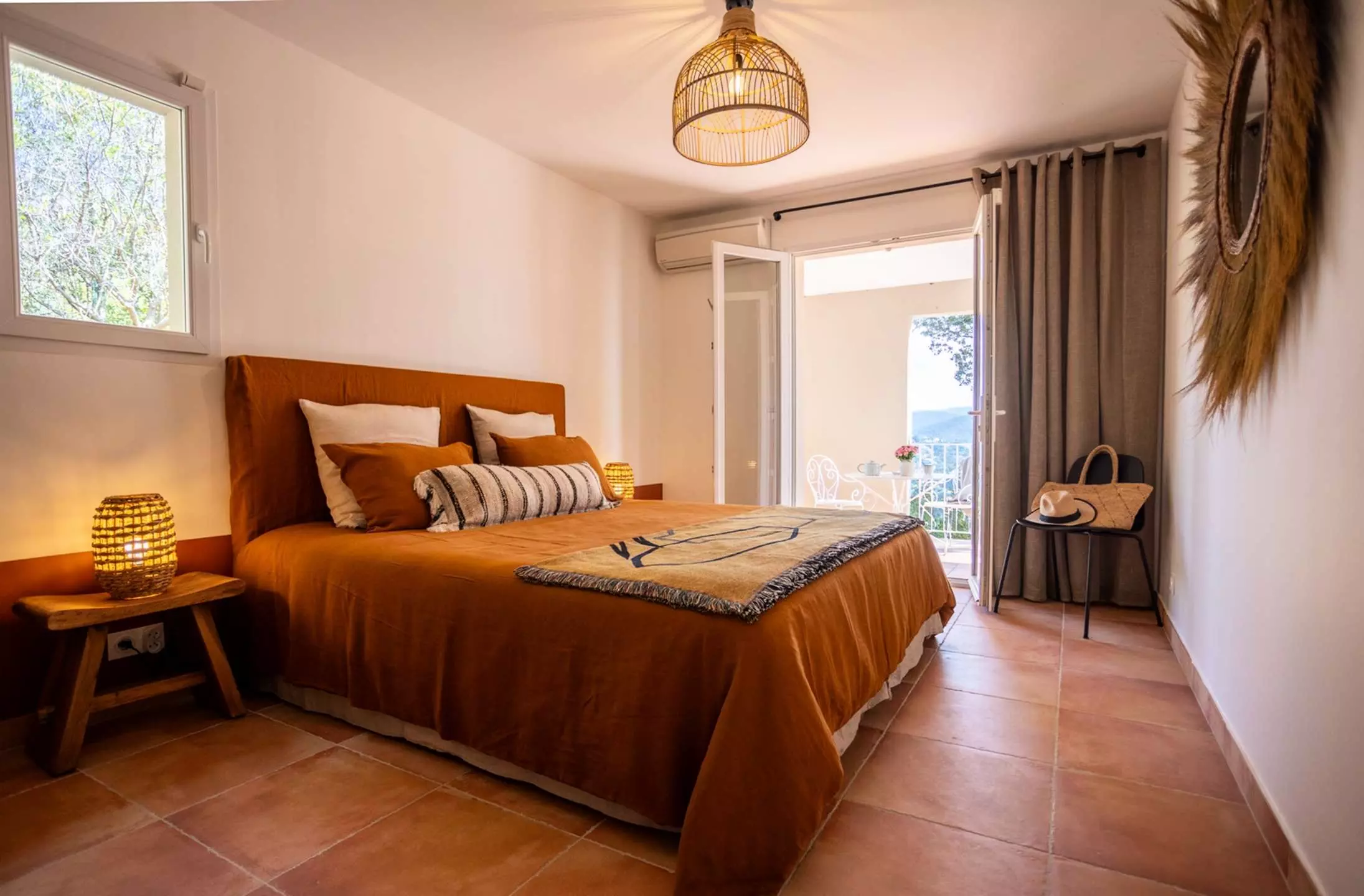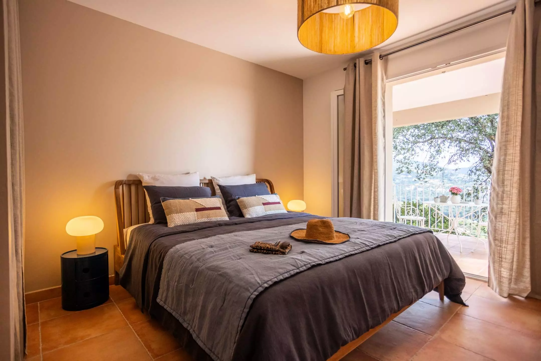 This fully air-conditioned villa is composed of a large living/dining room, an equipped and open kitchen (electric oven, double combined refrigerator, microwave, kettle toaster, filter coffee maker, Nespresso, laundry room with dishwasher, induction hob...) all opening onto two large furnished terraces with a beautiful view of the swimming pool, the hills and the sea.