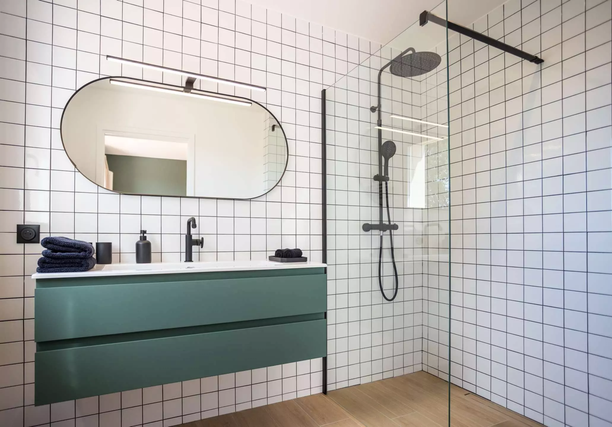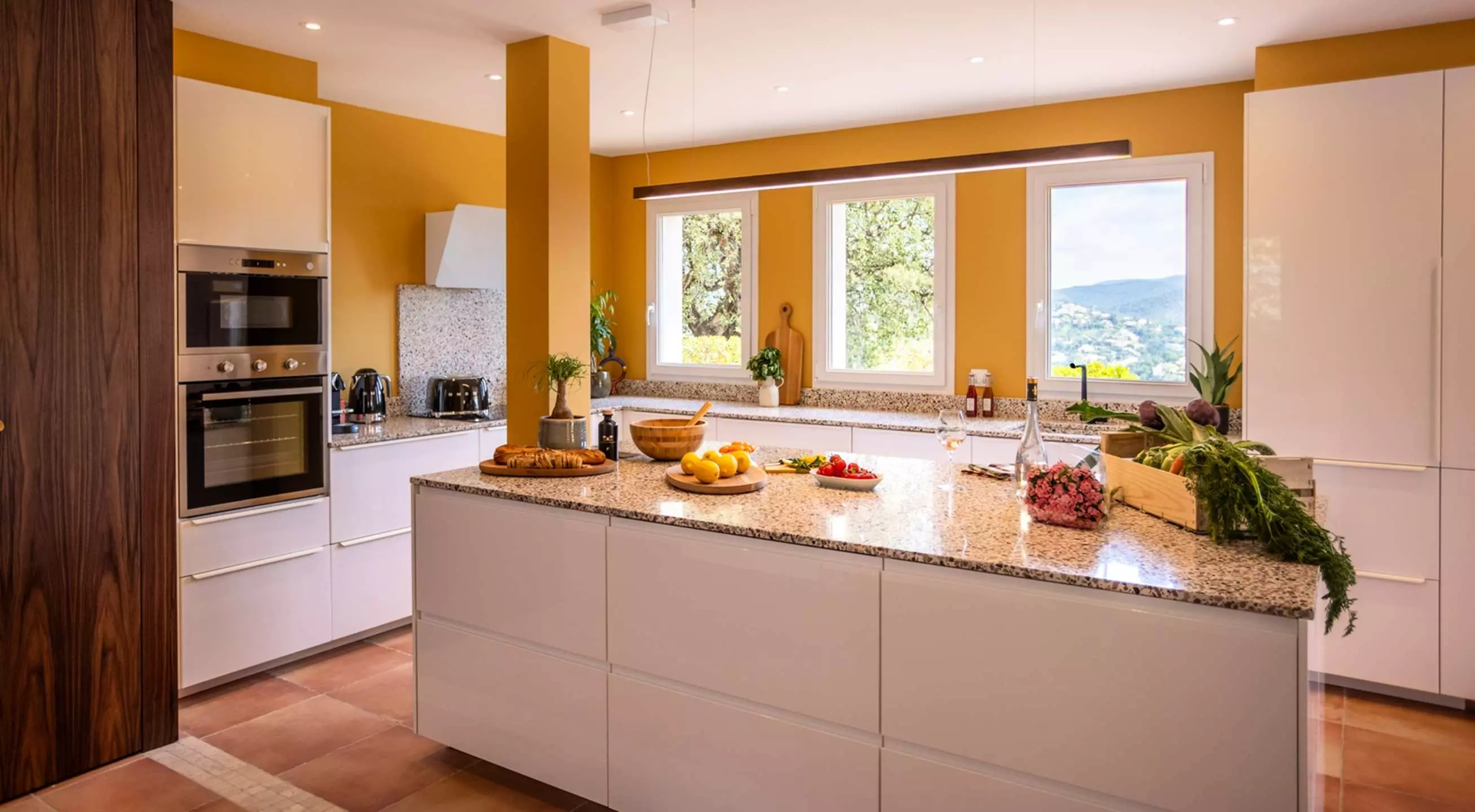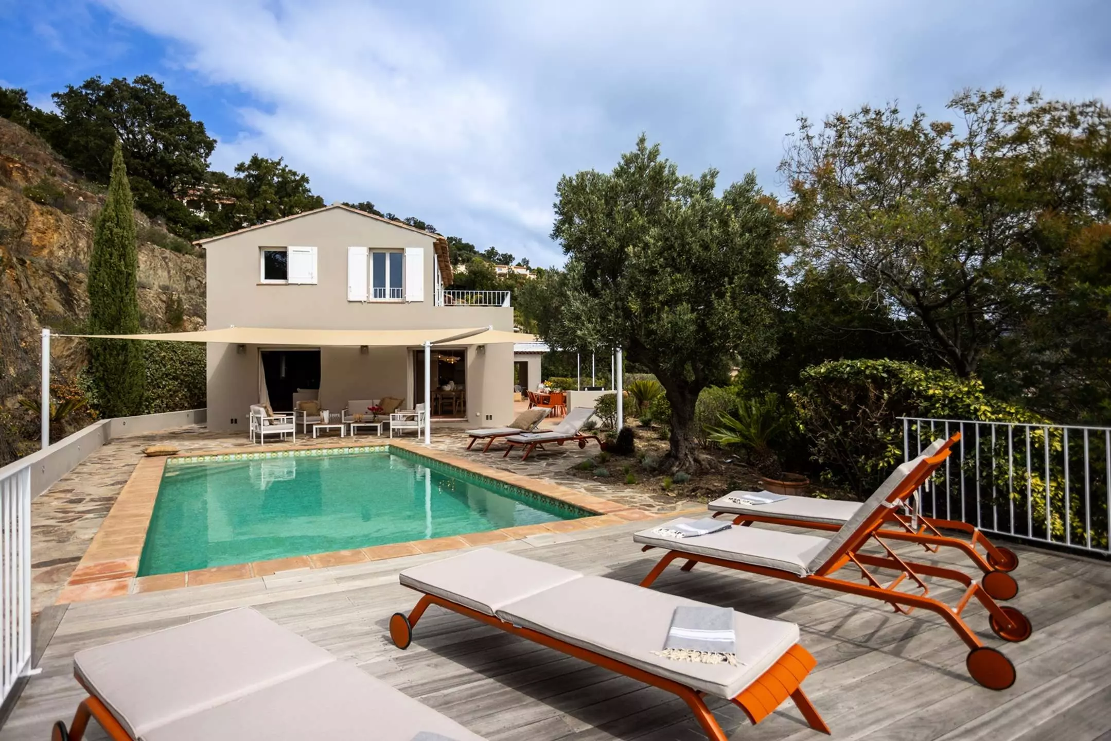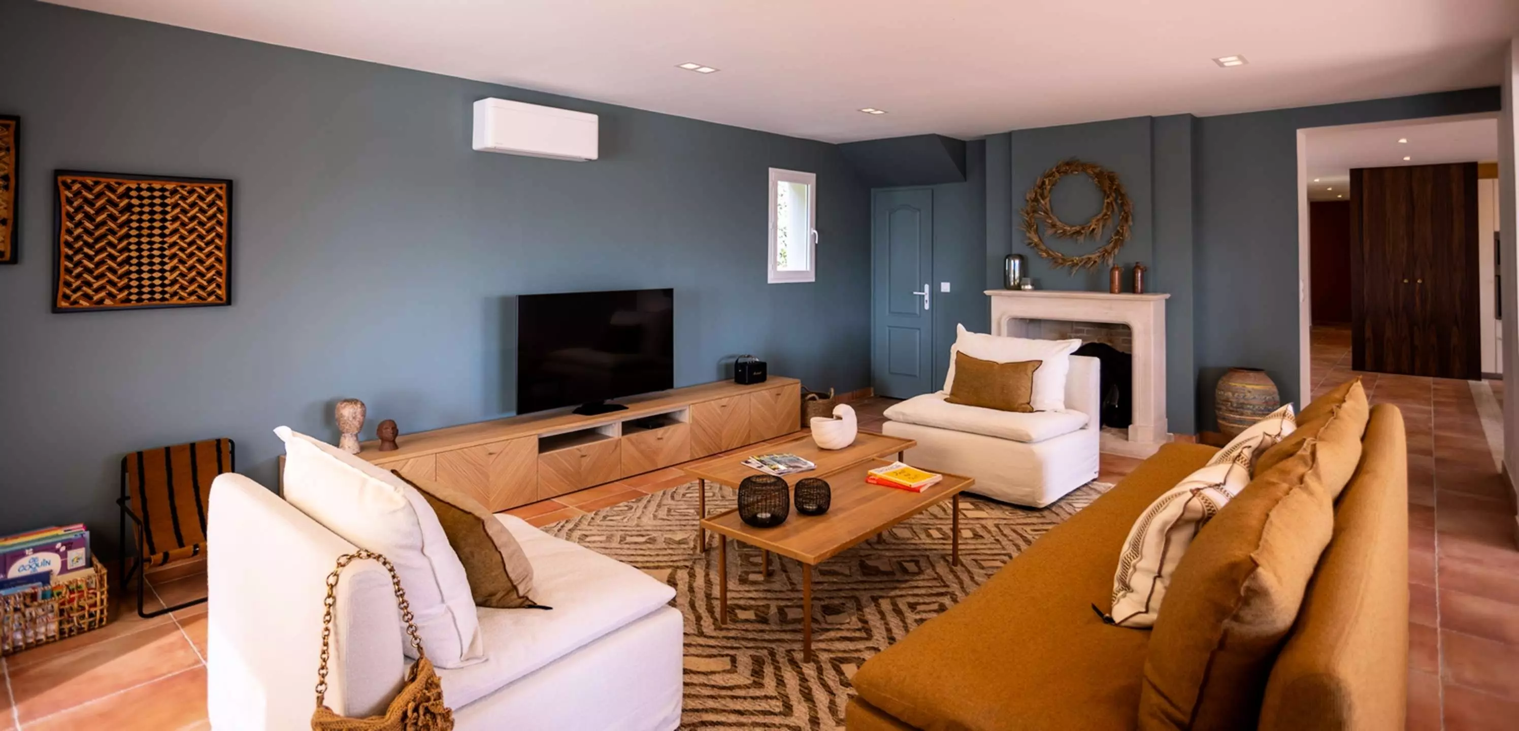 This fully air-conditioned villa is composed of a large living/dining room, an equipped and open kitchen (electric oven, double combined refrigerator, microwave, kettle toaster, filter coffee maker, Nespresso, laundry room with dishwasher, induction hob...) all opening onto two large furnished terraces with a beautiful view of the swimming pool, the hills and the sea.