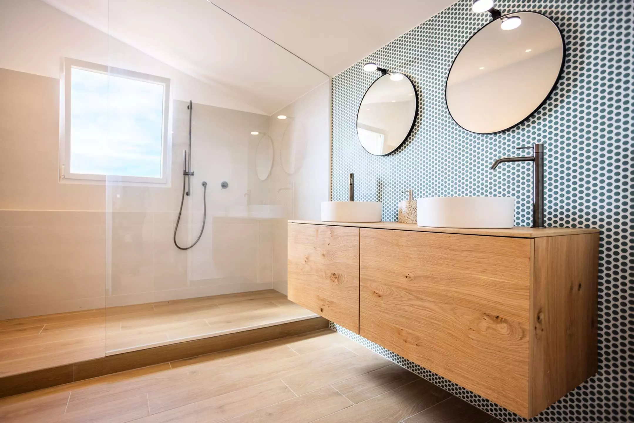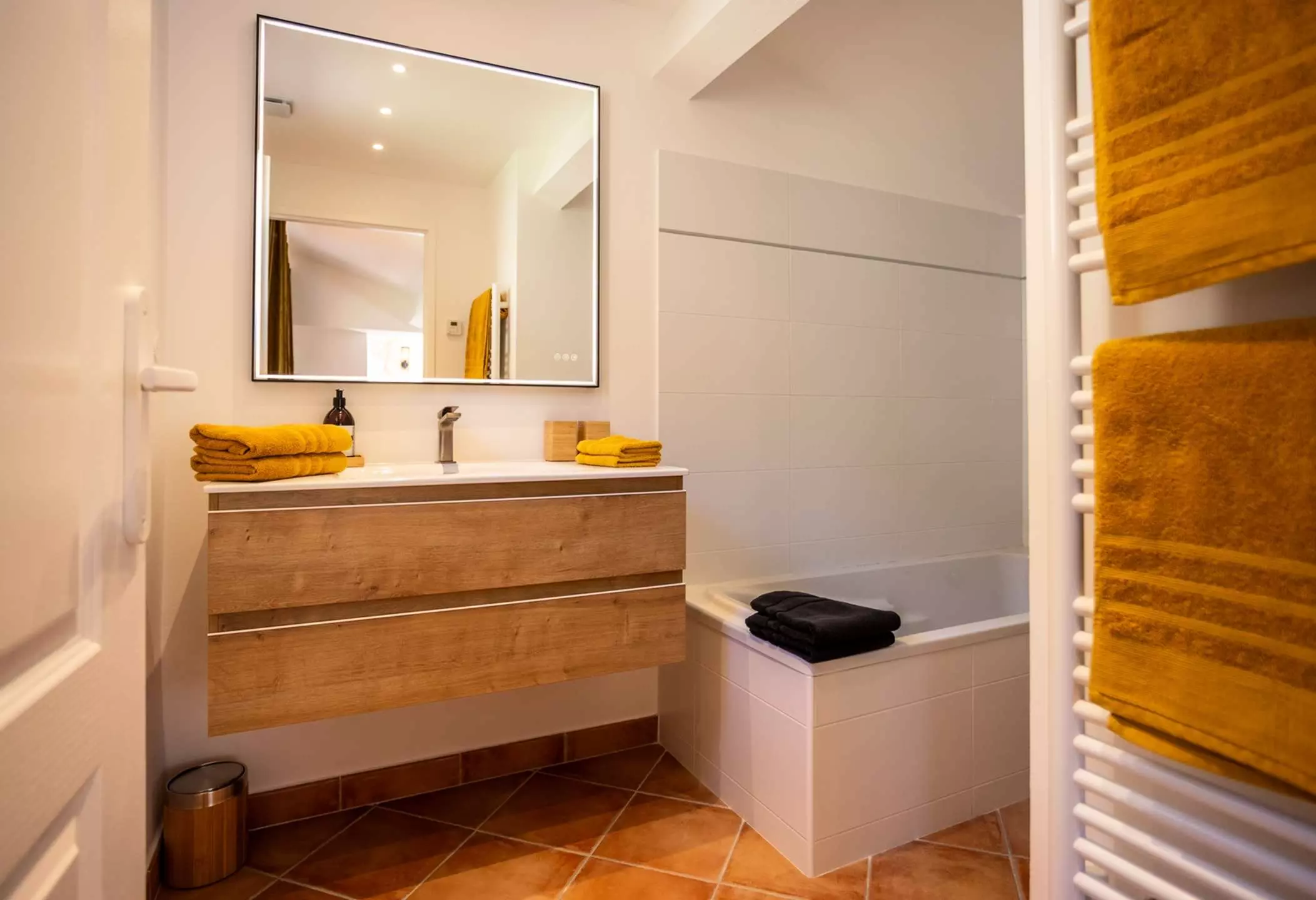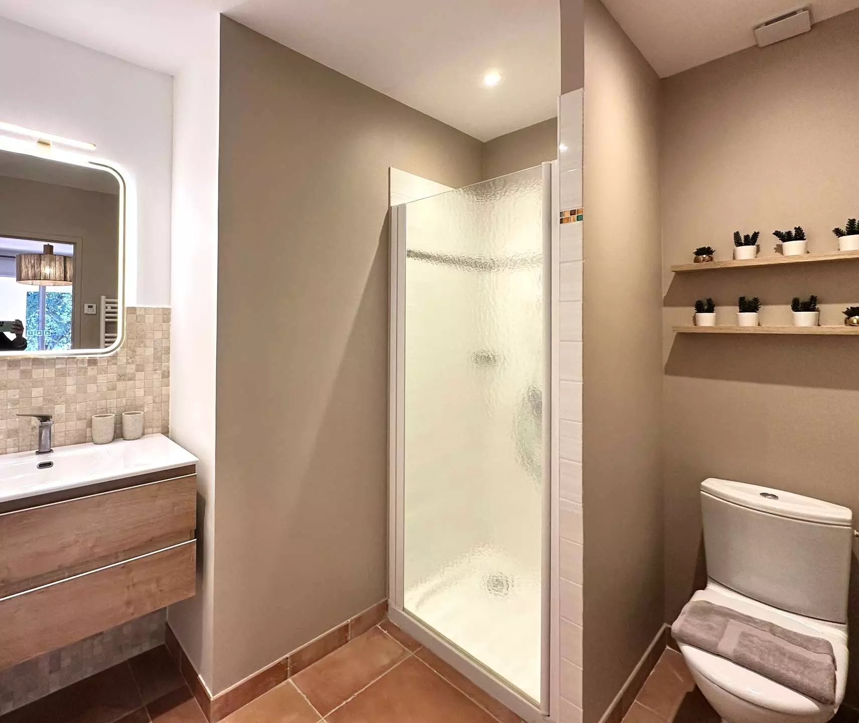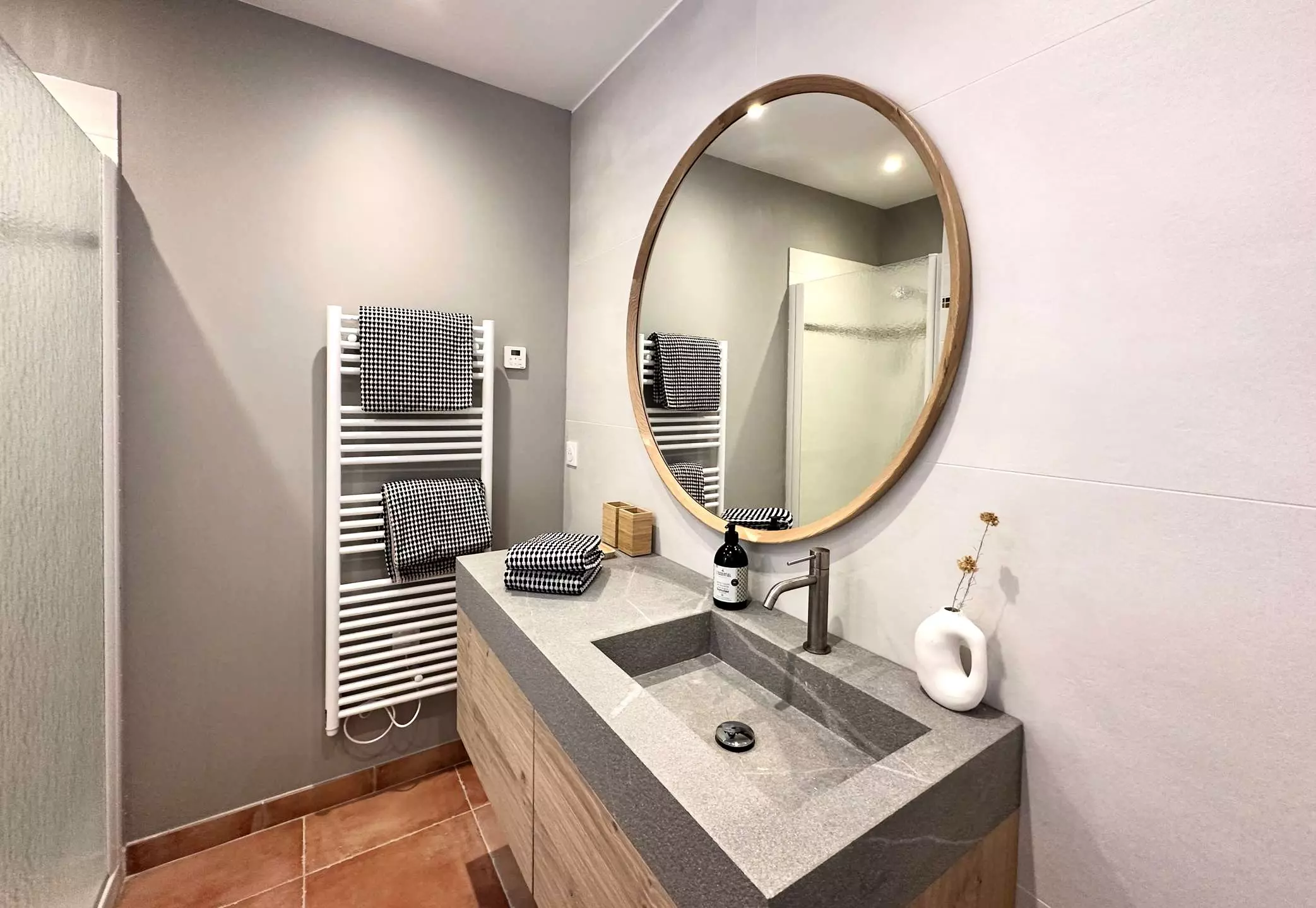 This fully air-conditioned villa is composed of a large living/dining room, an equipped and open kitchen (electric oven, double combined refrigerator, microwave, kettle toaster, filter coffee maker, Nespresso, laundry room with dishwasher, induction hob...) all opening onto two large furnished terraces with a beautiful view of the swimming pool, the hills and the sea.
