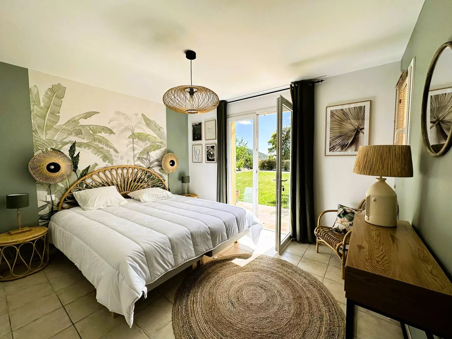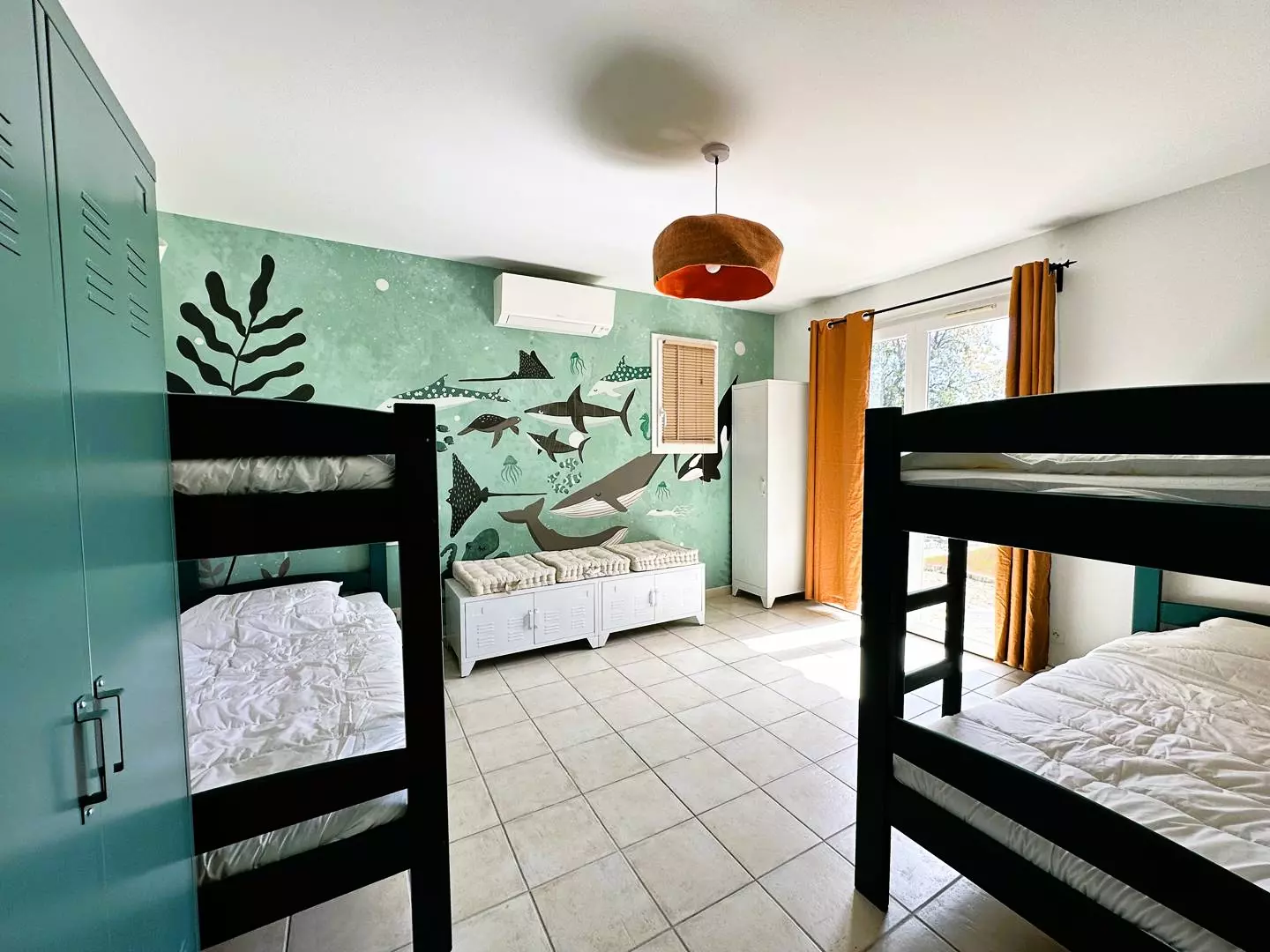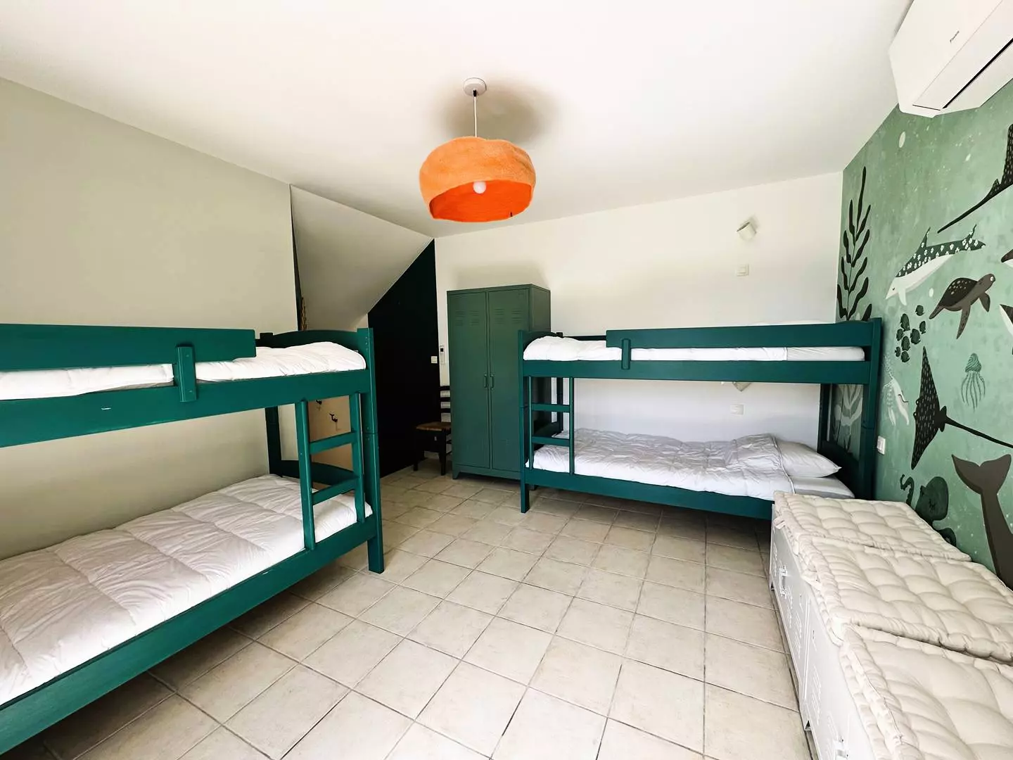 An independent air-conditioned bedroom, offering 4 single bunk beds (90*190), a bathroom with toilet and direct access to the garden, the terrace and the swimming pool, sea view.