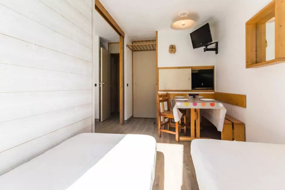 This fully renovated studio in the center of the resort with a view of the Place des Carreaux facing south consists of an equipped kitchenette (electric hob, microwave, dishwasher, kettle, coffee maker), a bathroom with bathtub and WC.