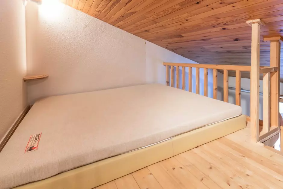 Upstairs, on the mezzanine, the sleeping area is equipped with two single beds.