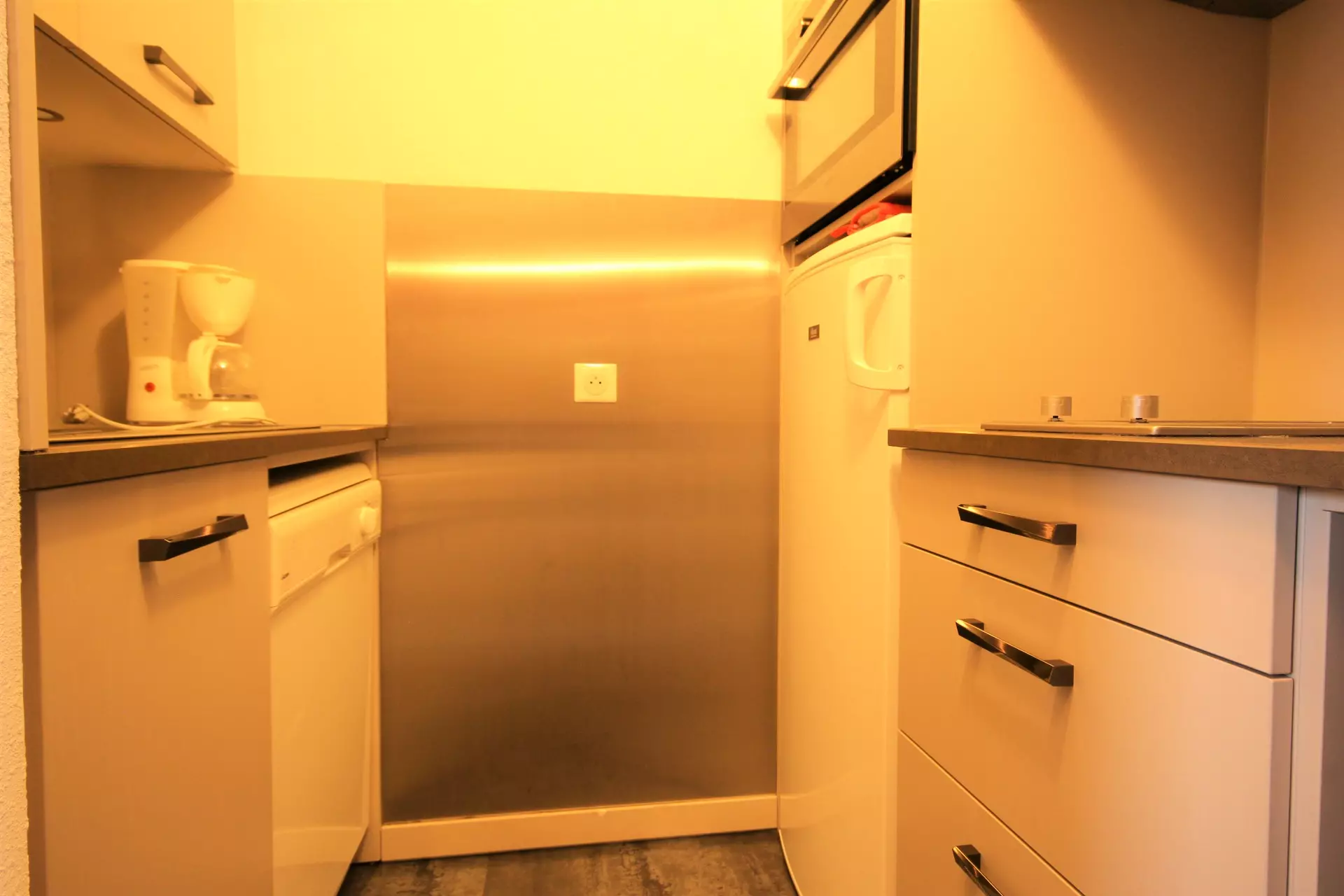 This studio in the center of the resort with a view of the Place des Carreaux facing south consists of an equipped kitchenette (ceramic hob, dishwasher, combination microwave oven, kettle, coffee maker), a bathroom with bathtub and WC.