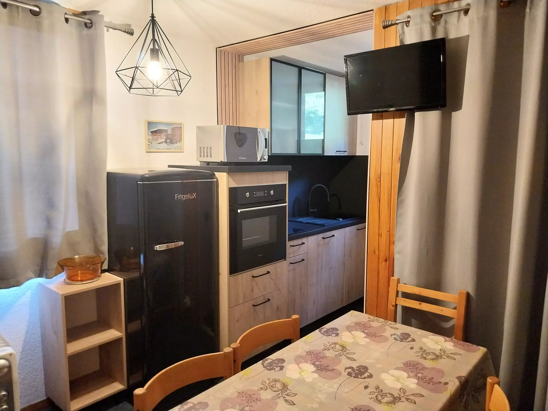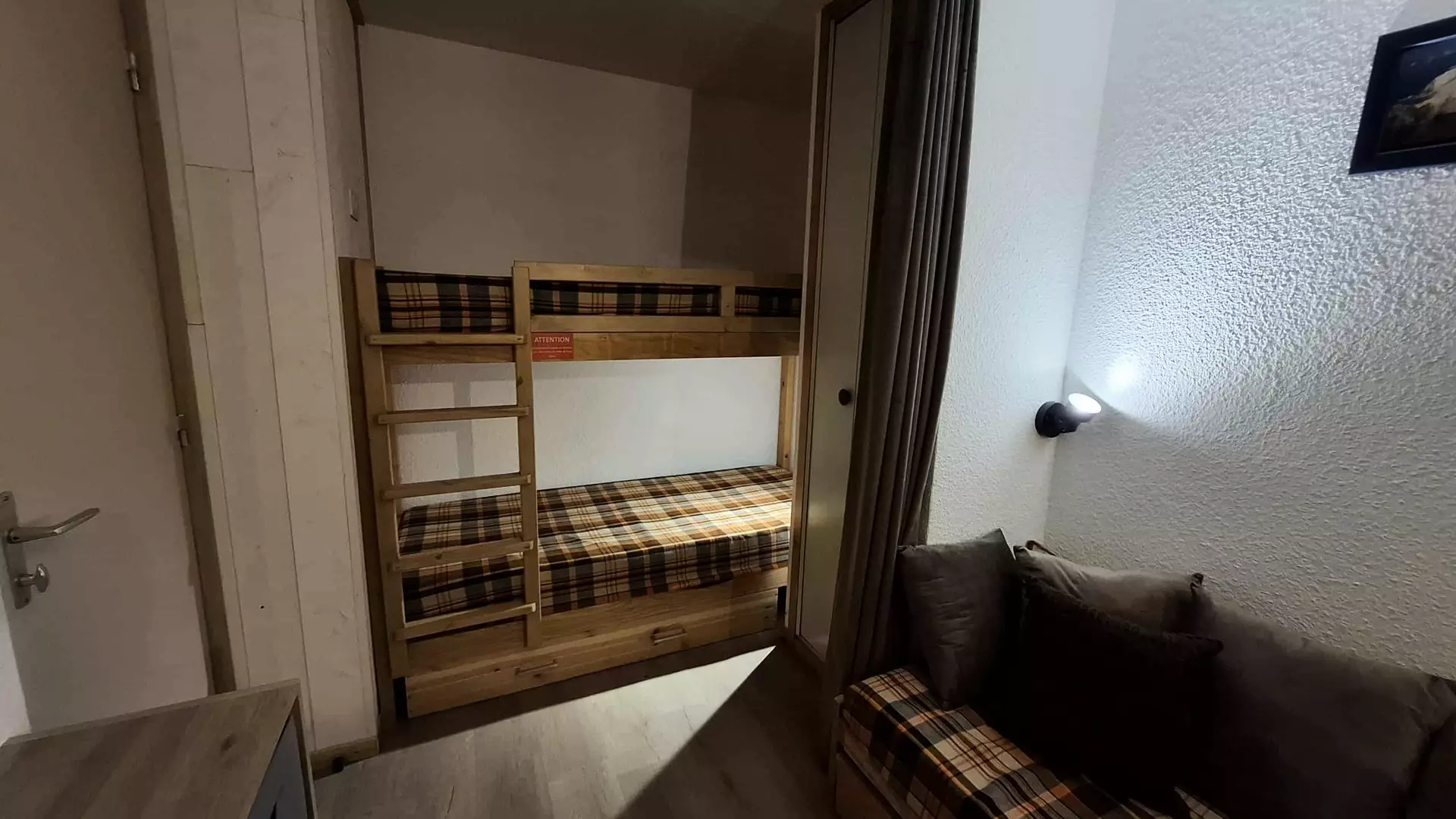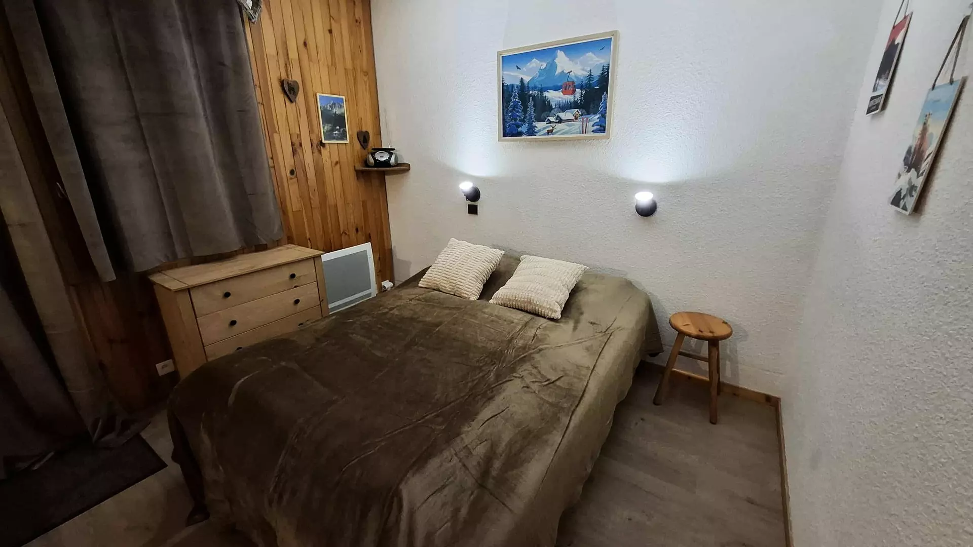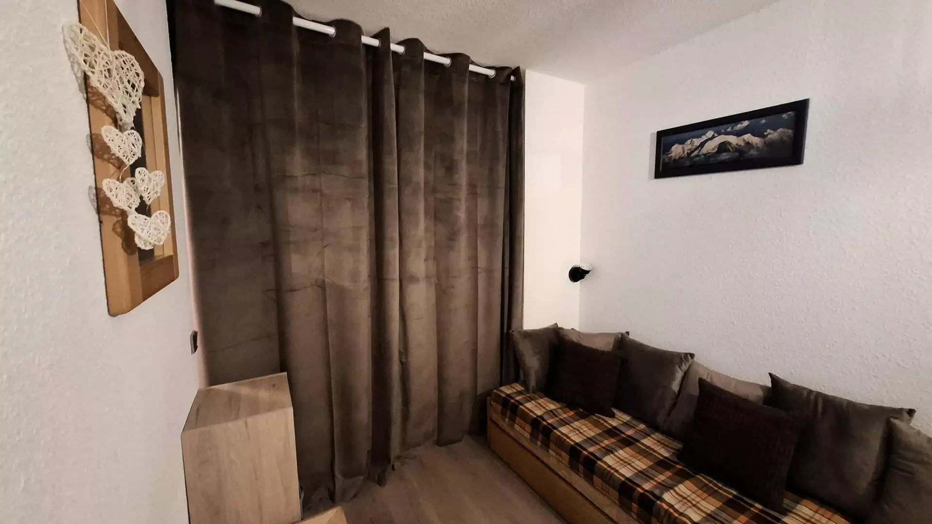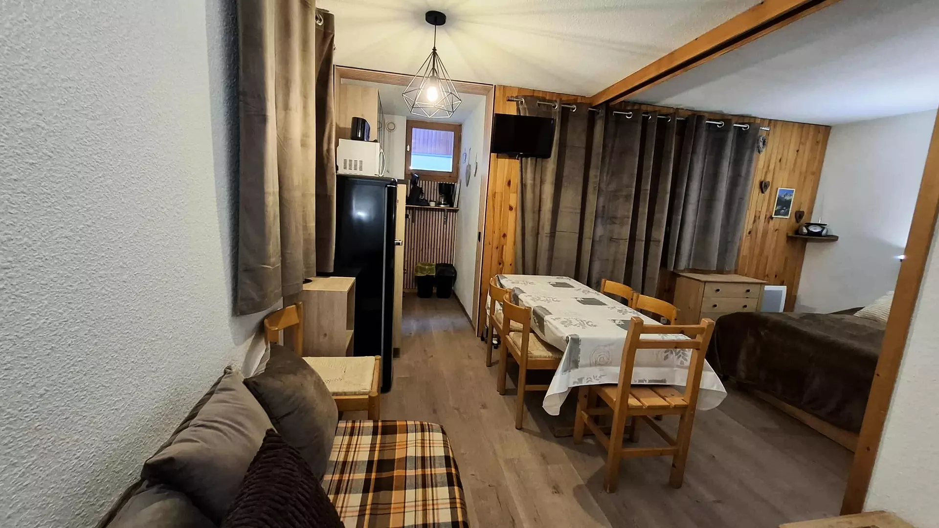 This divisible studio with south-facing terrace and close to the Montchavin cable car consists of an equipped kitchenette (electric hob, toaster, microwave, electric coffee maker, oven), a bathroom with bathtub and separate toilet.