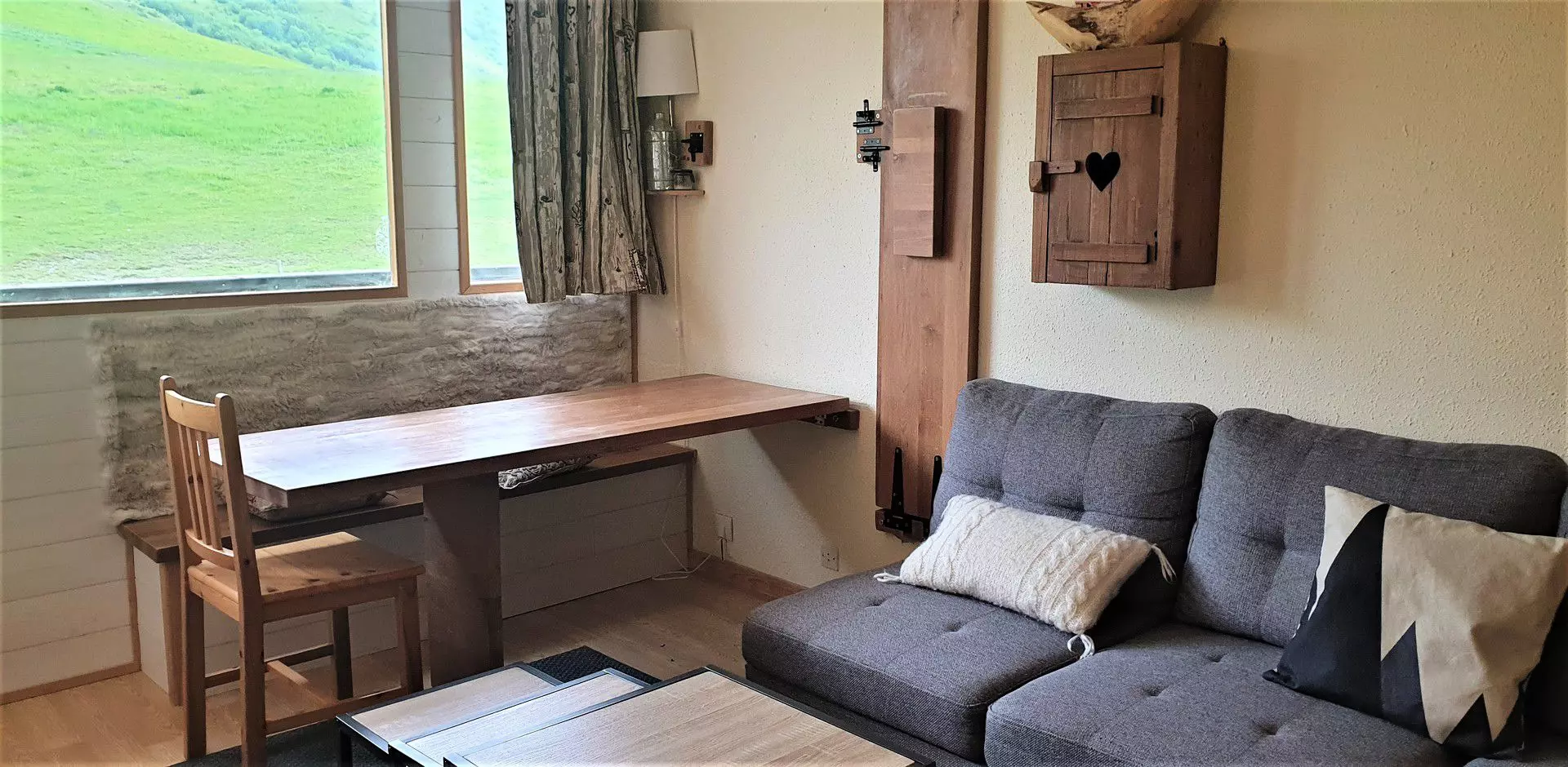 This studio is located on level "H" of the Paquebot des Neiges and is accessible by the "Zodiac" elevator. It consists of a living room, a separate kitchen, and a bathroom with WC. Its south-facing balcony offers a lovely view of the slopes.