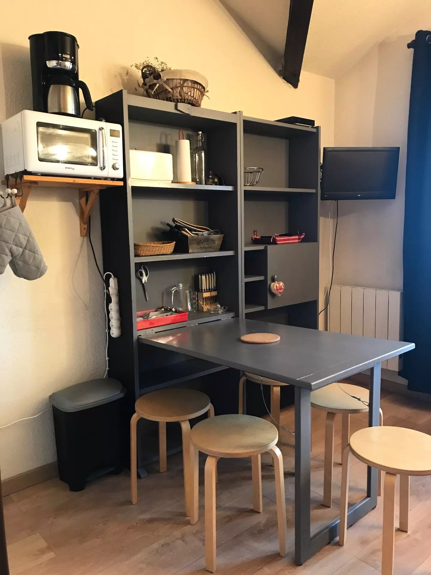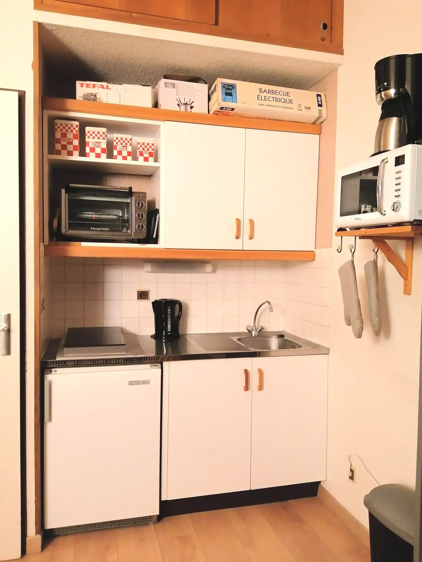 The kitchen area equipped with 2 electric hotplates, an oven, a microwave, a refrigerator, a kettle, a coffee maker is open to the living room with a shepherd's table, a sofa bed (160) and 1 TV.