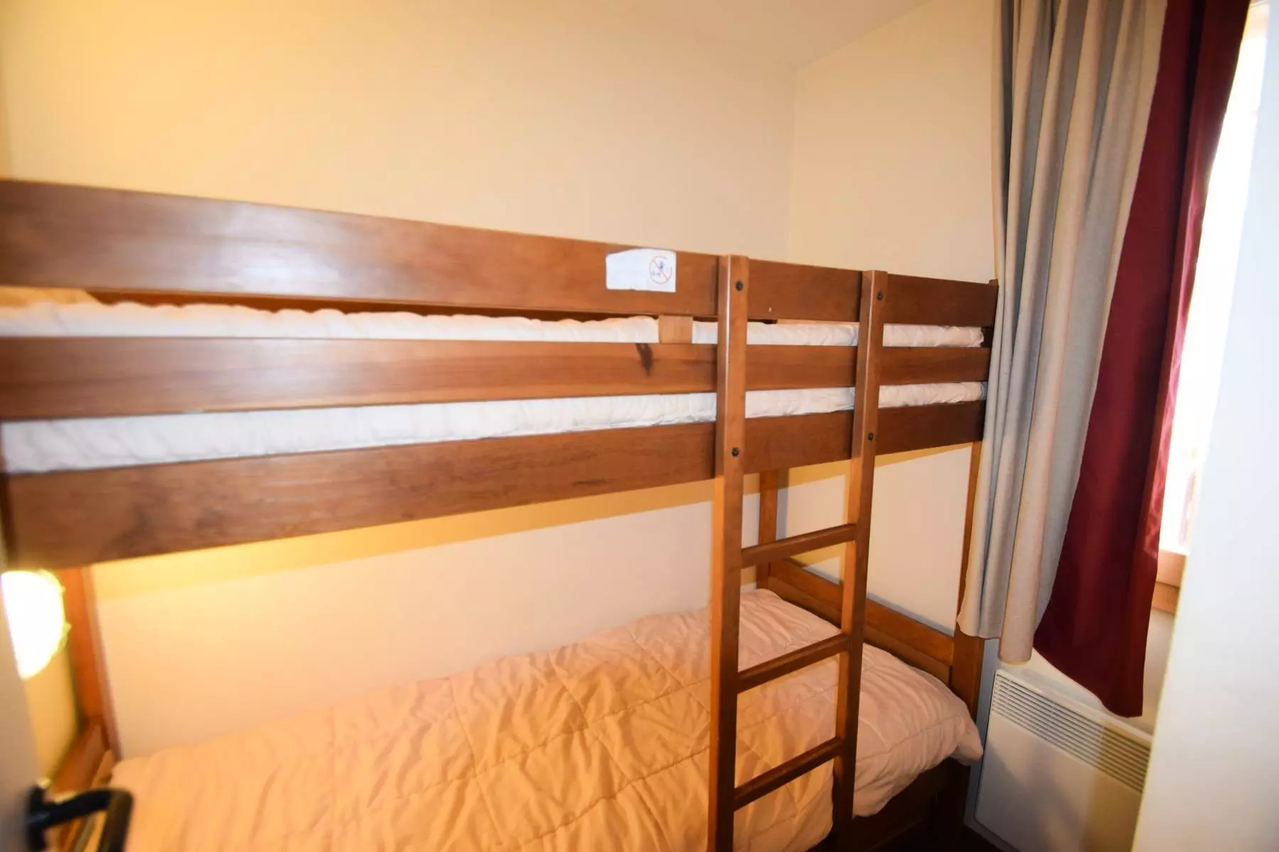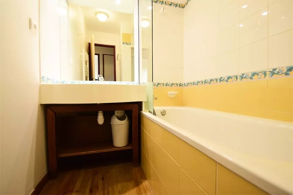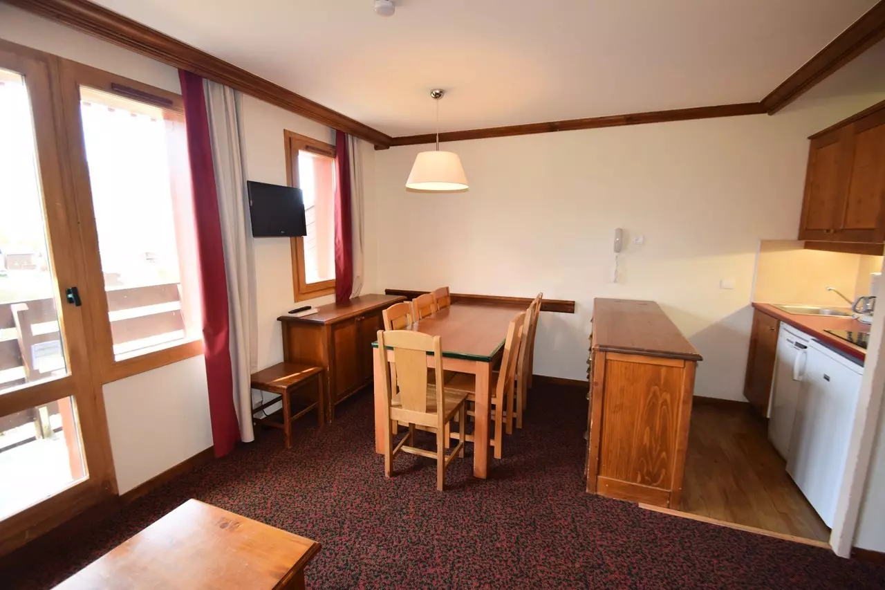 3-room apartment for 6 people, 42m2, south-facing with balcony located on the 2nd floor with elevator - Kitchen: in the living room: 4 ceramic hobs, refrigerator, microwave oven, dishwasher - Living room: dining area, 2 pull-out beds, TV - Bedroom 1: 1 double bed - Bedroom 2: 2 bunk beds - Bathroom: bathtub - Separate WC - Floors: carpet except kitchen, WC, bathroom: plastic - Bedding: duvets - Ski locker No. 213 at the slopes exit level - PETS NOT ALLOWED. Apartment located in the heart of the ski area - The Residence: AT THE FOOT OF THE SLOPES, close to shops and the ski school - Plagne Soleil is connected to Plagne Villages / Center by shuttle bus or cable car. End-of-stay cleaning, ski passes and sheets and towels are optional.