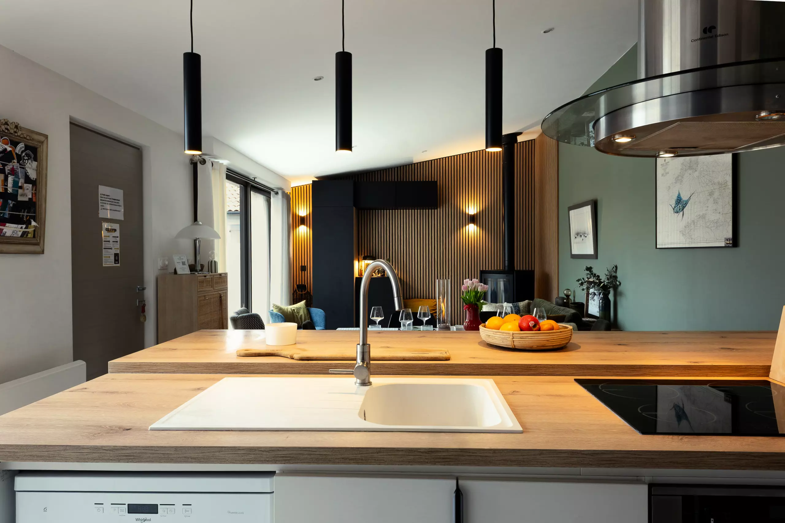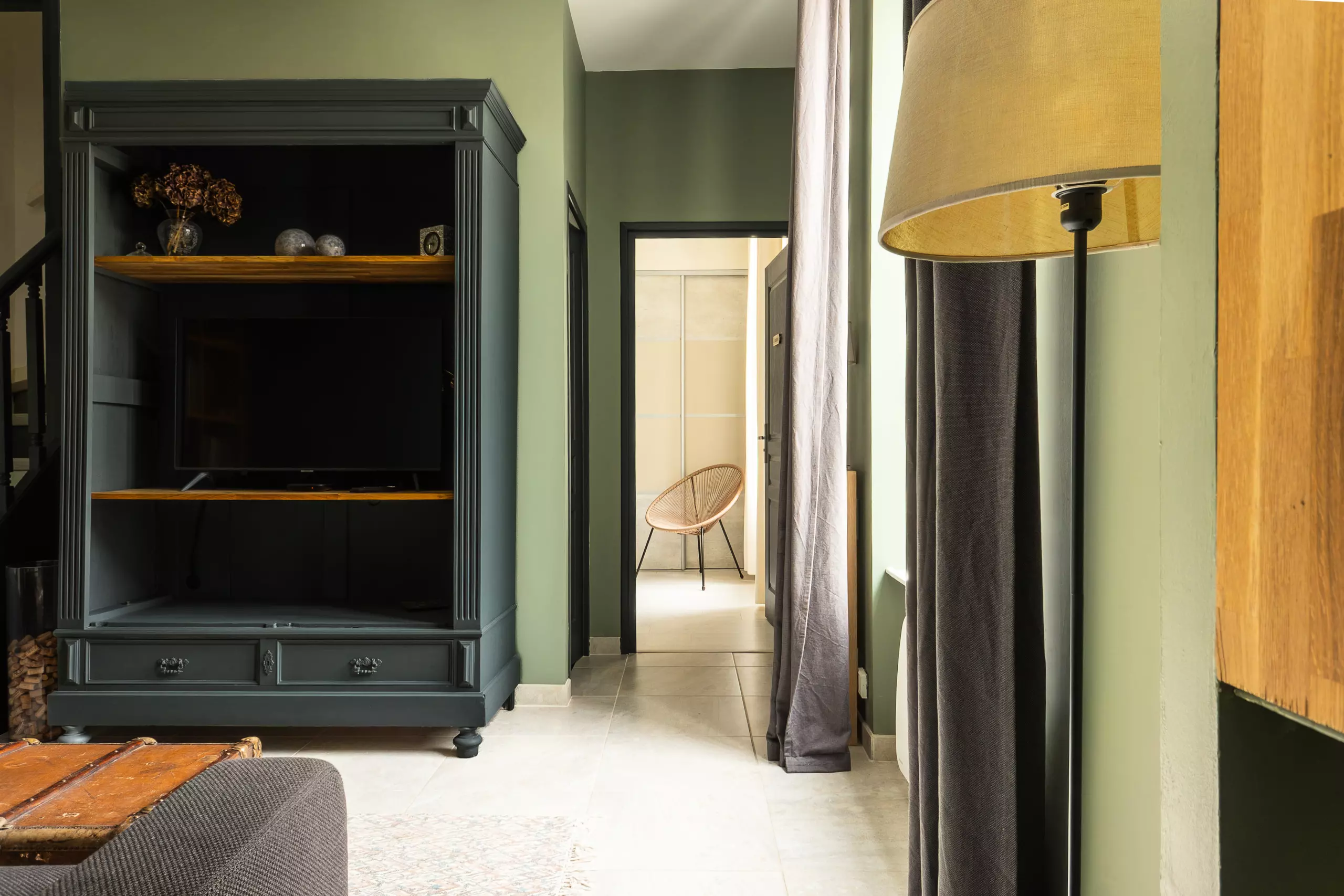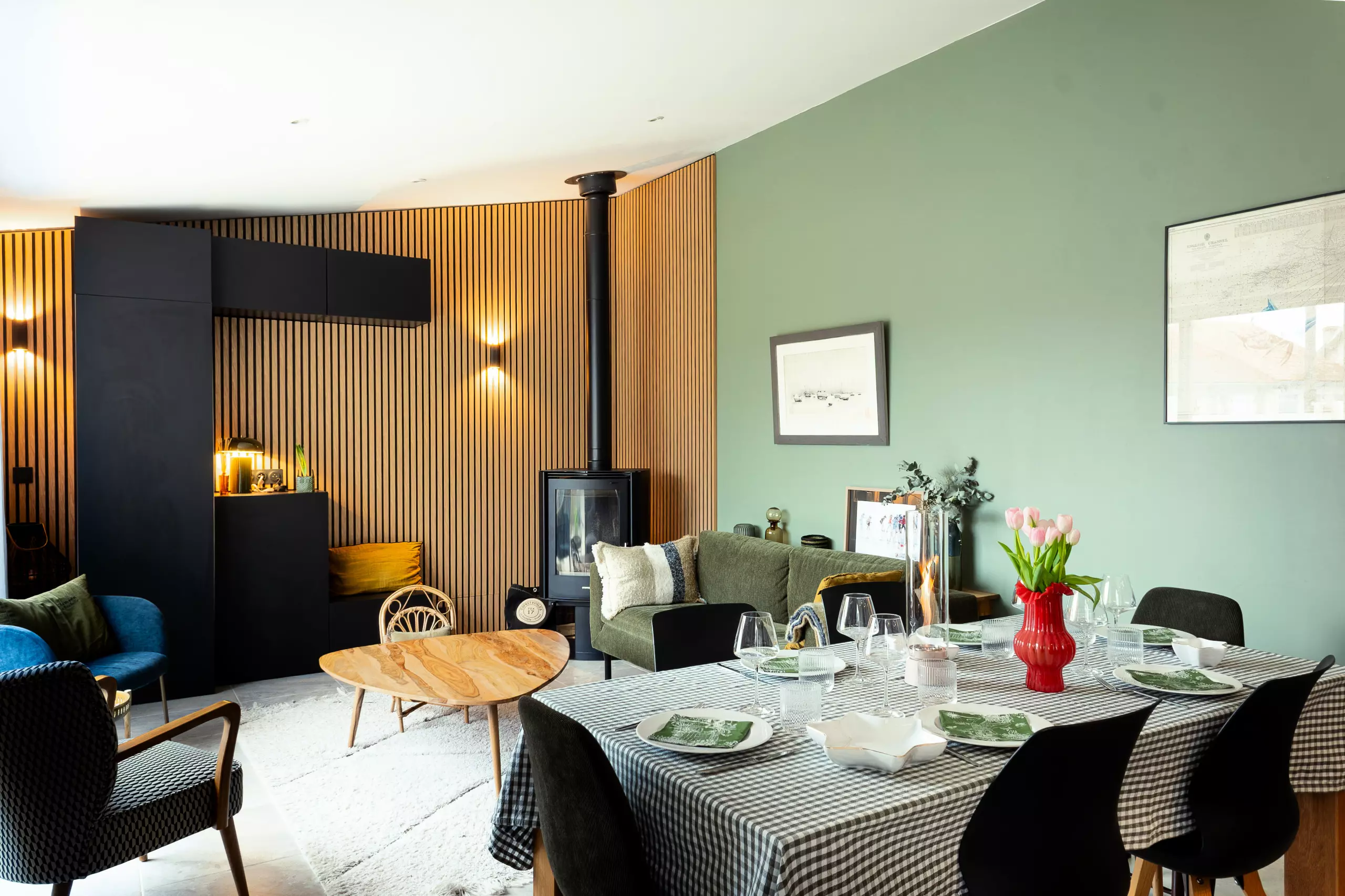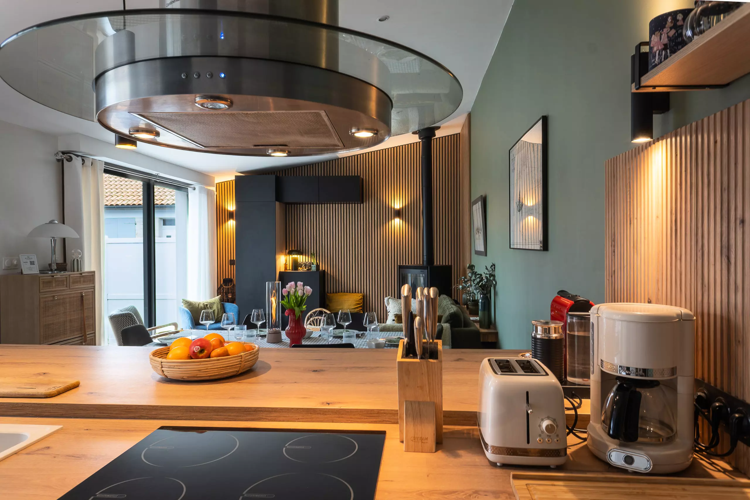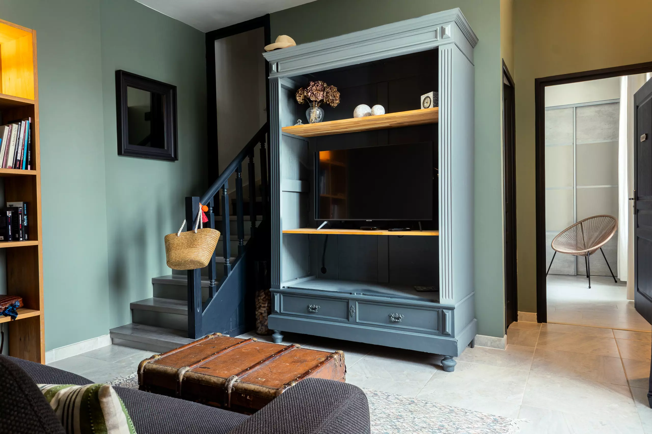 It has one bedroom on the ground floor and two others upstairs, a bathroom with a shower and a bathtub, a separate toilet, a living room equipped with a connected TV with WIFI, a dining room and a fully equipped open kitchen:
